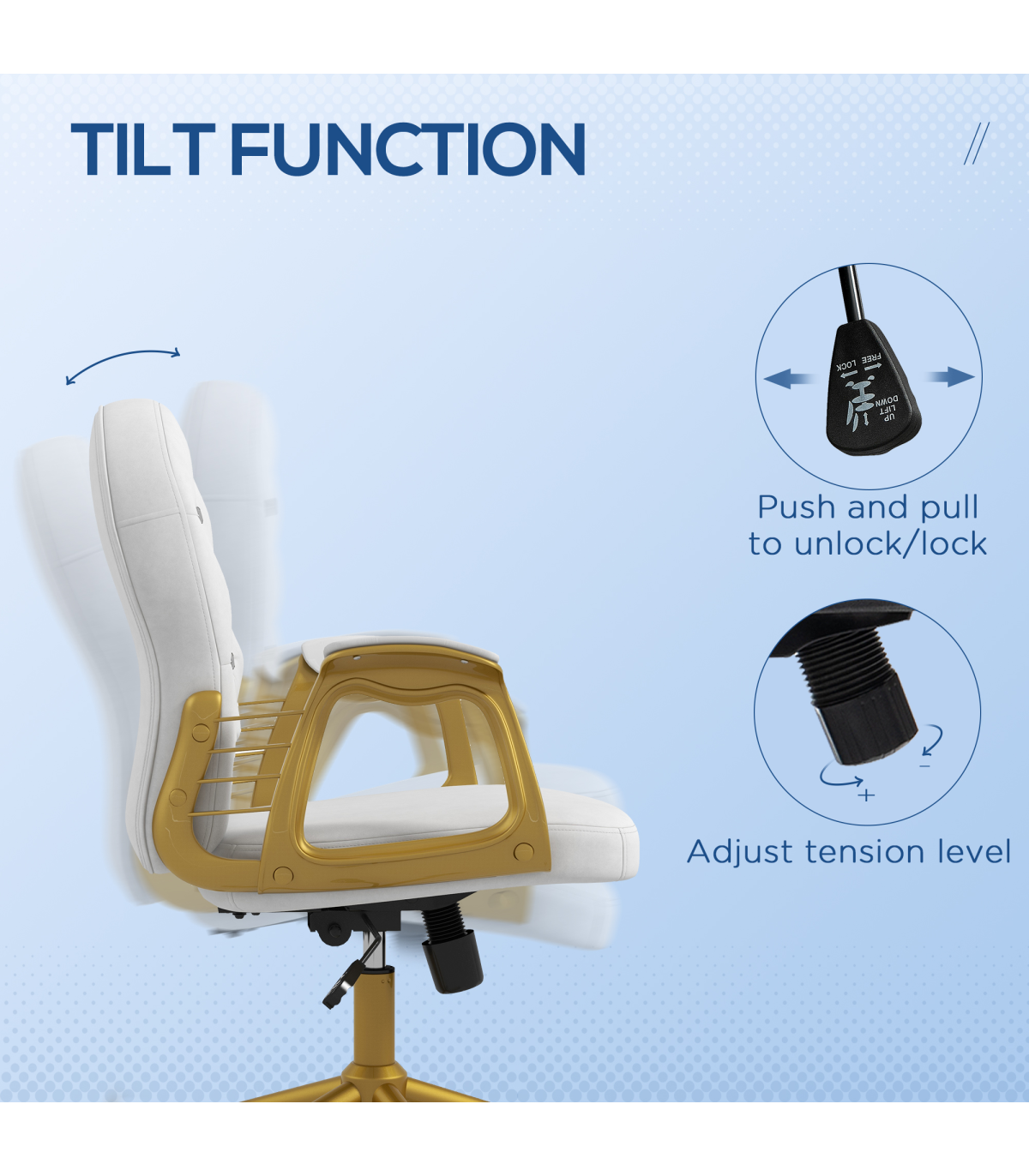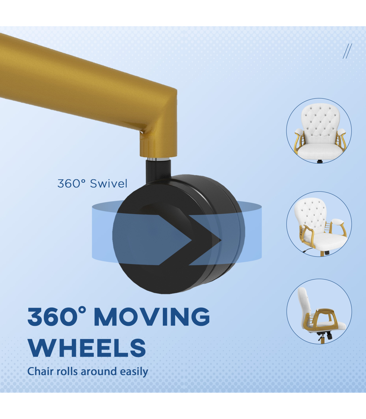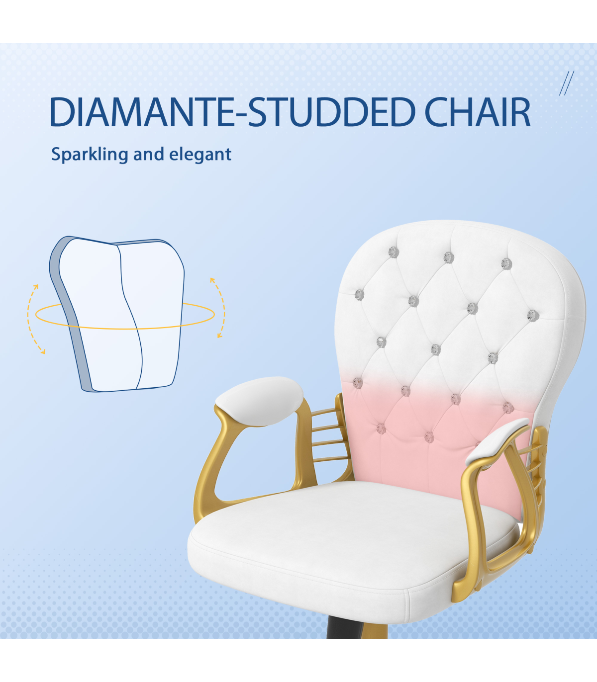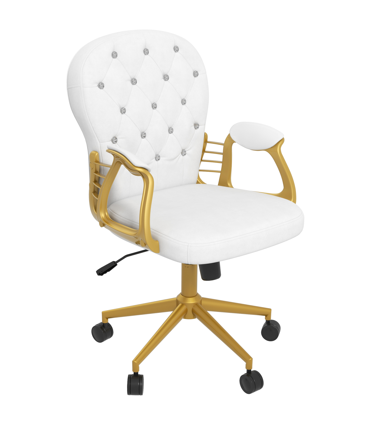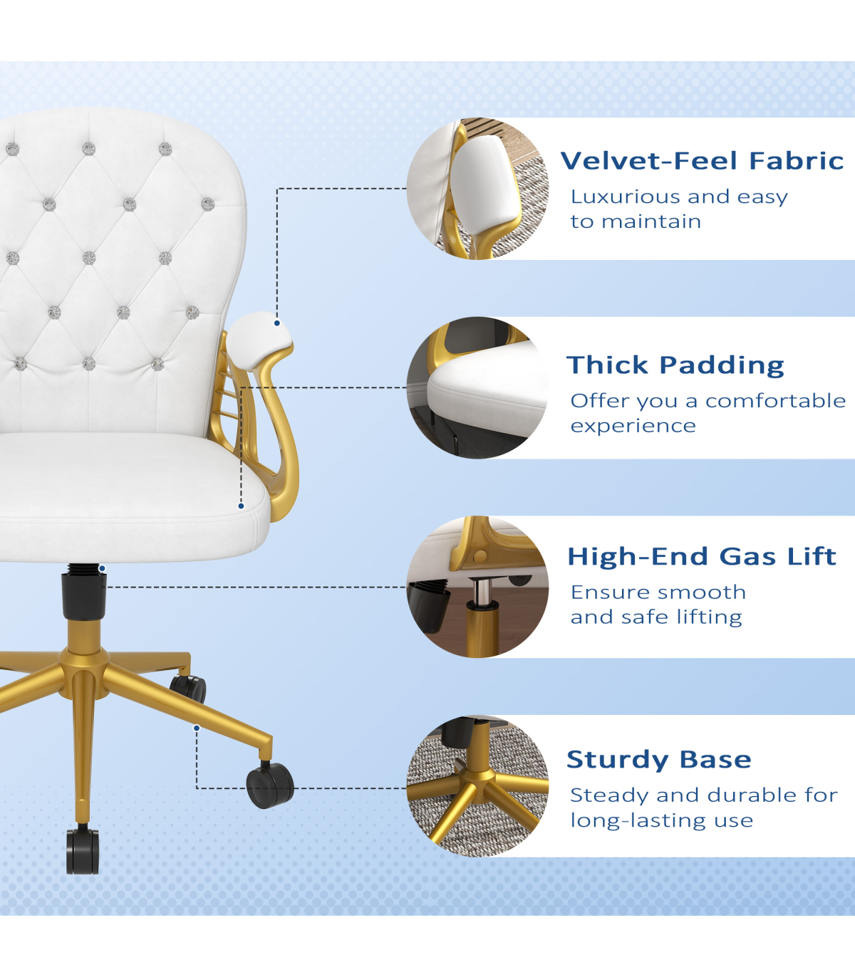 Vinsetto Home Office Chair Button Tufted Desk Chair with Swivel Wheels White Description: - Polished design of velour upholstery with diamante tufting on the back - Frame provides stability and support up to 120kg - Plush all-over padding ensures comfort for hours on end - Ergonomic design of a high and slightly curved back, high-rise armrests and adjustable height and back tilt - 360° swivel base with five castor wheels to move around easily - Assembly required