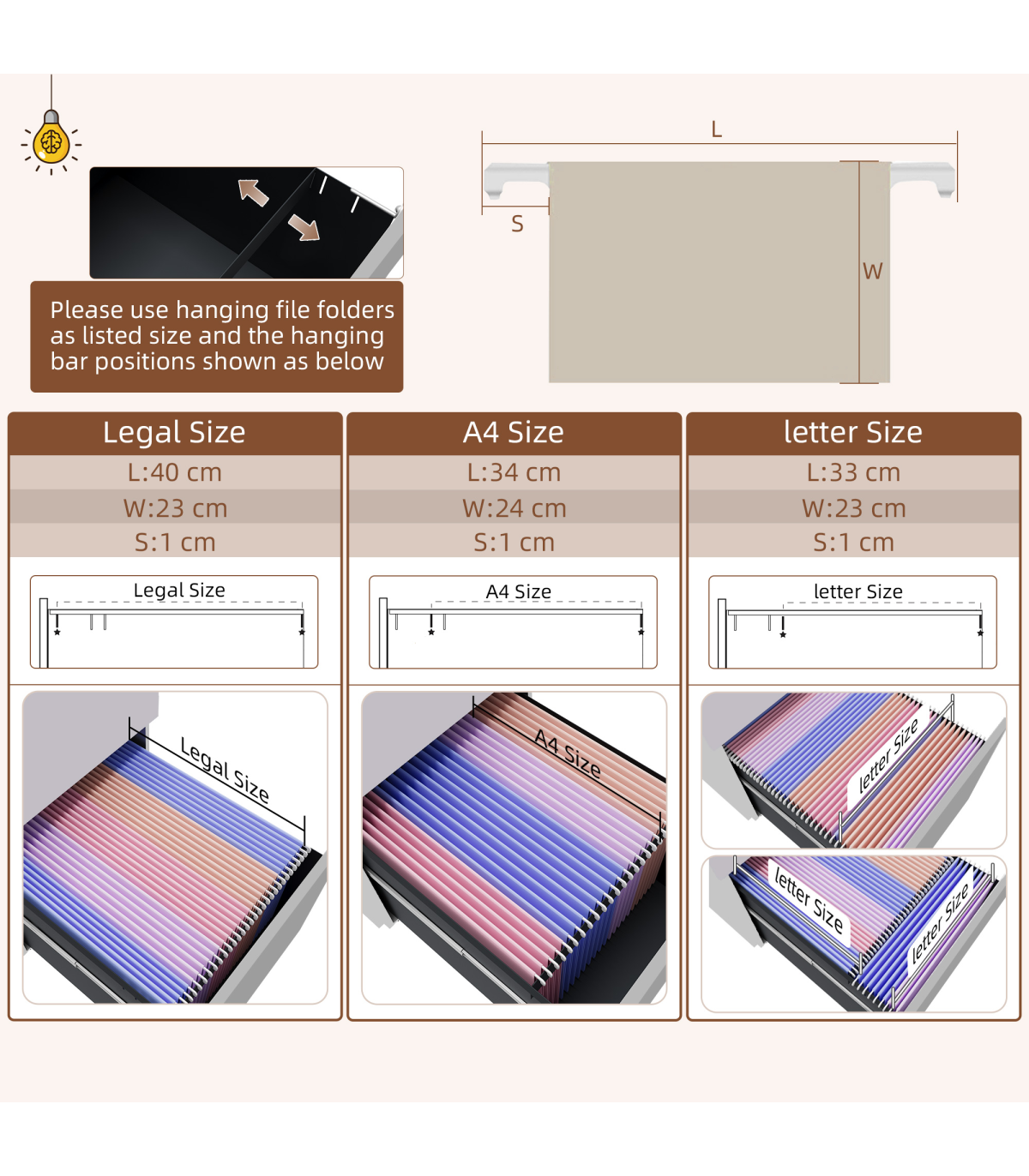 ? Adjustable hanging bar in bottom bar for letter, A4 and legal sized files