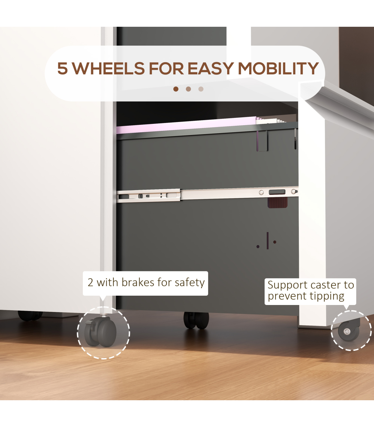 ? Five wheels to move easily. Two with locks. Middle wheel to avoid unit tipping