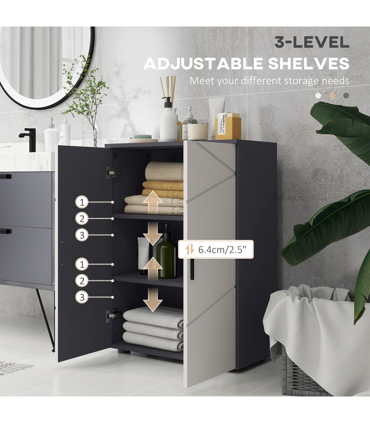 each shelf is adjustable to three different positions. Anti-tipping straps included. Subtle style done the minimalist way.