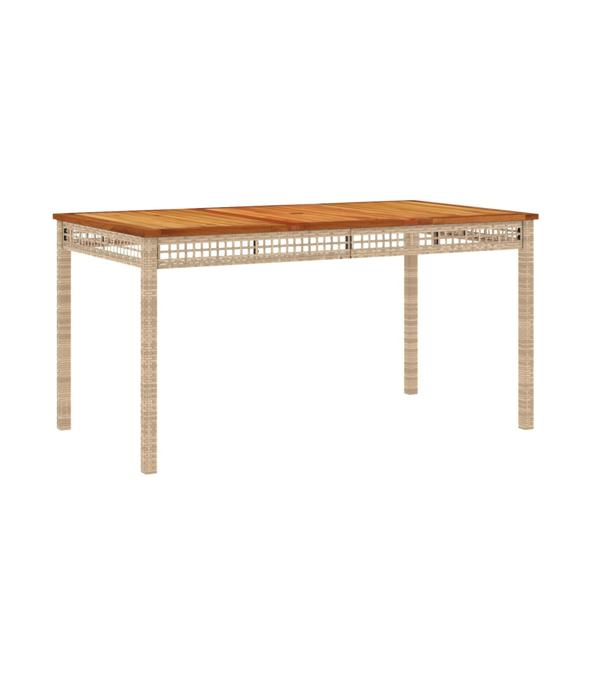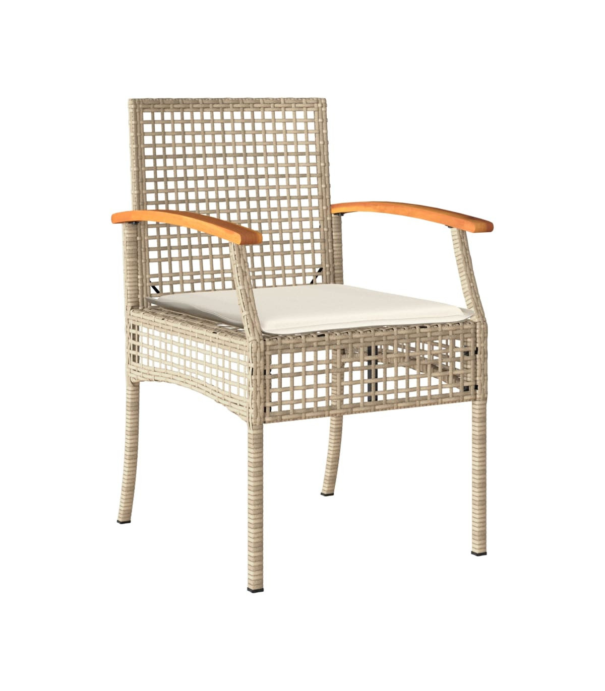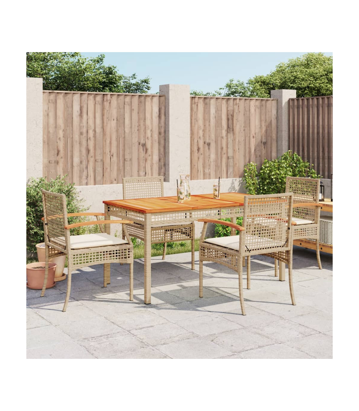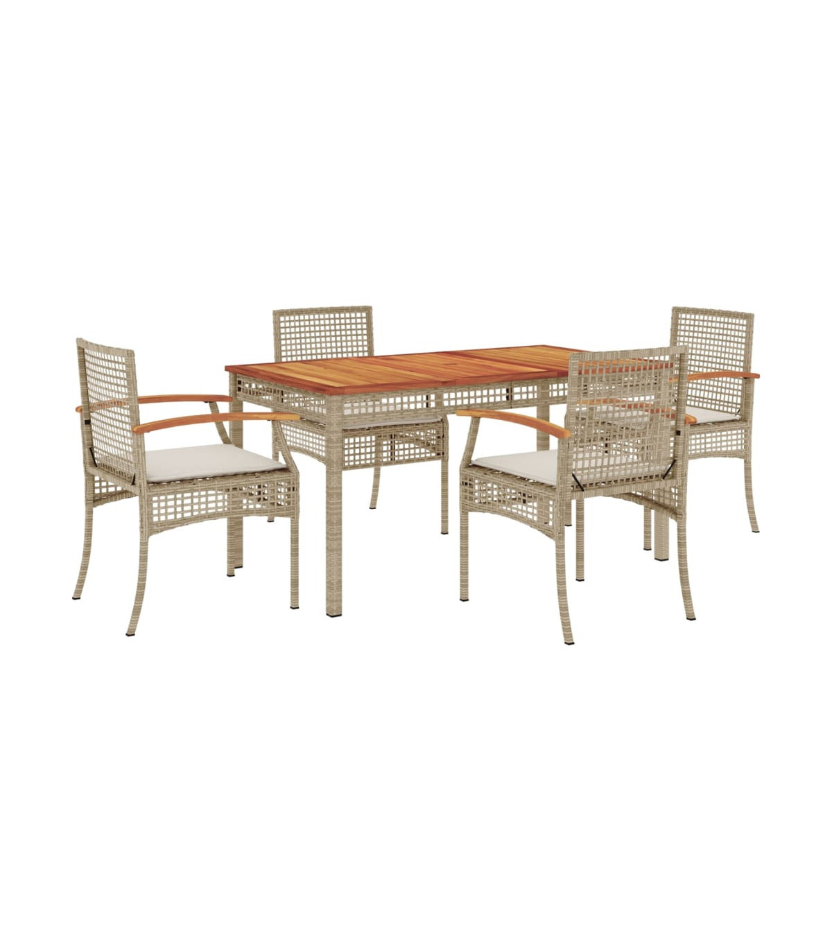 This garden dining set is a great choice for al fresco dining or just relaxing in the garden, backyard, or on the patio. Durable material: PE rattan, also known as poly rattan, is a strong, low-maintenance synthetic material that looks like natural rattan. It's lightweight, easy to clean, and commonly used for outdoor furniture due to its durability and weather-resistant properties.Comfortable seat experience: This outdoor furniture, complete with thickly padded cushions, offers a comfortable seating experience.Removable and washable cover: These seat cushions feature removable covers for easy washing and maintenance.Stable and easy-to-clean tabletop: This garden table has an acacia wood top that is sturdy, durable, and easy to clean with a damp cloth.Robust and stable frame: The powder-coated steel frame ensures that the garden furniture is strong and stable for daily outdoor use. Good to know:To make sure your outdoor furniture stays beautiful, we recommend protecting it with a waterproof cover.