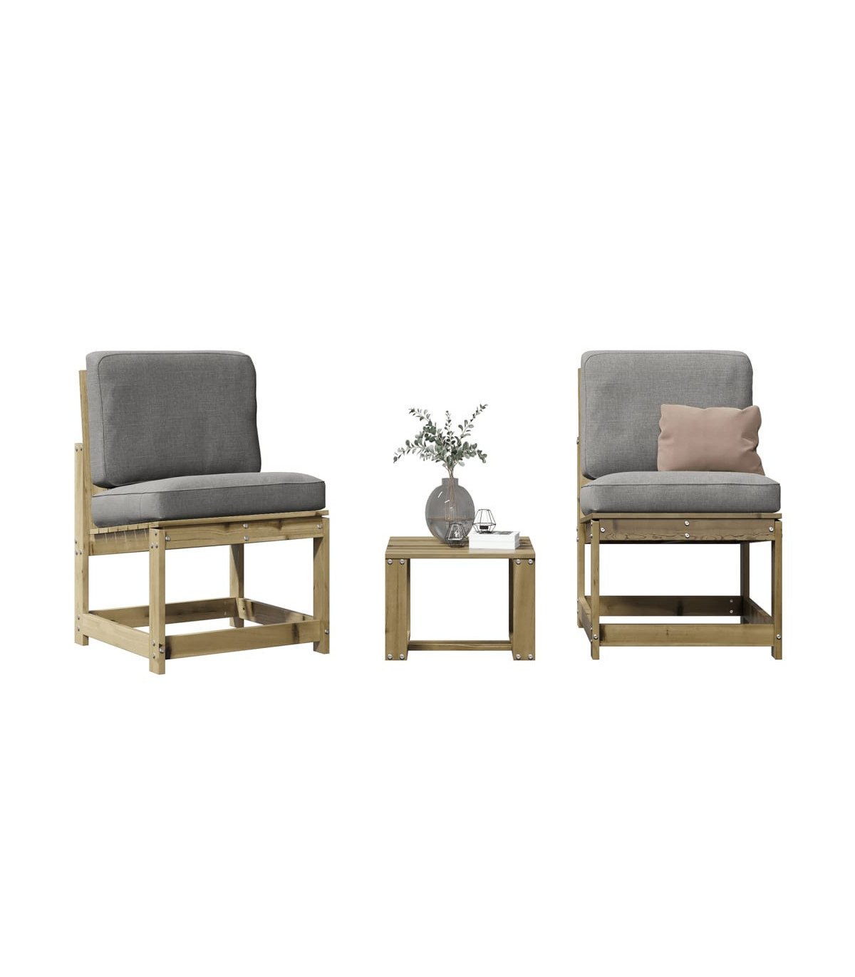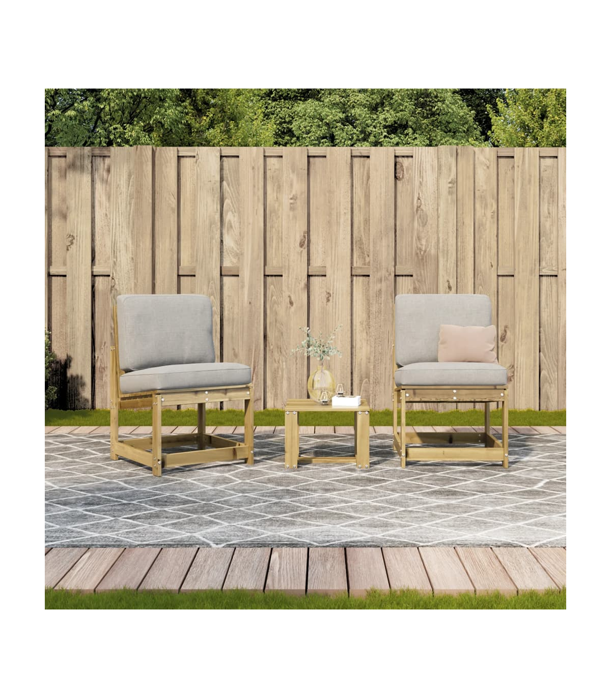 This wooden garden lounge set has an elegant design and is a great choice for relaxing and enjoying in the garden or patio. Solid pine wood: The outdoor lounge set is made of solid pine wood for sturdiness and stability. Solid pine wood is a beautiful natural material. Pine wood has a straight grain, and the knots give the material its signature, rustic look.Comfortable seating experience: Featuring a backrest, the patio lounge set gives you the utmost comfort.Slatted design: The slatted design of the wooden lounge set prevents water accumulation, keeping the seat dry and preventing unnecessary rotting.Wide applications: The garden seating is perfect for any front porch, patio, backyard, lawn, garden, etc. Good to know:To make sure your outdoor furniture stays beautiful, we recommend protecting it with a waterproof cover.
