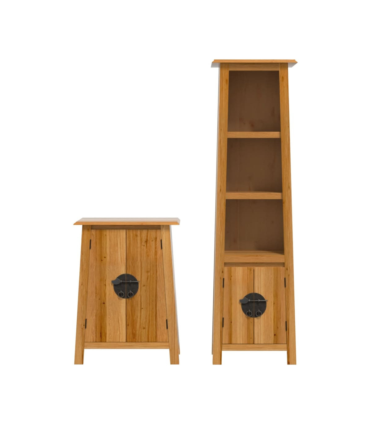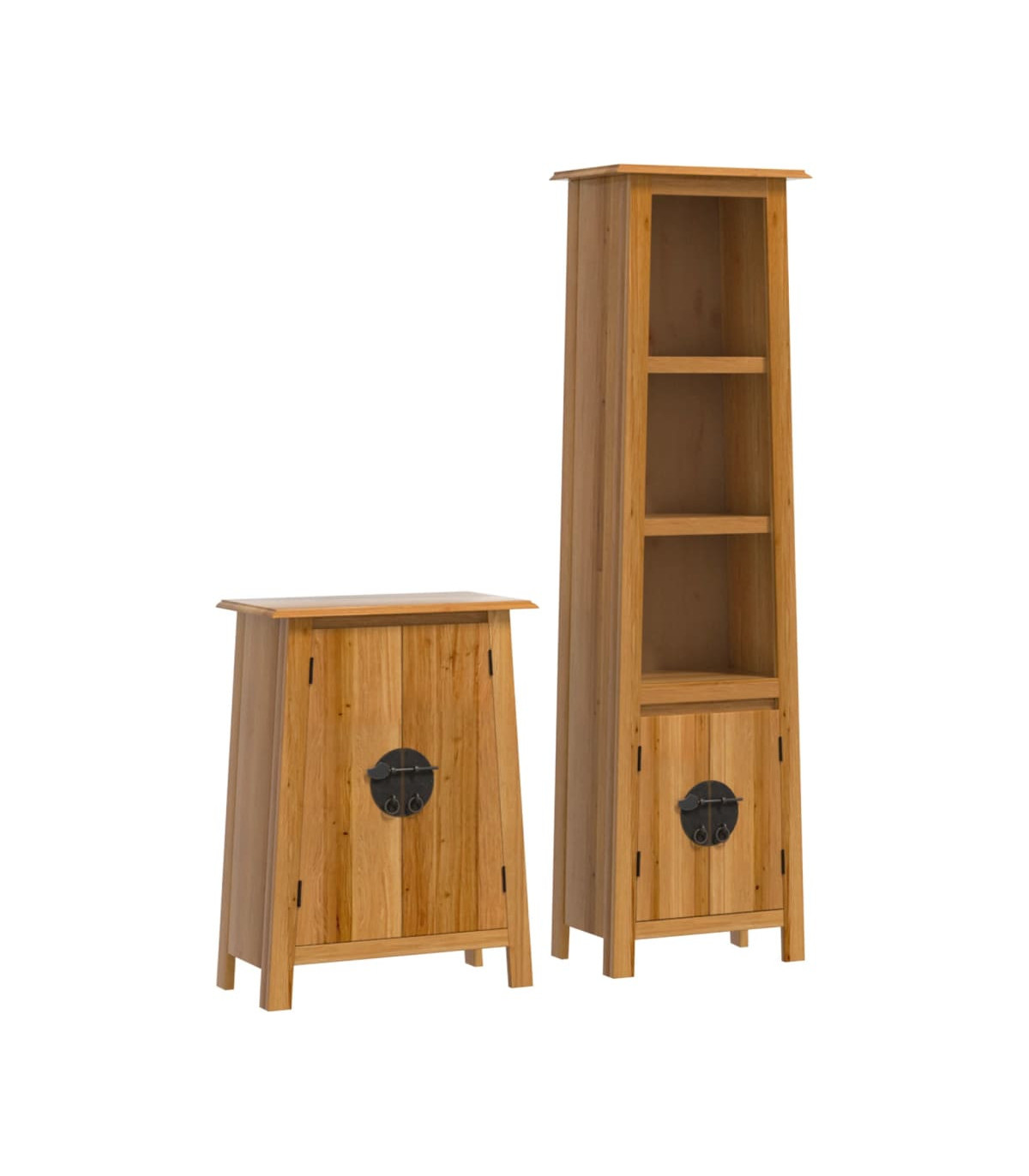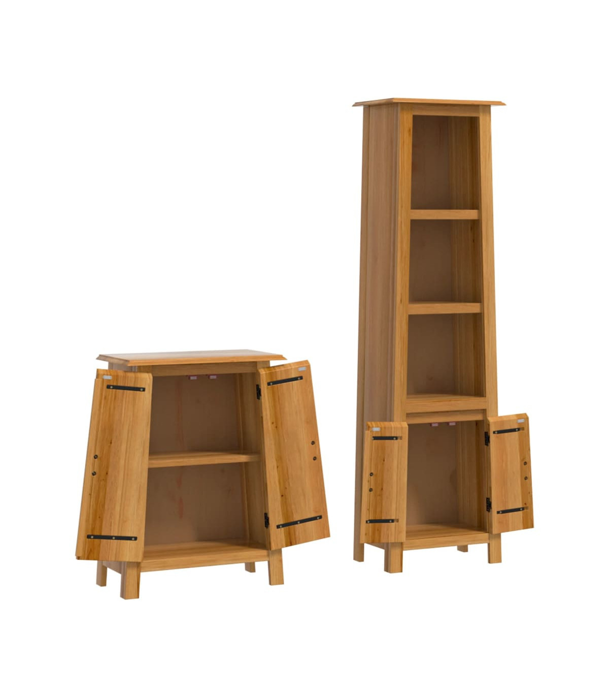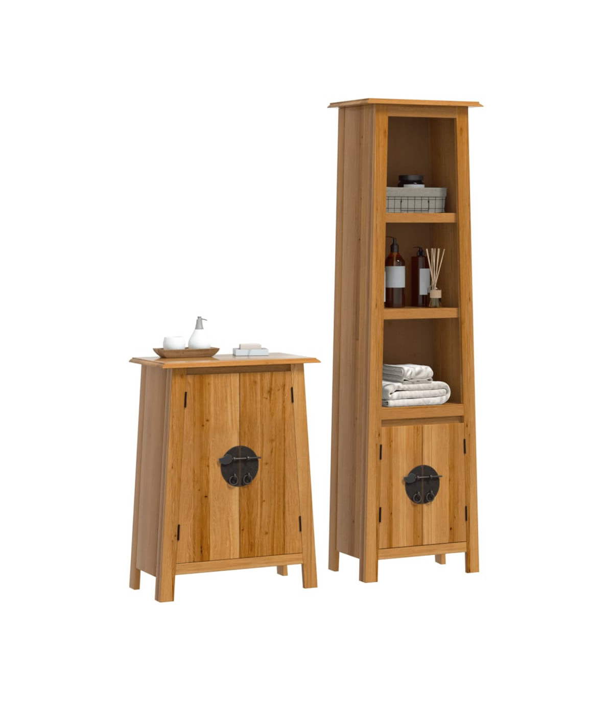 This bathroom furniture set is an excellent addition to your bathroom, giving it a tidy and striking appearance! Solid pine wood: Solid pine wood is a beautiful natural material. Pine wood has a straight grain, and the knots give the material its signature, rustic look.Ample storage space: The bath cabinet offers ample space to easily accommodate your essential toiletries and bath items such as soaps, shampoo, toothpaste, etc.Convenient handles: The metal handles allow you to open the bathroom storage cabinet easily to get what you want.Wall-mounted function: The bathroom wall cabinet can be wall-mounted for extra storage space. That way, you can maximise your floor space and keep the area clean. Warning:To prevent it from tipping over, this product must be used with the wall attachment device (not provided). Good to know:Each item is unique with variations in colours and grains. The delivery is random, ensuring the exclusivity and individuality of your product.
