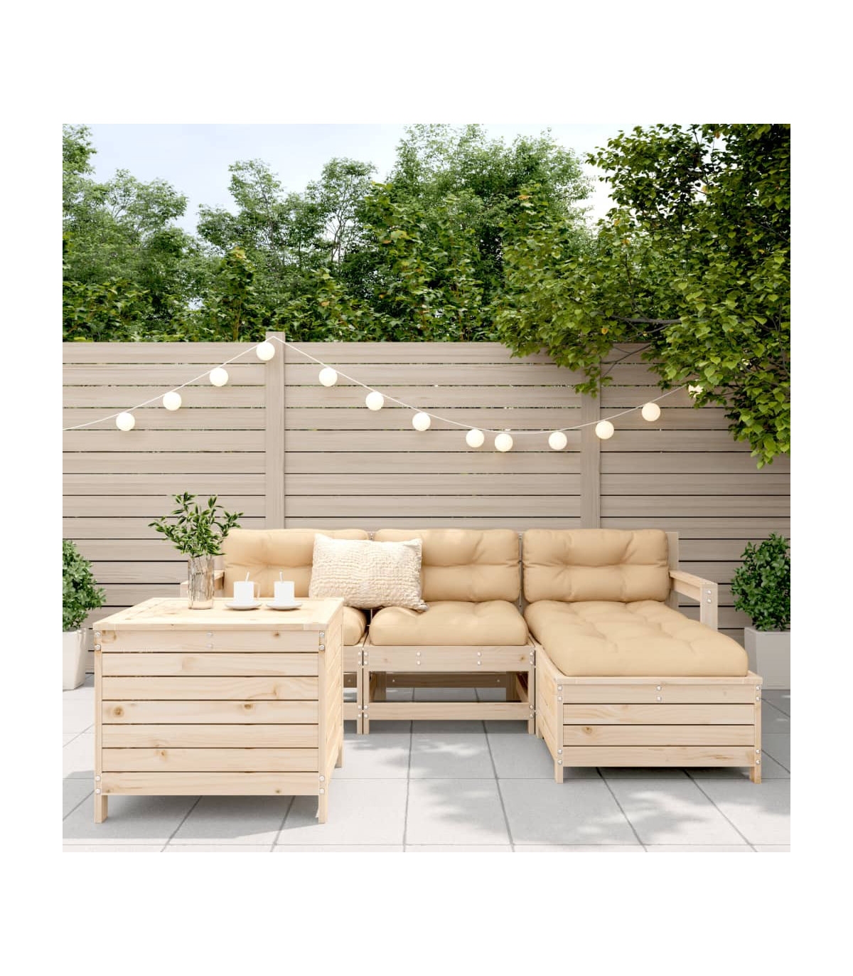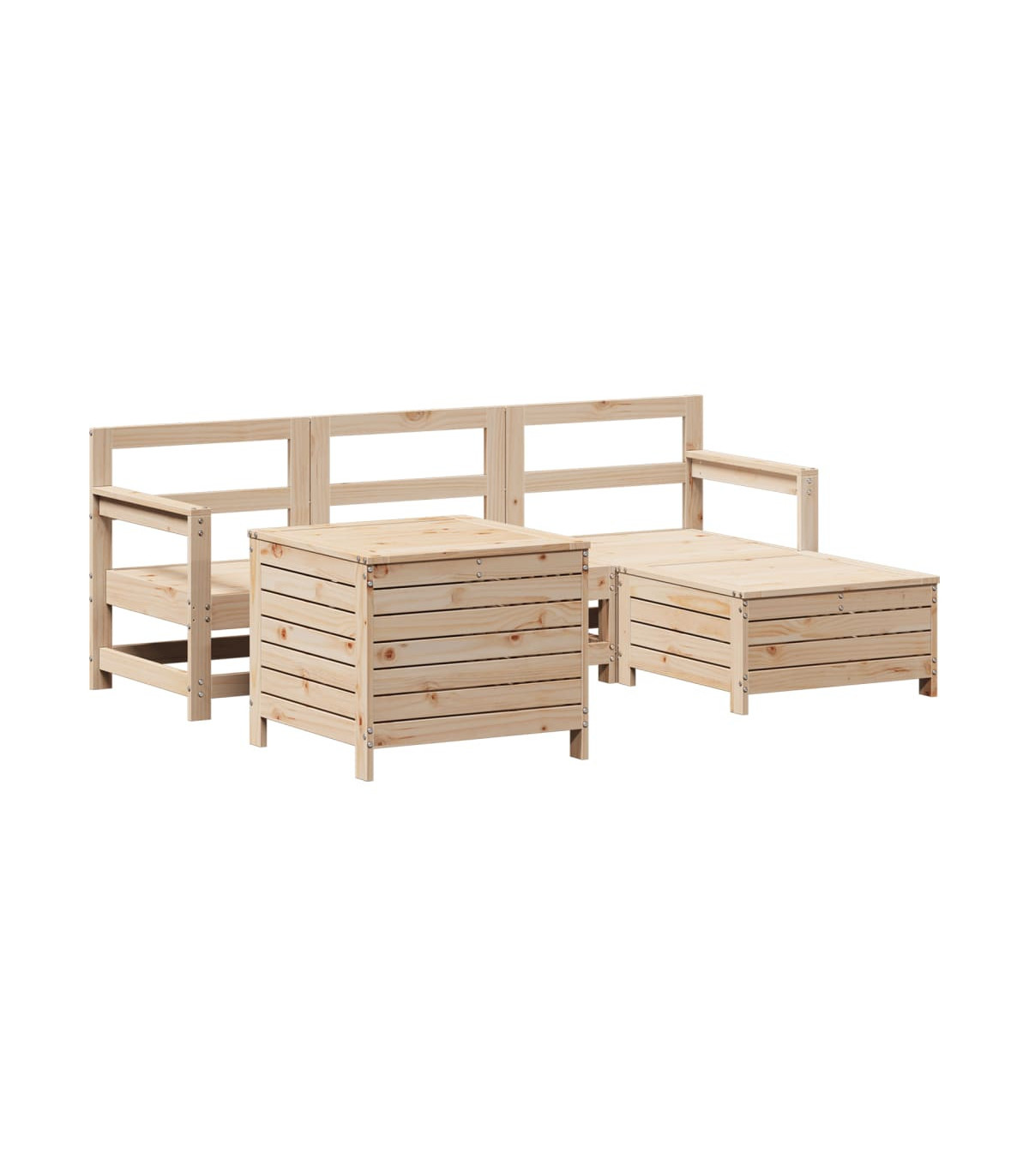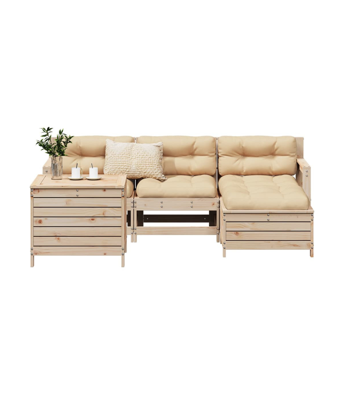 This wooden garden lounge set with slatted design will make a great addition to your garden, patio, or terrace for enjoying a cosy time with your family or friends. Sturdy and durable material: Solid pinewood is known for its strength and durability. Its straight grains and distinctive knots contribute to its rustic charm. Well-ventilated and pooling prevention: The slatted design promotes optimal airflow and effectively prevents water pooling, ensuring a dry and comfortable seat. Versatile usage: The garden footstool can not only be used to sit or relax your feet, but it can also be used as a coffee table to hold your drinks, food, and other decorations. Convenient table: The garden table provides you with a convenient place to reach your essentials with ease. Modular design: This outdoor furniture set has a modular design, making it completely flexible and easy to move around, so you can create a customised outdoor furniture arrangement. Good to know:To make sure your outdoor furniture stays beautiful, we recommend protecting it with a waterproof cover.