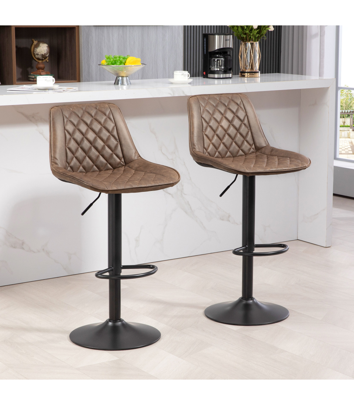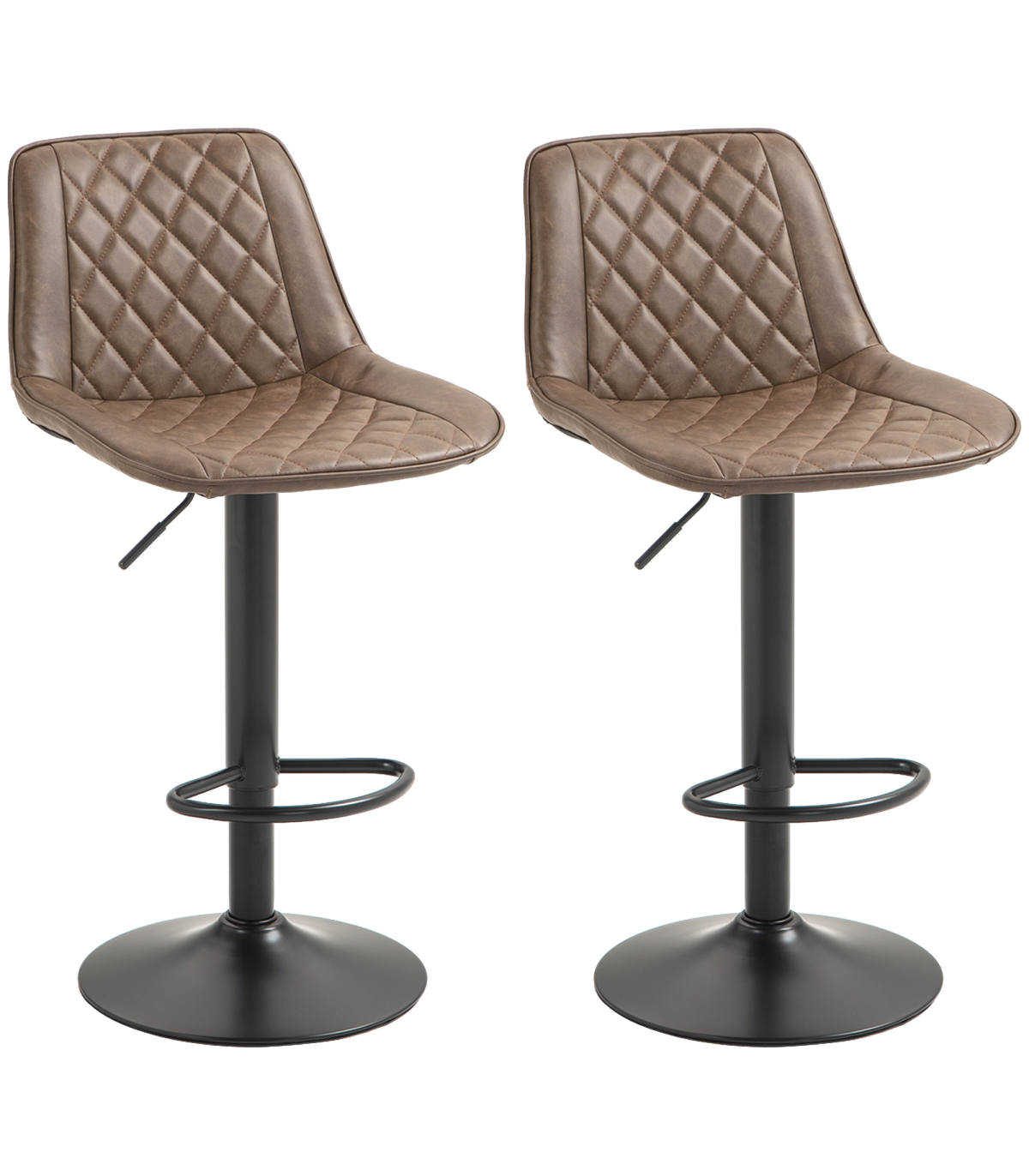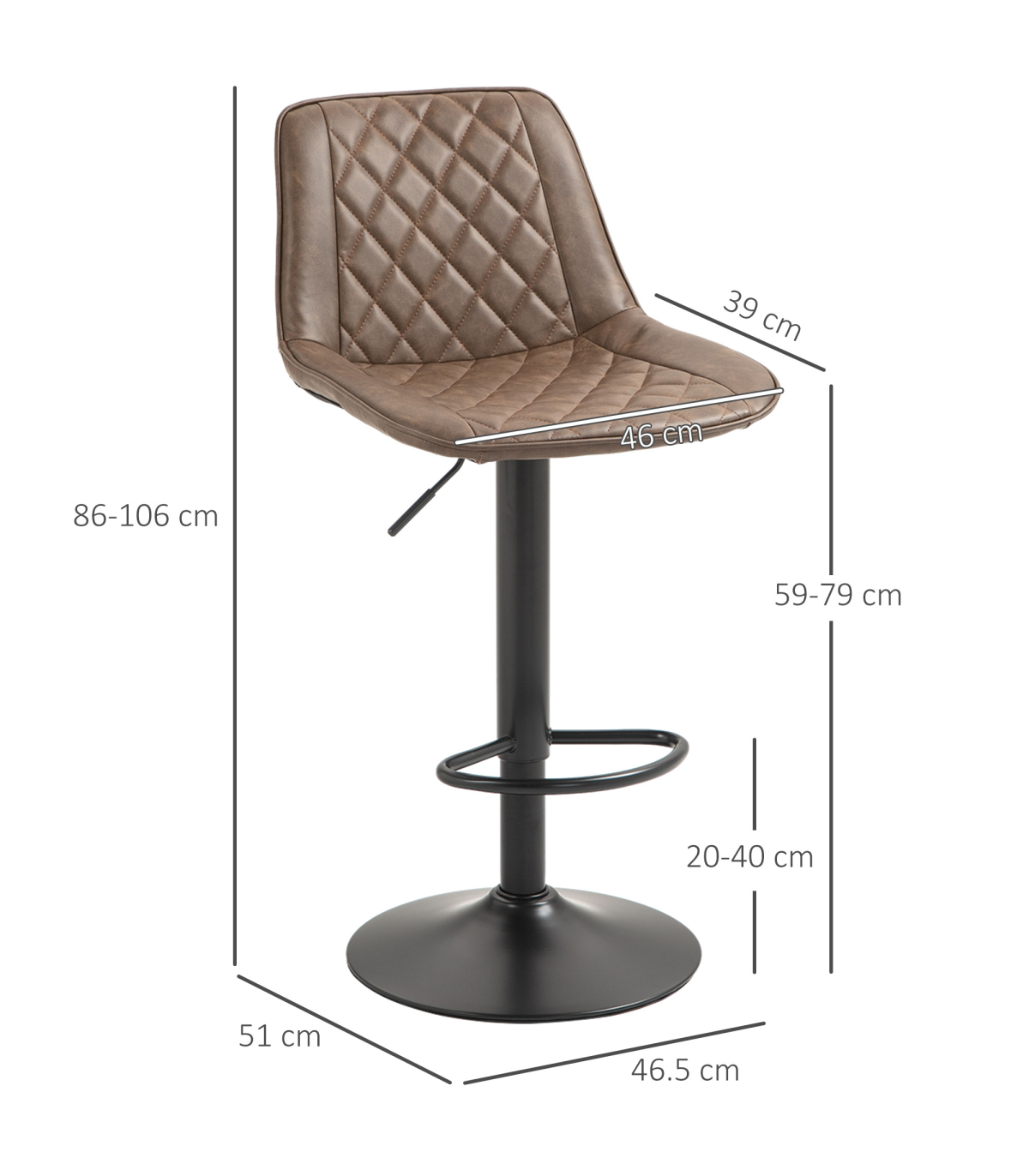 ● Set of two to create a matching look in your home; ● 360° swivel seat works with your body's motion; ● Seat height is adjustable from bar height to counter height; ● Faux leather upholstery with diamond tufting for cool style; ● Powder-coated steel base, with anti-slip foot pad and handy footrest; ● Maximum load 120kg, assembly required; ● Colour: Brown; ● Material: PU Leather, Steel, Sponge; ● Overall Dimensions: 46.5L x 51W x 86-106H cm; ● Seat Dimension: 46L x 39W x 59-79H cm; ● Back Dimension: 45L x 31W x 4D cm; ● Footrest Height: 20-40H cm; ● Base Dimension: Φ38 cm; ● Weight Capacity: 120 kg; ● Item Label: 835-735V00DR;