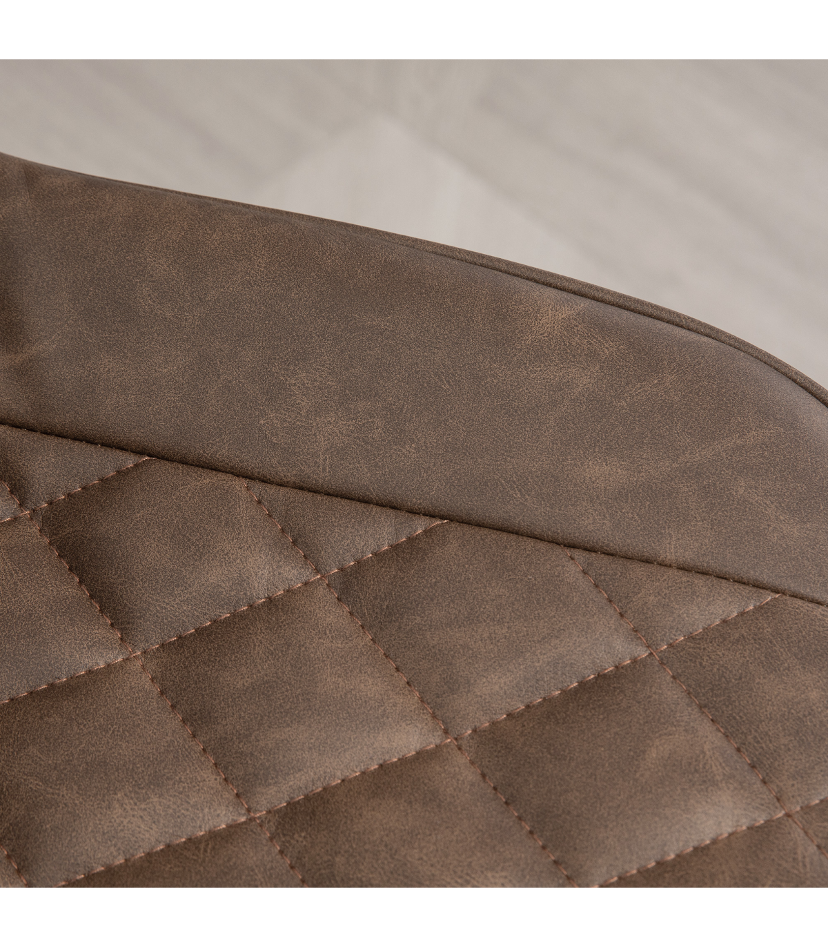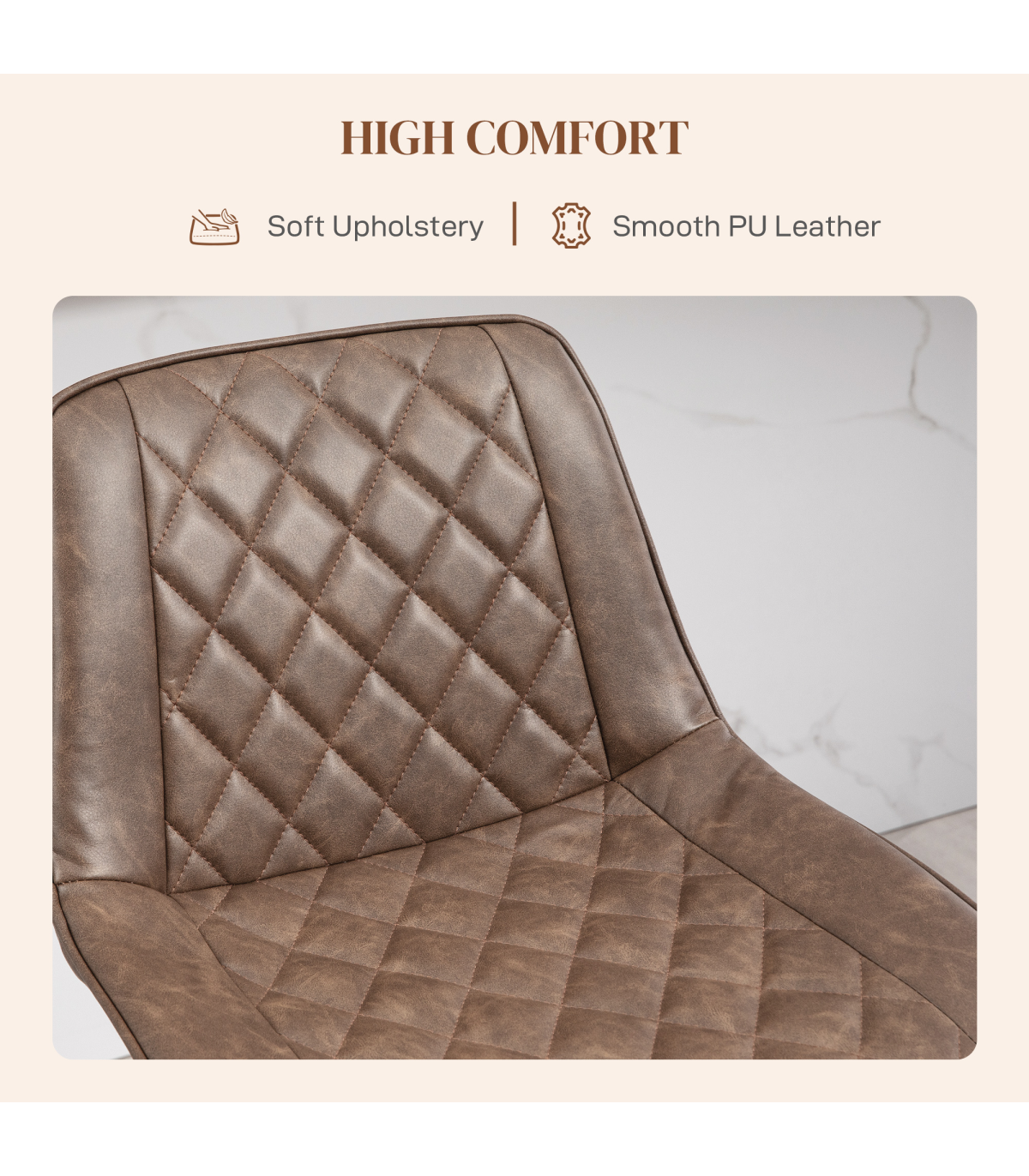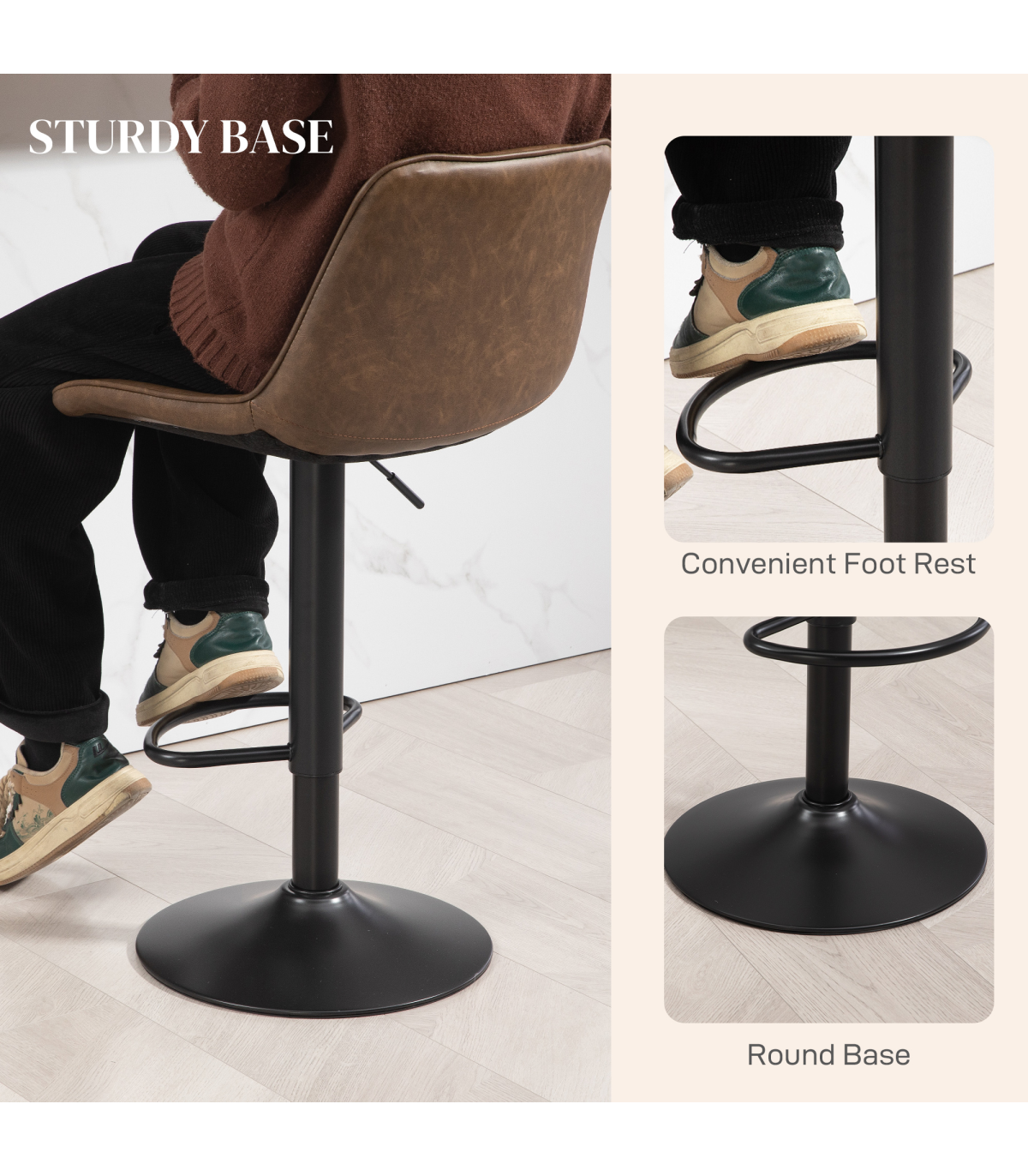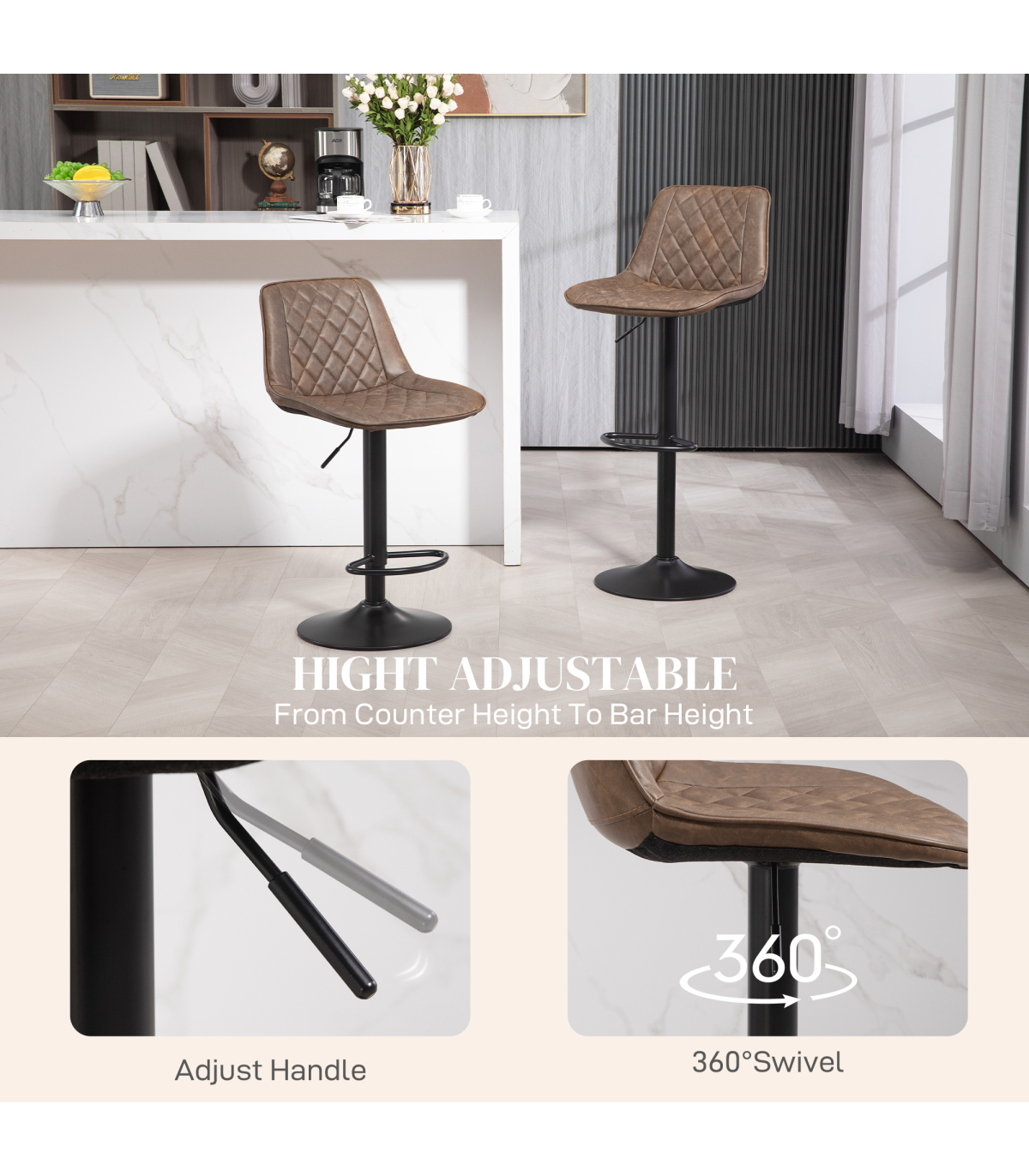 ● Set of two to create a matching look in your home; ● 360° swivel seat works with your body's motion; ● Seat height is adjustable from bar height to counter height; ● Faux leather upholstery with diamond tufting for cool style; ● Powder-coated steel base, with anti-slip foot pad and handy footrest; ● Maximum load 120kg, assembly required; ● Colour: Brown; ● Material: PU Leather, Steel, Sponge; ● Overall Dimensions: 46.5L x 51W x 86-106H cm; ● Seat Dimension: 46L x 39W x 59-79H cm; ● Back Dimension: 45L x 31W x 4D cm; ● Footrest Height: 20-40H cm; ● Base Dimension: Φ38 cm; ● Weight Capacity: 120 kg; ● Item Label: 835-735V00DR;