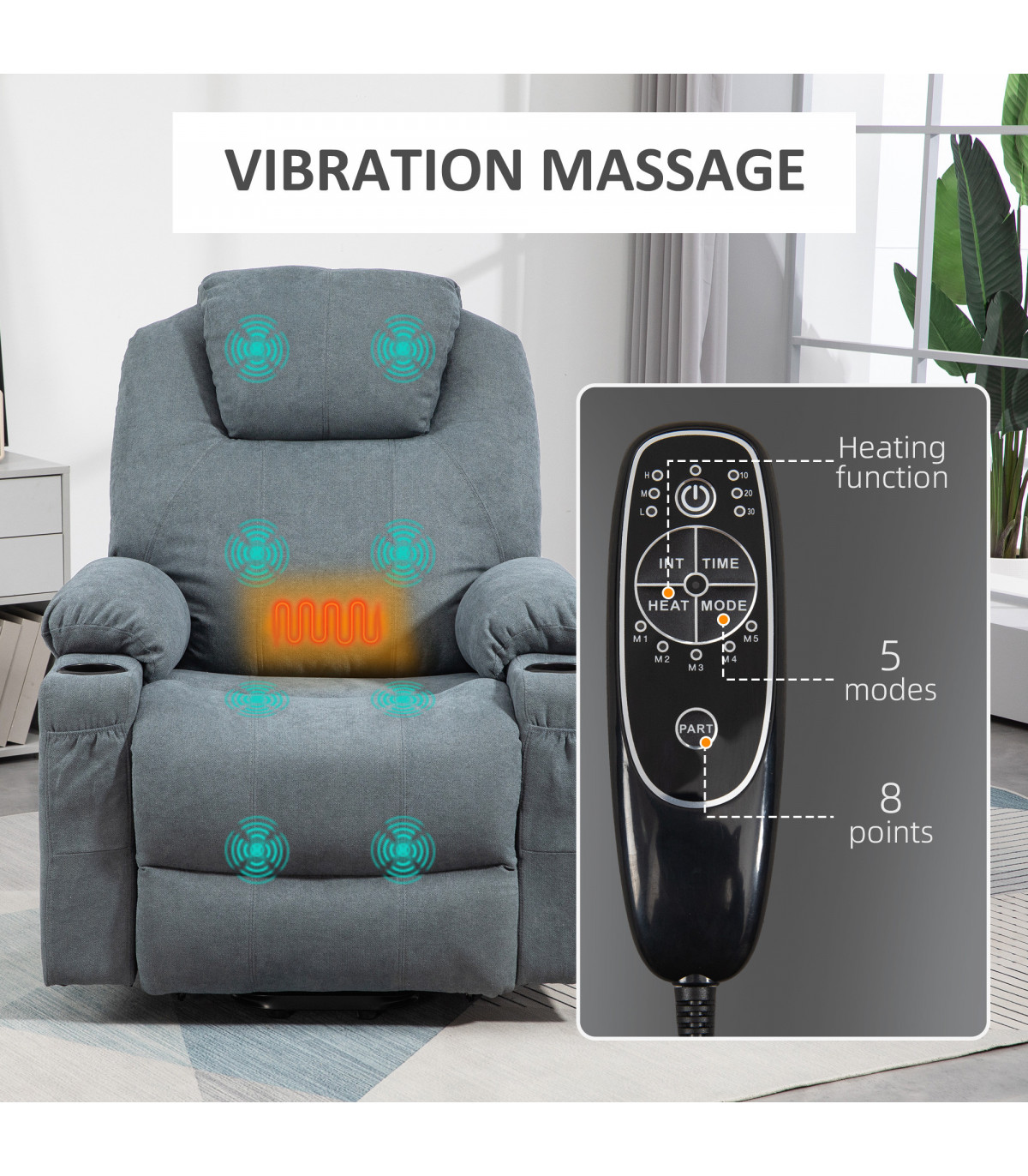 ● Eight-point vibration massage targets the back, lumbar, thighs and legs, includes four massage modes. Lumbar heating;