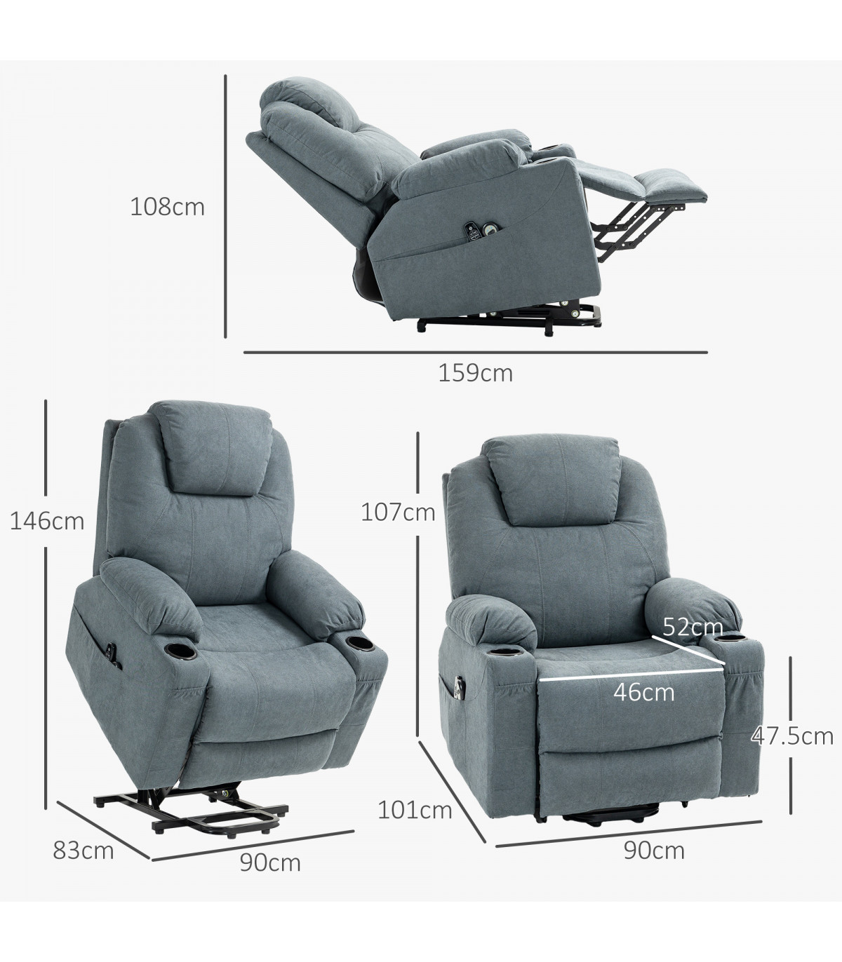 ● Overall Dimensions: (Reclined) 90W x 159D x 108Hcm;