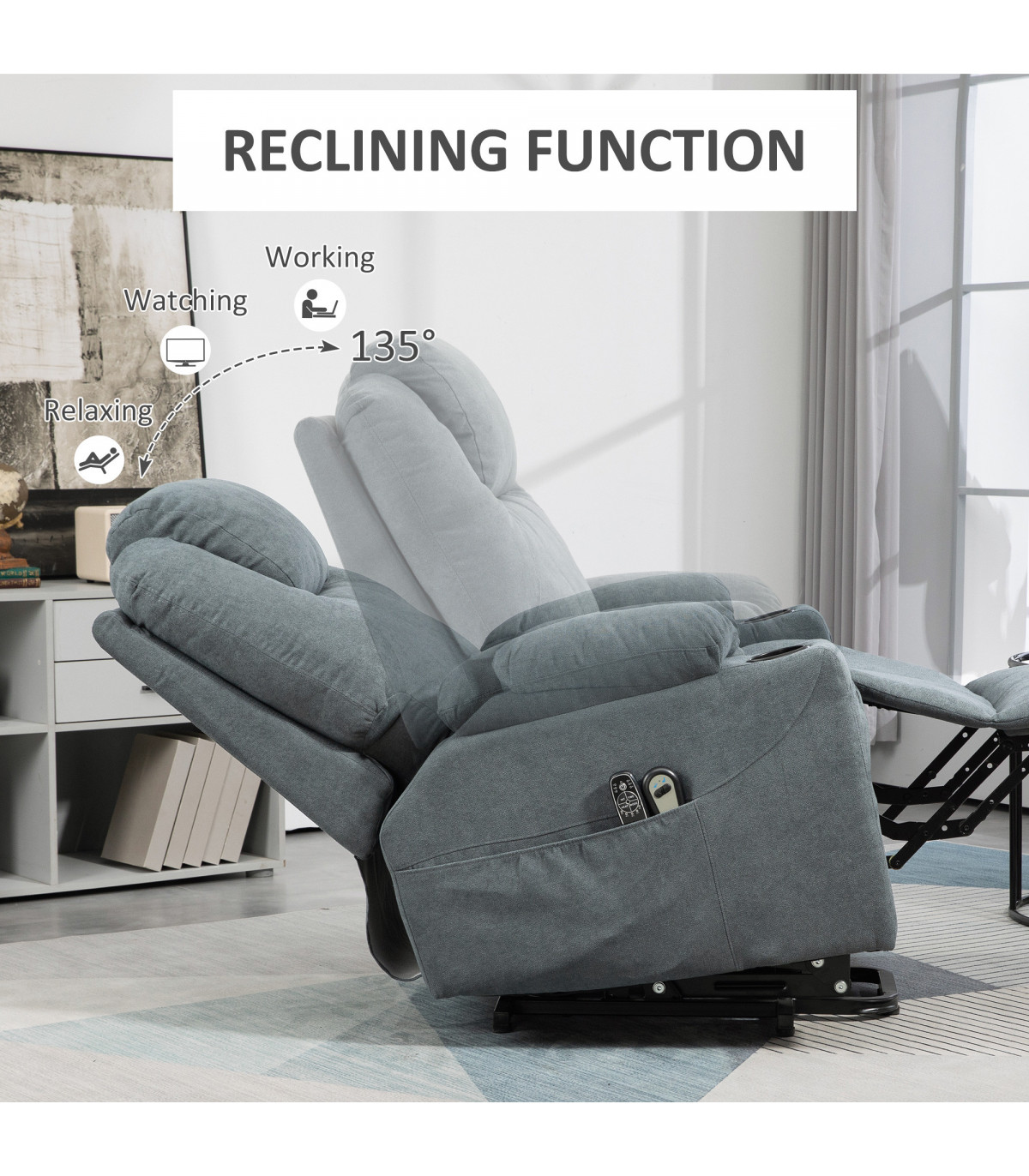 ● Upright to your favourite reclining angle (up to 135°), with footrest;
