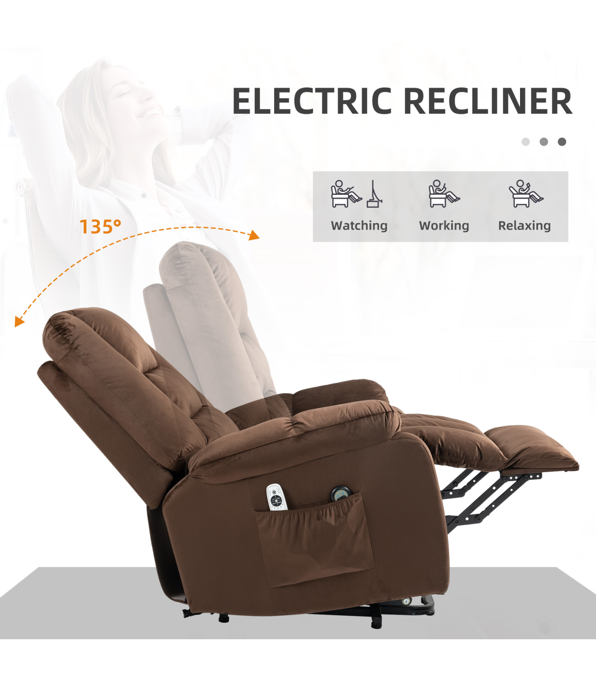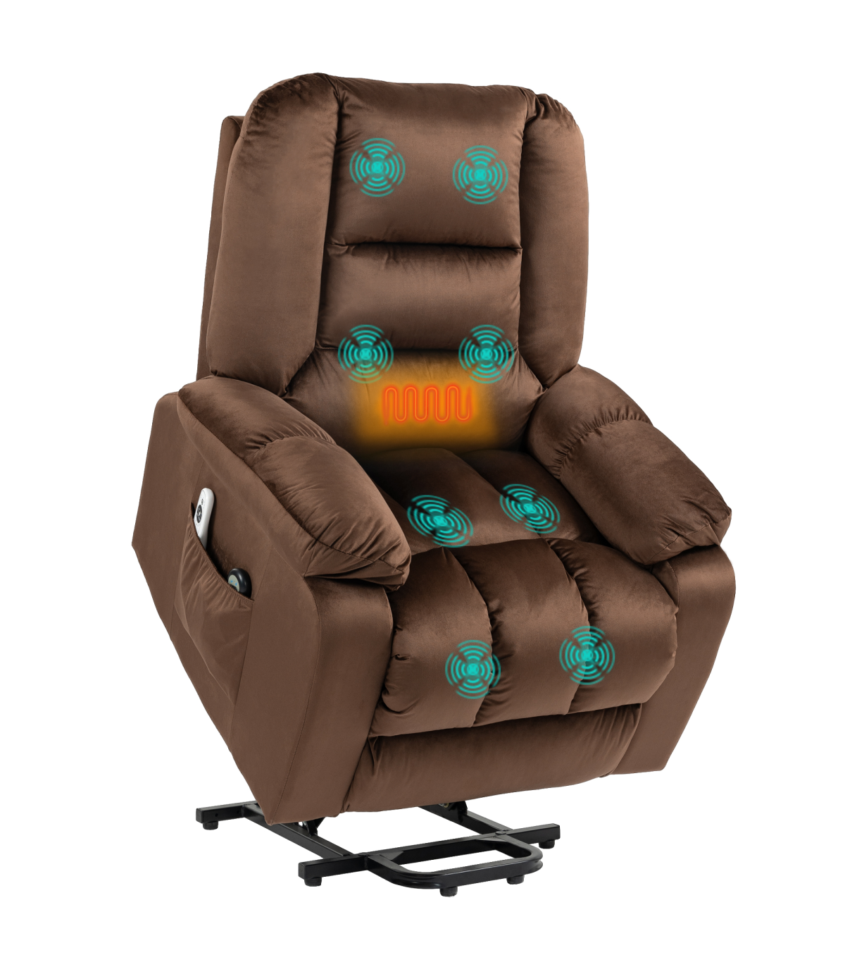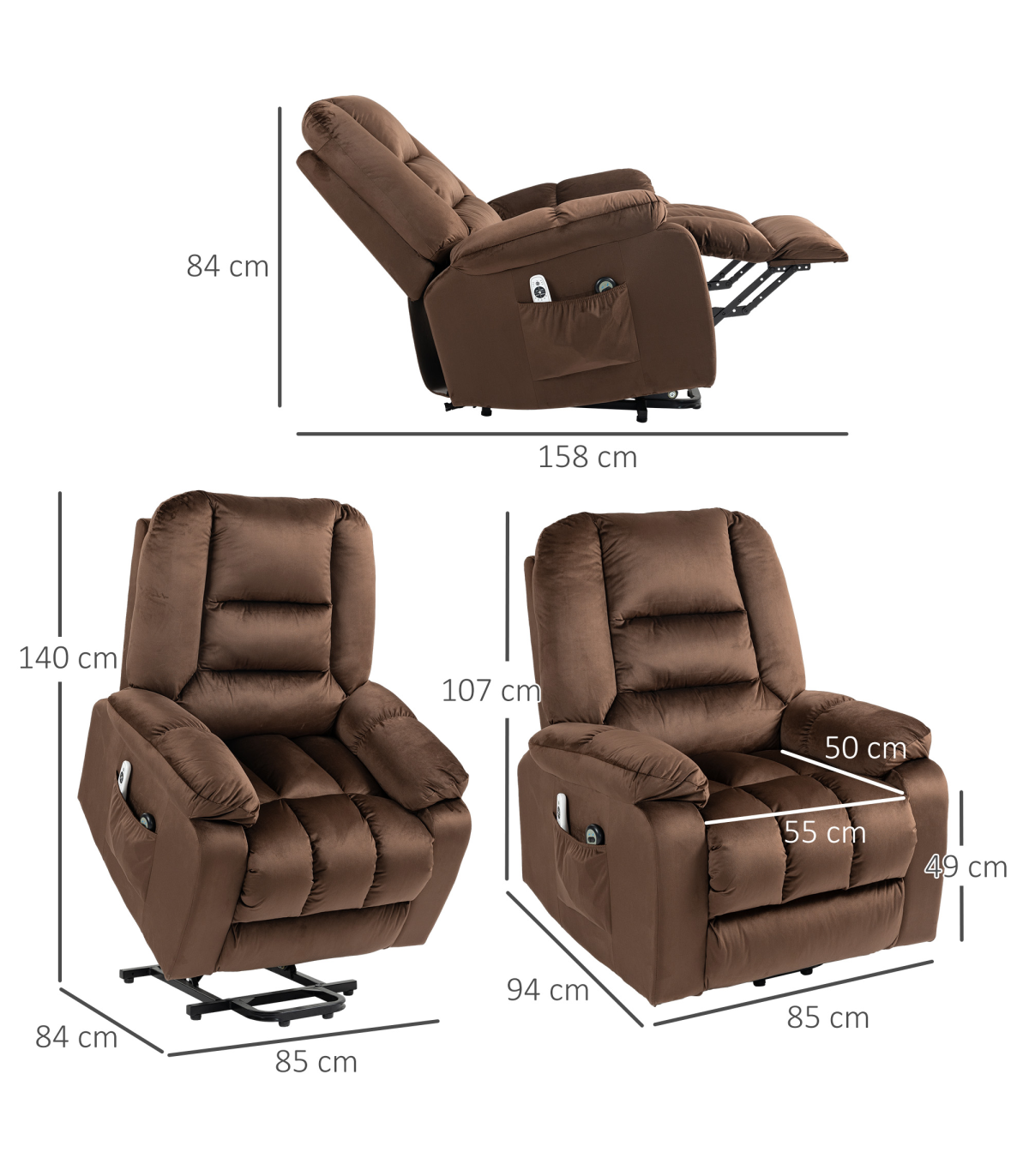 ● 45° seat lift assists to almost standing. Great for the elderly and injured; ● 135° reclining back, footrest. Total body relaxation; ● Electric button control, easy and smooth to any customized position; ● Eight massage points: back, lumbar, thighs and legs. Four massage modes. Lumbar heating; ● Pocket spring and overstuffed padding for comfort; ● Assembles in 5 minutes for immediate use; ● Velvet-feel fabric for soft touch and elegant look; ● Two side pockets to keep essentials within reach; ● Maximum load 150kg, assembly required. ● Colour: Dark Brown; ● Material: Velvet (Polyester), Foam; ● Overall Dimensions: (Upright) 85W x 94D x 107Hcm; ● Overall Dimensions: (Reclined) 85W x 158D x 84Hcm; ● Overall Dimensions: (Lifted) 85W x 84D x 140Hcm; ● Chair to Wall: (Reclined) 80cm; ● Seat Size: 55W x 50Dcm; ● Seat Height: 49cm; ● Armrest Height to Seat: 15cm; ● Back Size: 76W x 72Lcm; ● Cushion Thickness: Seat: 13cm, Back: 25cm; ● Cord Length: 1.5m; ● Weight Capacity: 150kg; ● Suitable for User Height: ≤ 190cm; ● Input: 100-240 V, 50 / 60 Hz; ● Massage Output: 12 V / 1 A / 12 W; ● Rise Output: 29 V / 2 A / 58 W; ● Item Label: 713-160V70DR;