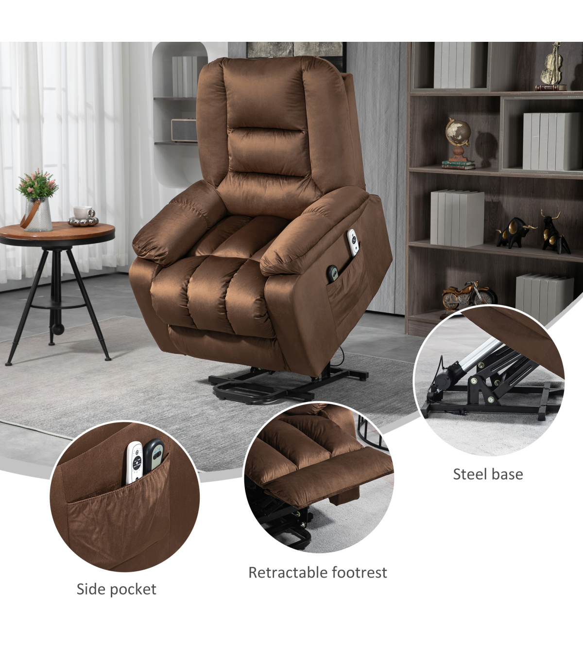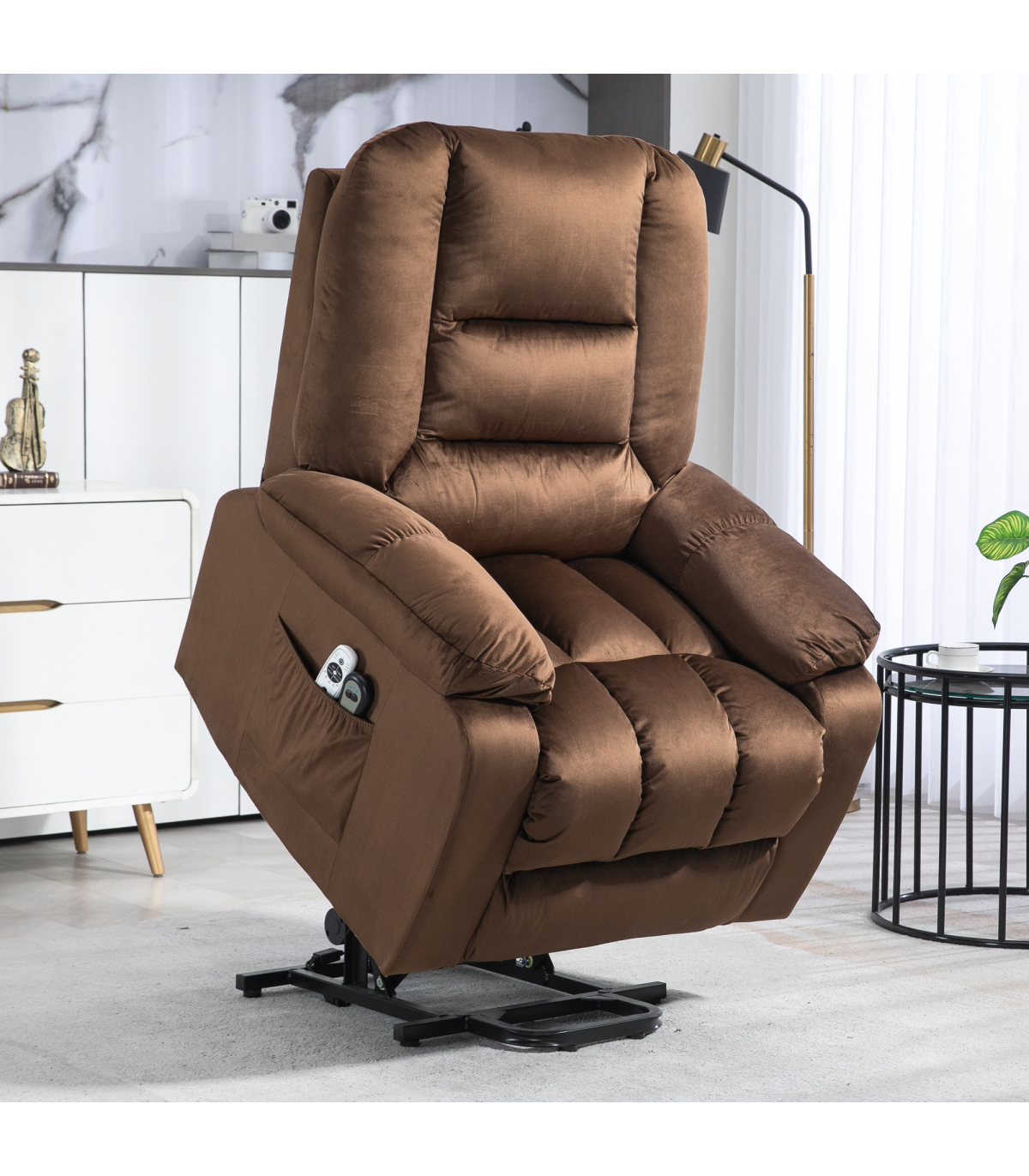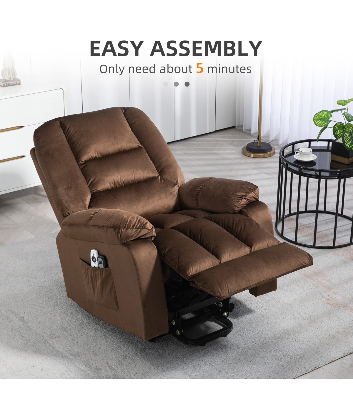 ● 45° seat lift assists to almost standing. Great for the elderly and injured; ● 135° reclining back, footrest. Total body relaxation; ● Electric button control, easy and smooth to any customized position; ● Eight massage points: back, lumbar, thighs and legs. Four massage modes. Lumbar heating; ● Pocket spring and overstuffed padding for comfort; ● Assembles in 5 minutes for immediate use; ● Velvet-feel fabric for soft touch and elegant look; ● Two side pockets to keep essentials within reach; ● Maximum load 150kg, assembly required. ● Colour: Dark Brown; ● Material: Velvet (Polyester), Foam; ● Overall Dimensions: (Upright) 85W x 94D x 107Hcm; ● Overall Dimensions: (Reclined) 85W x 158D x 84Hcm; ● Overall Dimensions: (Lifted) 85W x 84D x 140Hcm; ● Chair to Wall: (Reclined) 80cm; ● Seat Size: 55W x 50Dcm; ● Seat Height: 49cm; ● Armrest Height to Seat: 15cm; ● Back Size: 76W x 72Lcm; ● Cushion Thickness: Seat: 13cm, Back: 25cm; ● Cord Length: 1.5m; ● Weight Capacity: 150kg; ● Suitable for User Height: ≤ 190cm; ● Input: 100-240 V, 50 / 60 Hz; ● Massage Output: 12 V / 1 A / 12 W; ● Rise Output: 29 V / 2 A / 58 W; ● Item Label: 713-160V70DR;