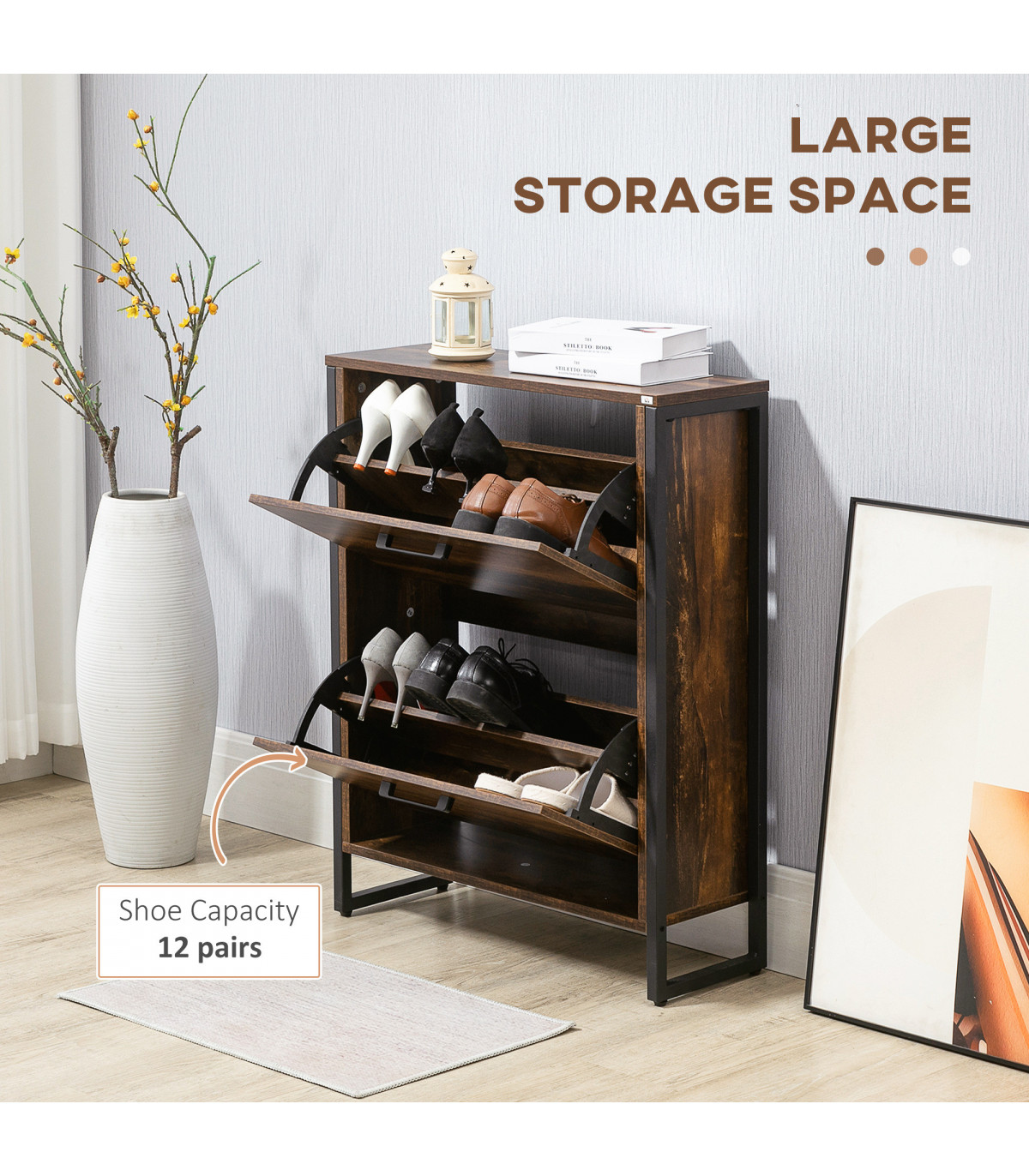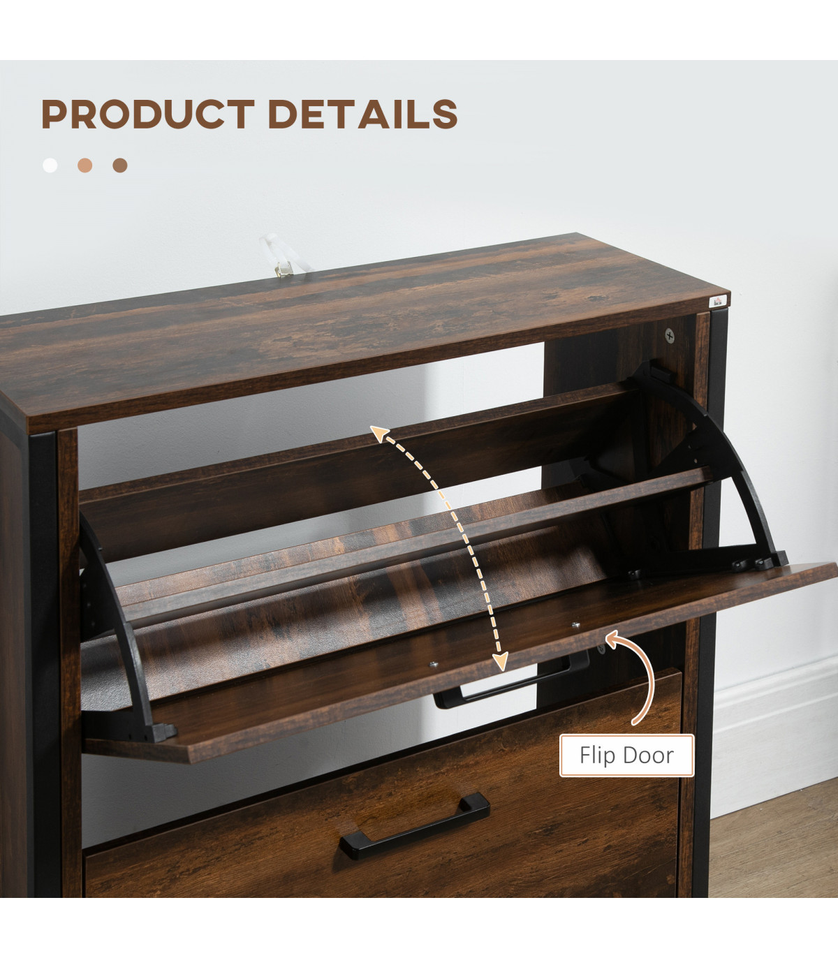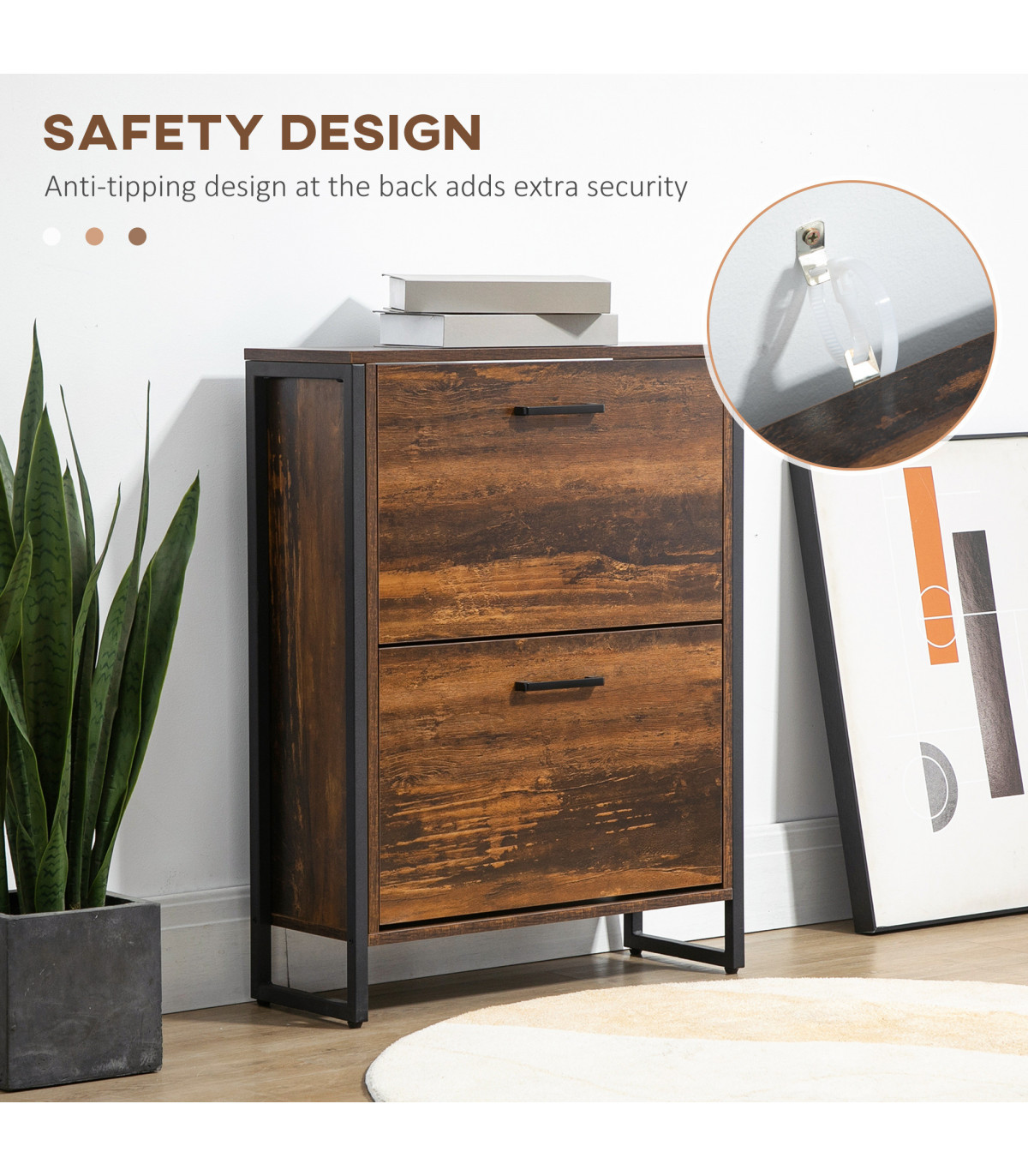 Store footwear with a dash of industrial charm - look to this HOMCOM shoe cabinet. The two flip door design offers room for up to 12 shoe pairs, making it ideal for single and shared use. A steel frame for a strong core, fitted with durable particle board panels in a beautifully classic dark wood effect. Narrow shoe cabinet comes with anti-tipping straps to secure it safely to a wall.