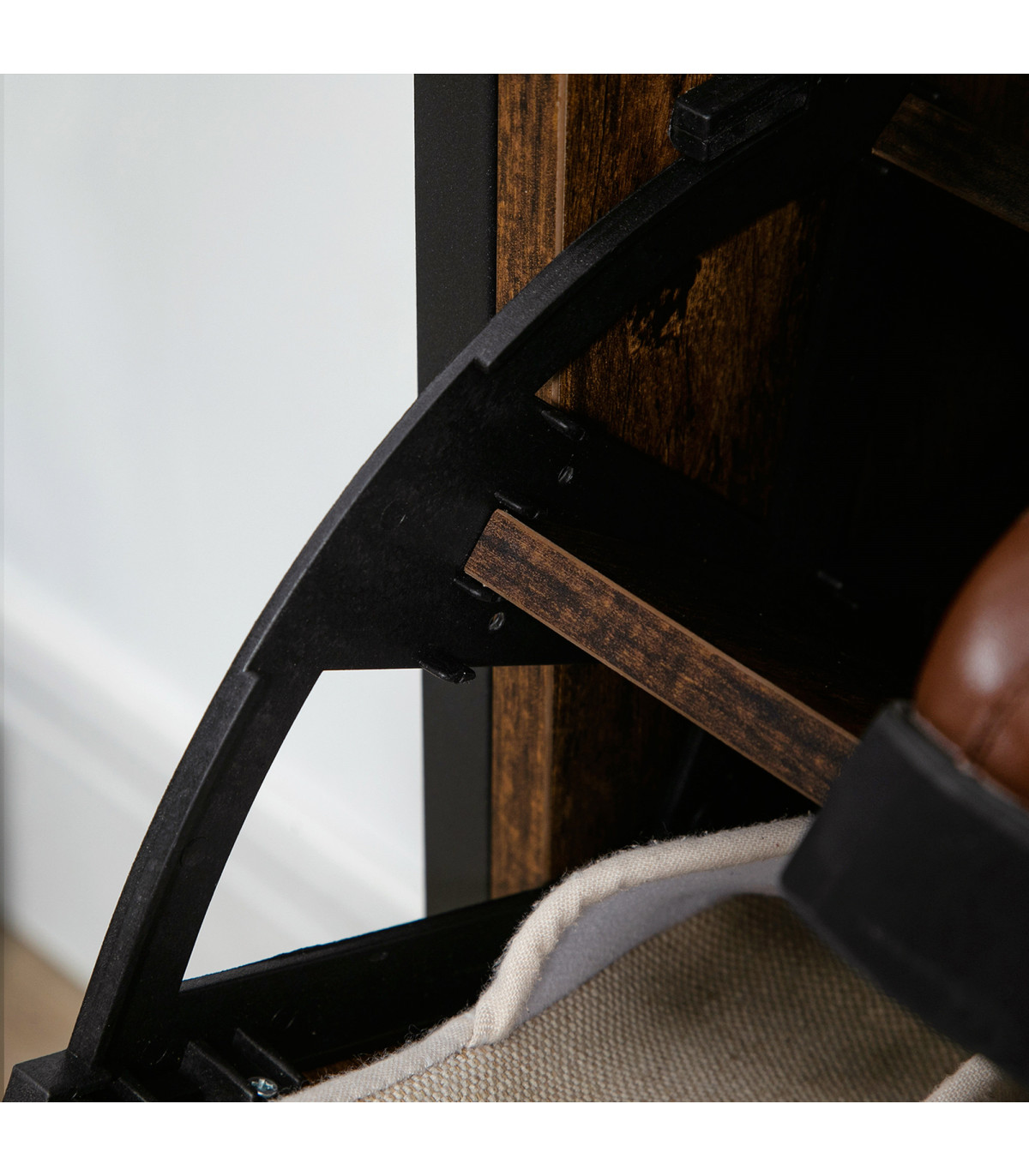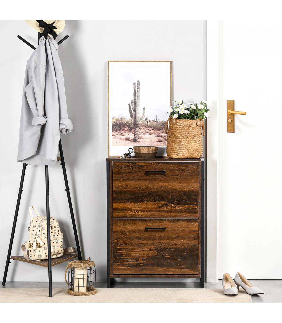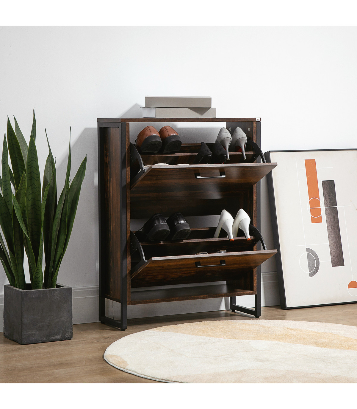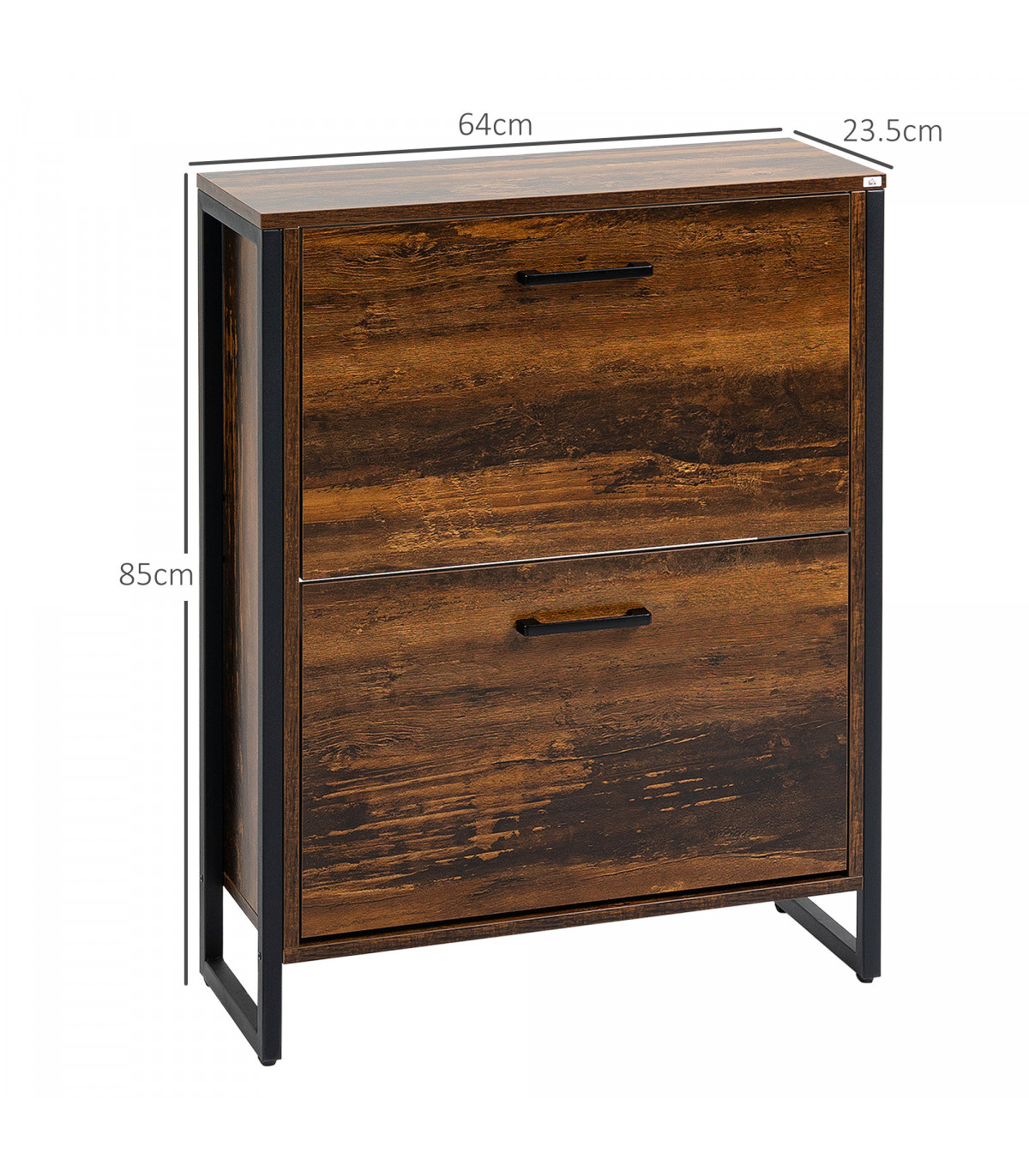 Store footwear with a dash of industrial charm - look to this HOMCOM shoe cabinet. The two flip door design offers room for up to 12 shoe pairs, making it ideal for single and shared use. A steel frame for a strong core, fitted with durable particle board panels in a beautifully classic dark wood effect. Narrow shoe cabinet comes with anti-tipping straps to secure it safely to a wall.