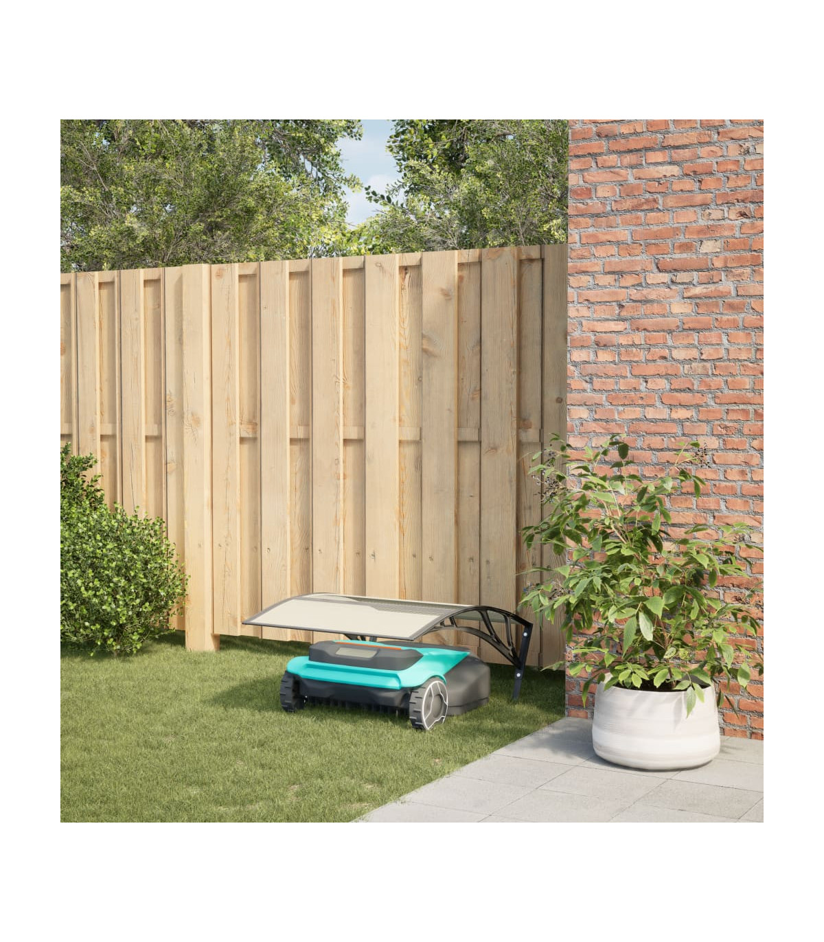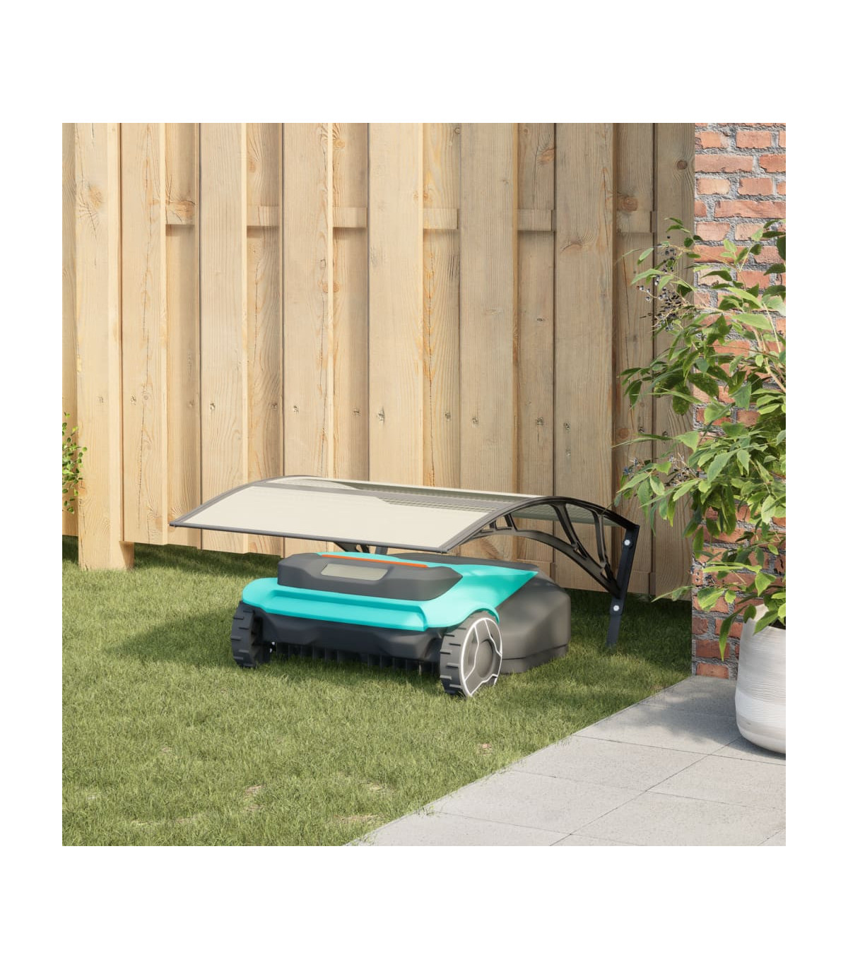This robot mower garage is the ideal parking place to station your garden robotic mower when it is not in use. Durable and long-lasting: This robot lawn mower garage consists of three PC sheets, two metal stands, two aluminium strips, as well as two brackets. It will provide a long time protection for your robot mower because of its durable and stable material.Weather protection: This robotic lawn mower garage provides the perfect protection for your lawn robot, shielding it from the elements including rain, hail, and UV light. Also, thanks to the sloping top design, rainwater and snow can simply flow down.Multifunctional: Whether it's on a lawn, paved surface, or concrete foundation, this lawn mower storage shed can be easily placed on any flat surface with the included mounting accessories.Easy to use: With the included anchors, the canopy for the robot lawn mower can easily be fixed on the lawn.