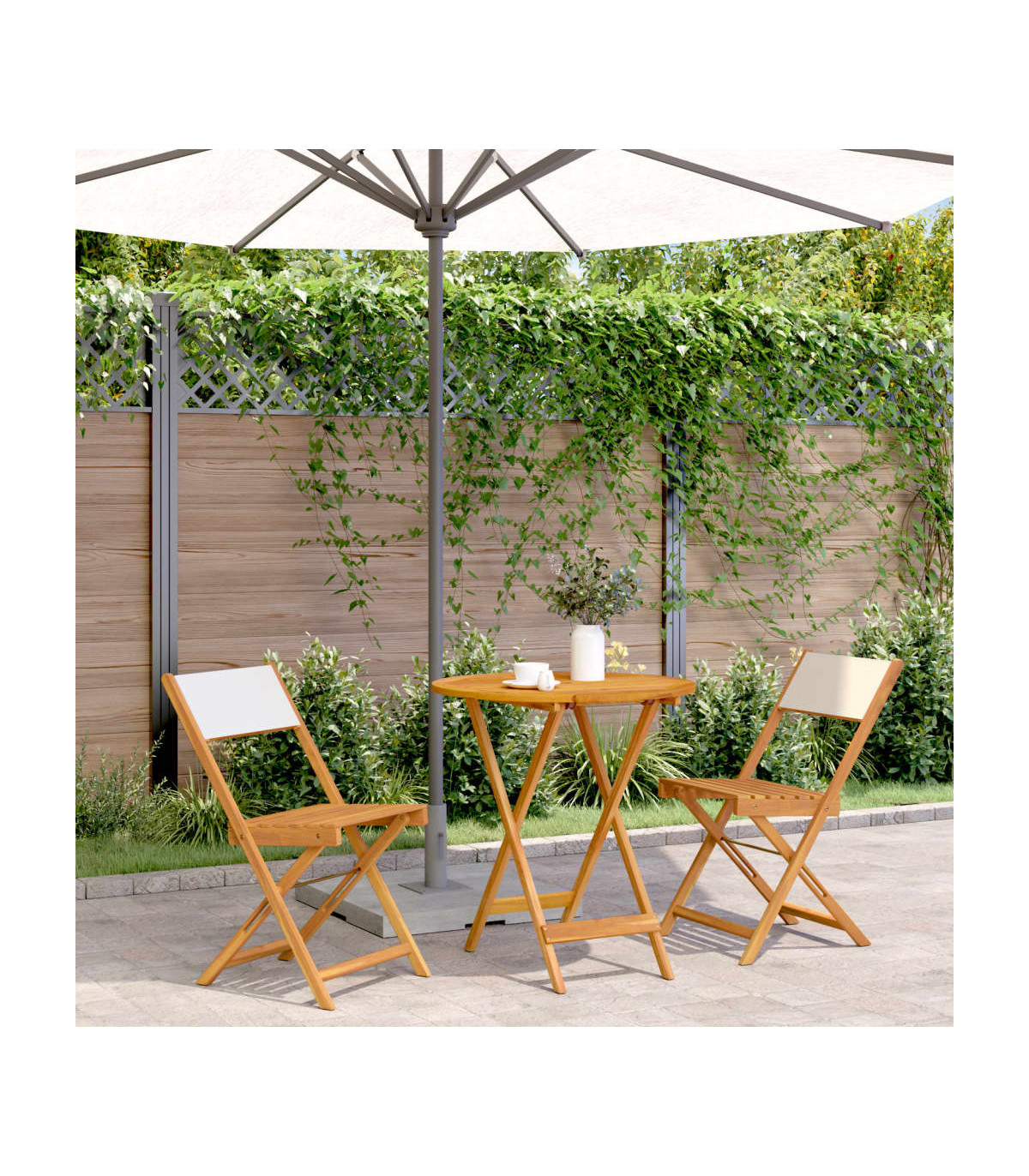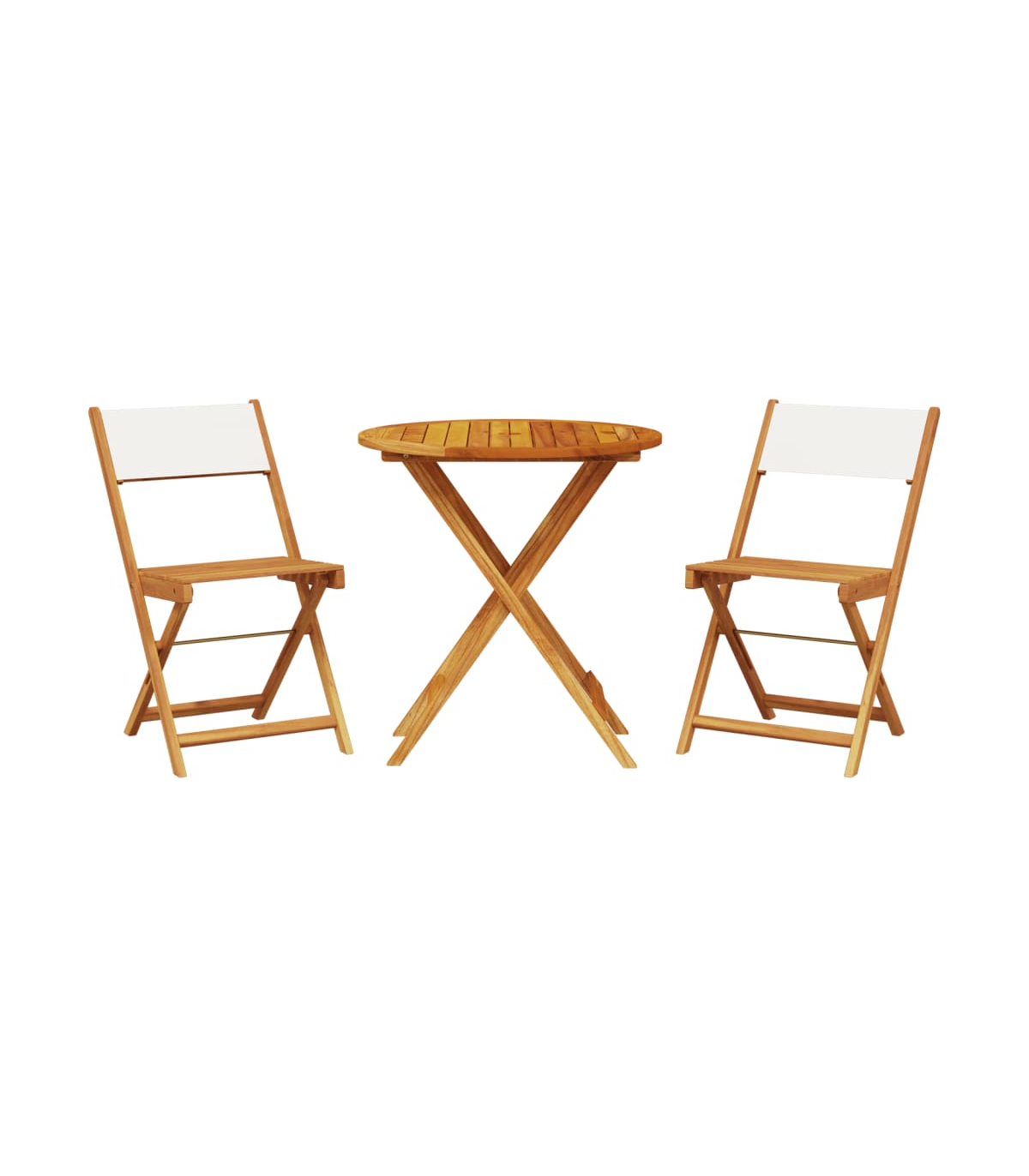 Enjoy a cup of coffee or have a chat with your family and friends in the garden, backyard, or on the balcony with this bistro set! Robust and stable: Solid acacia wood is known for its strength and durability. Its diverse colours and unique grain patterns give it an attractive appearance. With good stability and resistance to weathering, it is ideal for crafting indoor and outdoor furniture.Practical design: The outdoor chair eliminates the armrest design and only comes with a backrest, allowing you to have more freedom of movement while still enjoying a comfortable experience.Sturdy tabletop: The outdoor table offers excellent support for holding your drinks, snacks, fruit baskets, and your favourite decorations.Foldable design: The outdoor dining table and chairs can be easily folded away when not in use, for easy storage and transportation. Good to know:To make sure your outdoor furniture stays beautiful, we recommend protecting it with a waterproof cover.