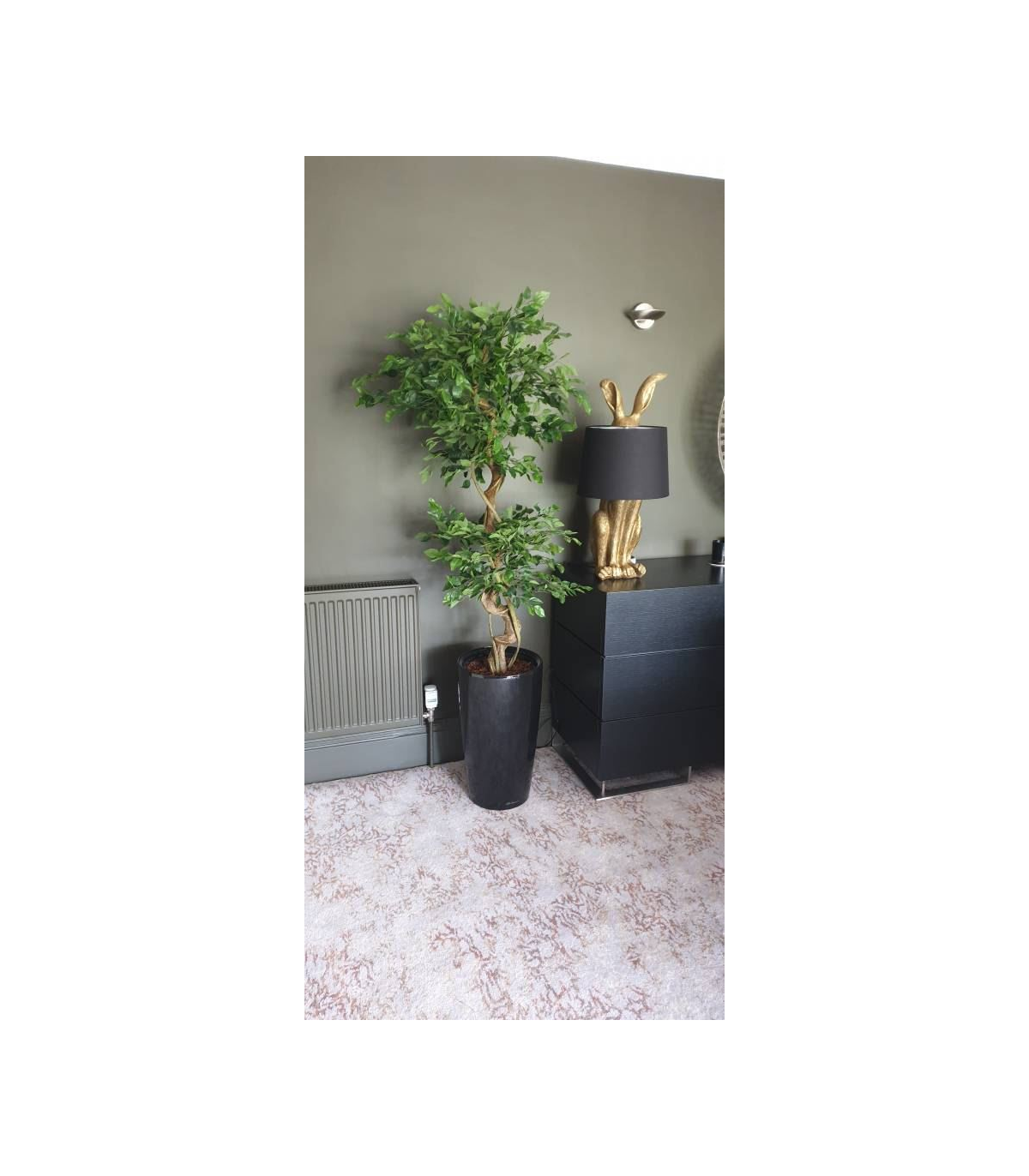 This 150cm artificial tree, with its stunning twisted trunk and lifelike leaf arrangements, is the epitome of elegance and sophistication. Perfect for adorning hallways, office buildings, and conservatories, it is part of our exclusive premium artificial range, boasting some of the most realistic trees available. The wired stems can be shaped to your liking. Delivered potted in a plain plastic pot, this tree is ready to be displayed. This high-quality plant from Botanik UK is a true statement piece.