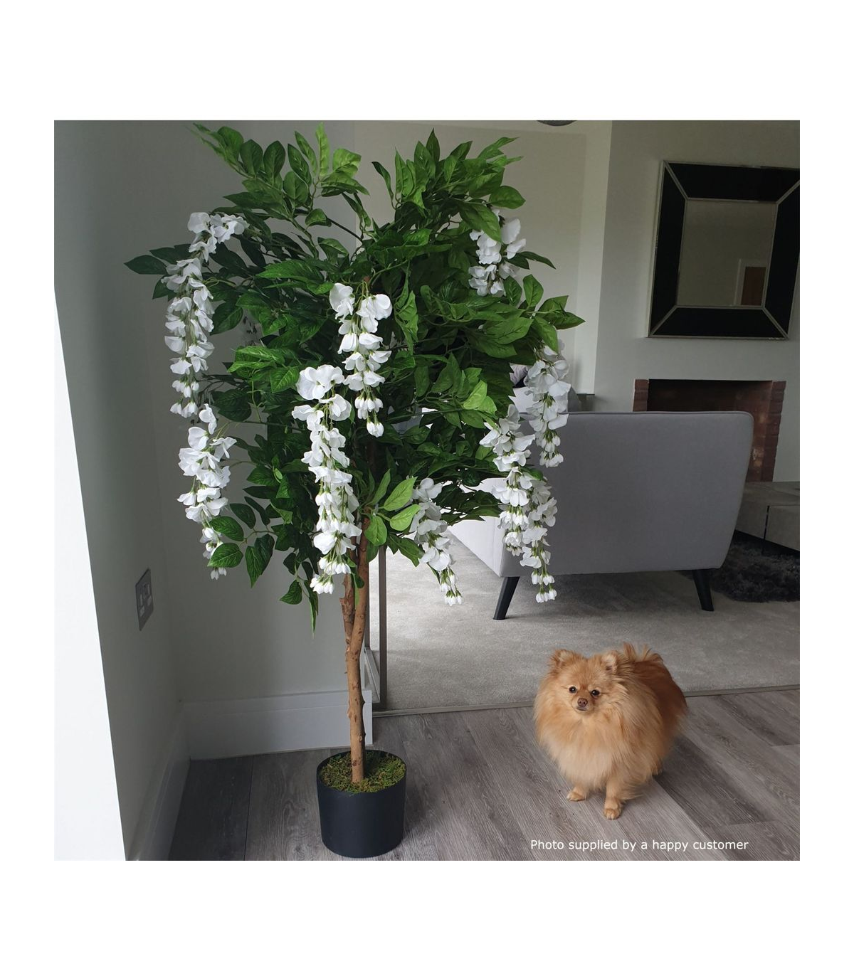 This exquisite 130cm Artificial Wisteria Tree in White Flowers is a part of our exclusive collection of artificial plants and trees. These stunning pieces are so lifelike that they are virtually indistinguishable from real plants, making them some of the most luxurious products we offer. The plant measures 130cm in height and 70cm in width, as displayed in our photos. The wired stems allow for easy adjustment to fit your space perfectly. With a real wood trunk, silk flowers, and silk leaves, this tree exudes elegance and sophistication. It comes fully potted in a moss-covered weighted plastic pot, which can be left as is or placed inside a decorative planter. The pot measures approximately 18cm in width and 15cm in height. For an even more realistic effect, these plants look particularly impressive when placed inside a larger planter and covered with bark, gravel, or soil.