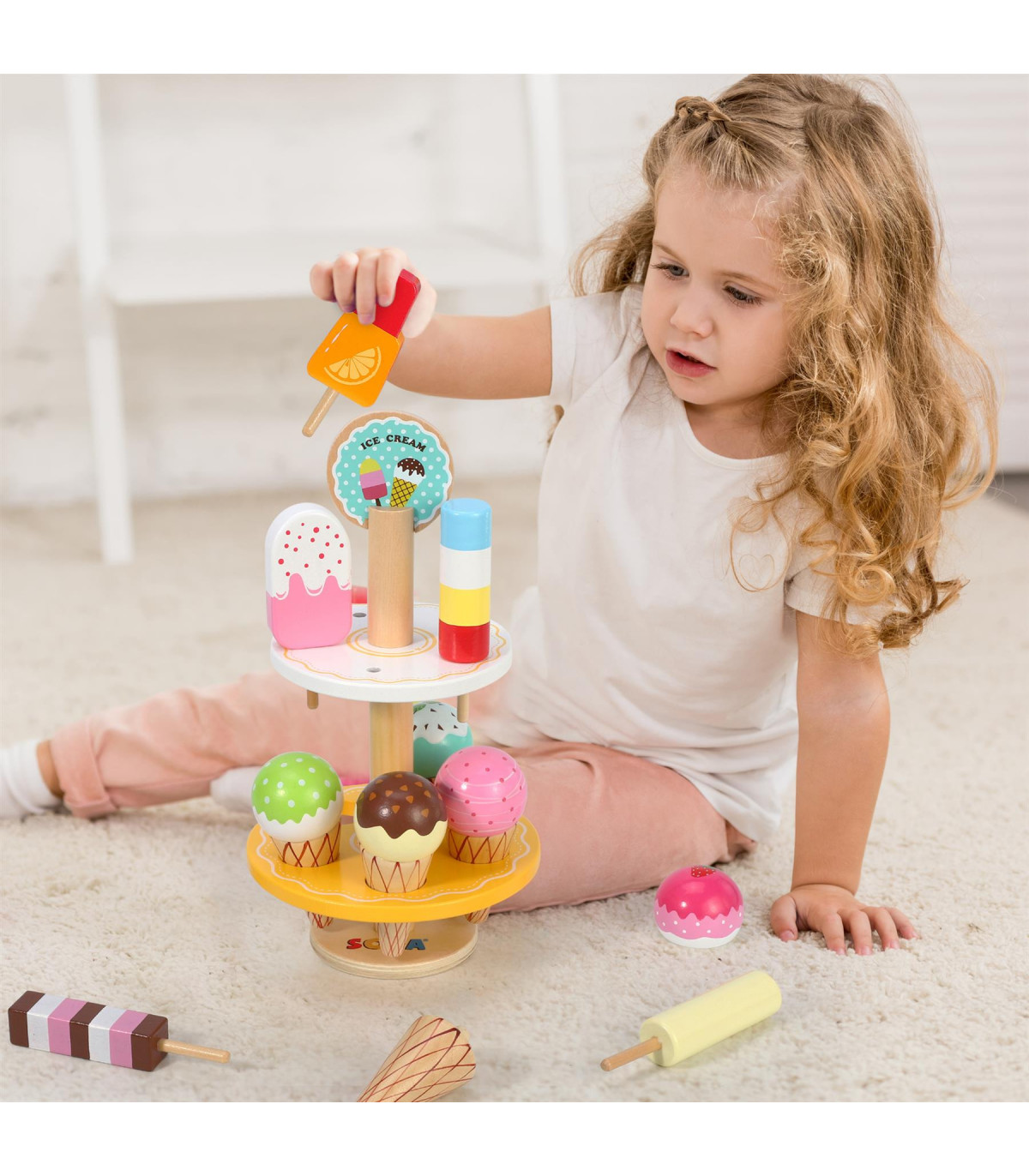 DELECTABLE SELECTION: Delightful ice lollies set includes 5 different flavoured ice cream, 5 waffle cones, 5 different flavoured lollies and a 2-tiered ice cream stand. This charmingly colourful toy set encourages children to lay out a place setting for a