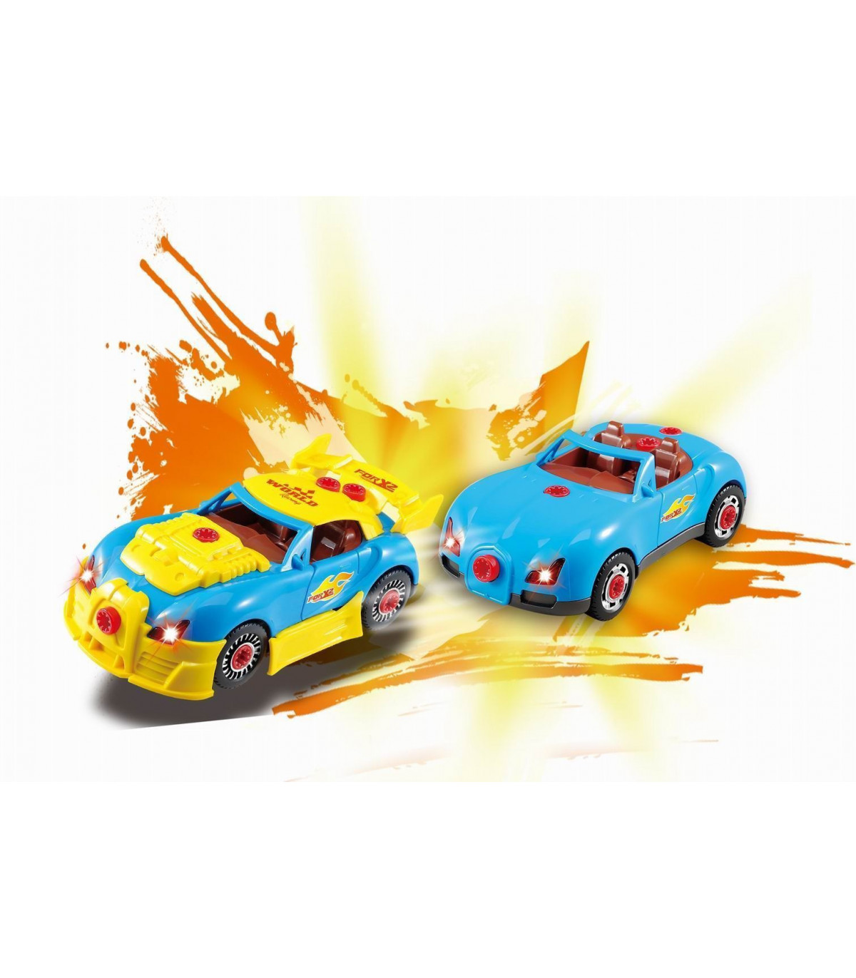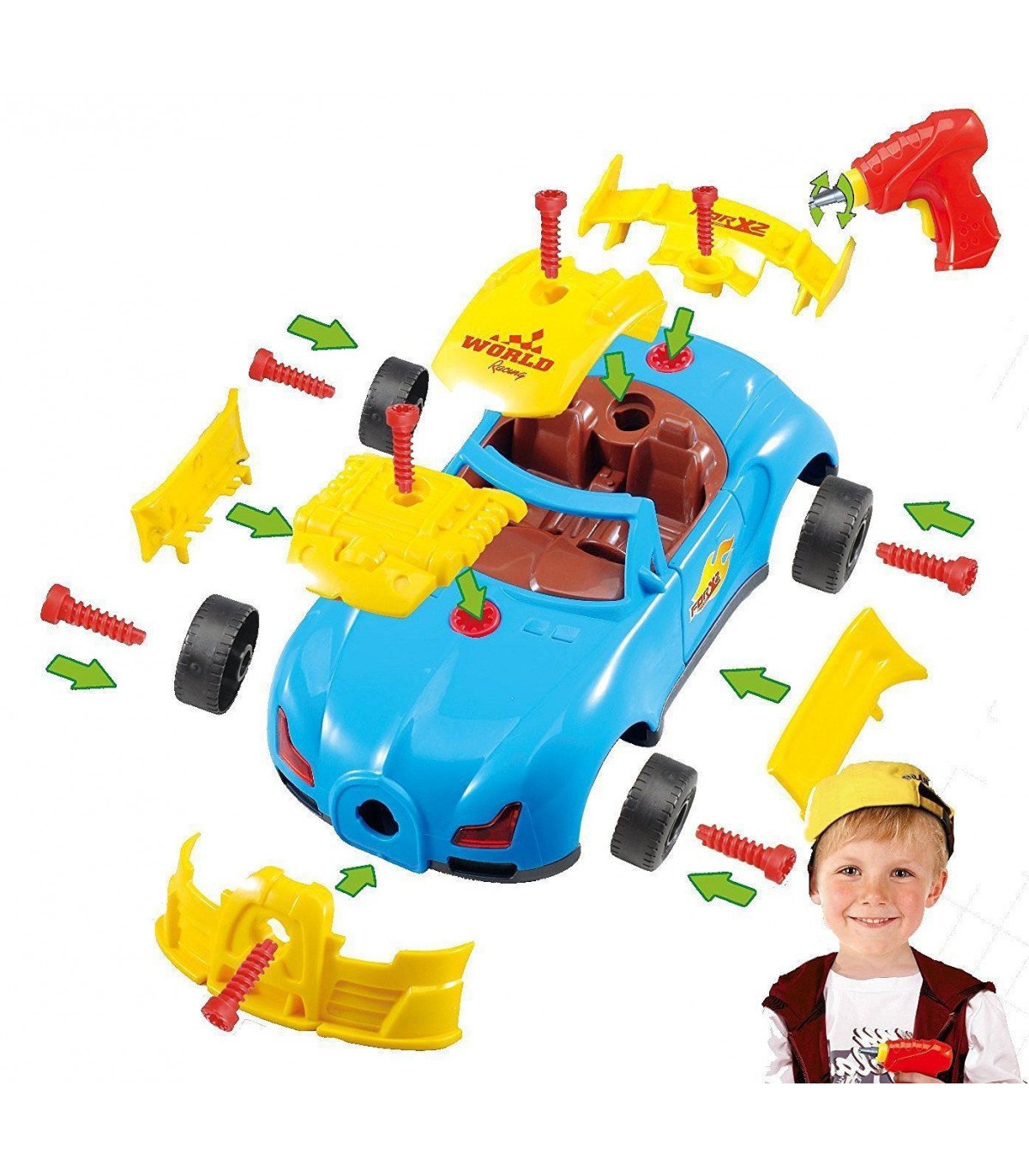 REALISTIC DESIGN: Comes with drill, screws and car parts. The screws are big and easy to use. The drill has realistic design and sound and it works like a real one. Also, the car lights up and makes realistic engine sounds with a shake. Kids can build a plain car or a sporty one with modification parts.