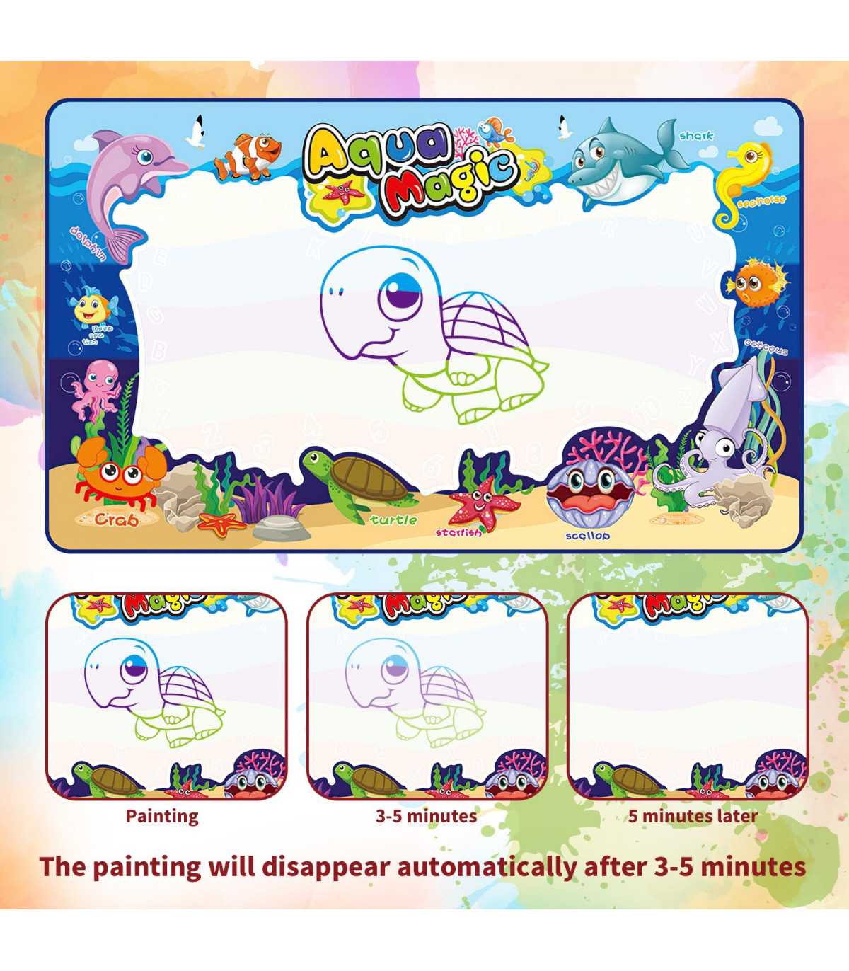 NO INK, NO PAINT, NO CRAYONS: Just fill the magic pen with clean water and start drawing on the drawing mat! The painting will disappear after 5-10 minutes (depending on the temperature and air flow), kids can draw on doodle board mat again and again. Brilliant for toddlers, the pens only work on the mat, so your kid cannot make any mess on carpets or walls.
