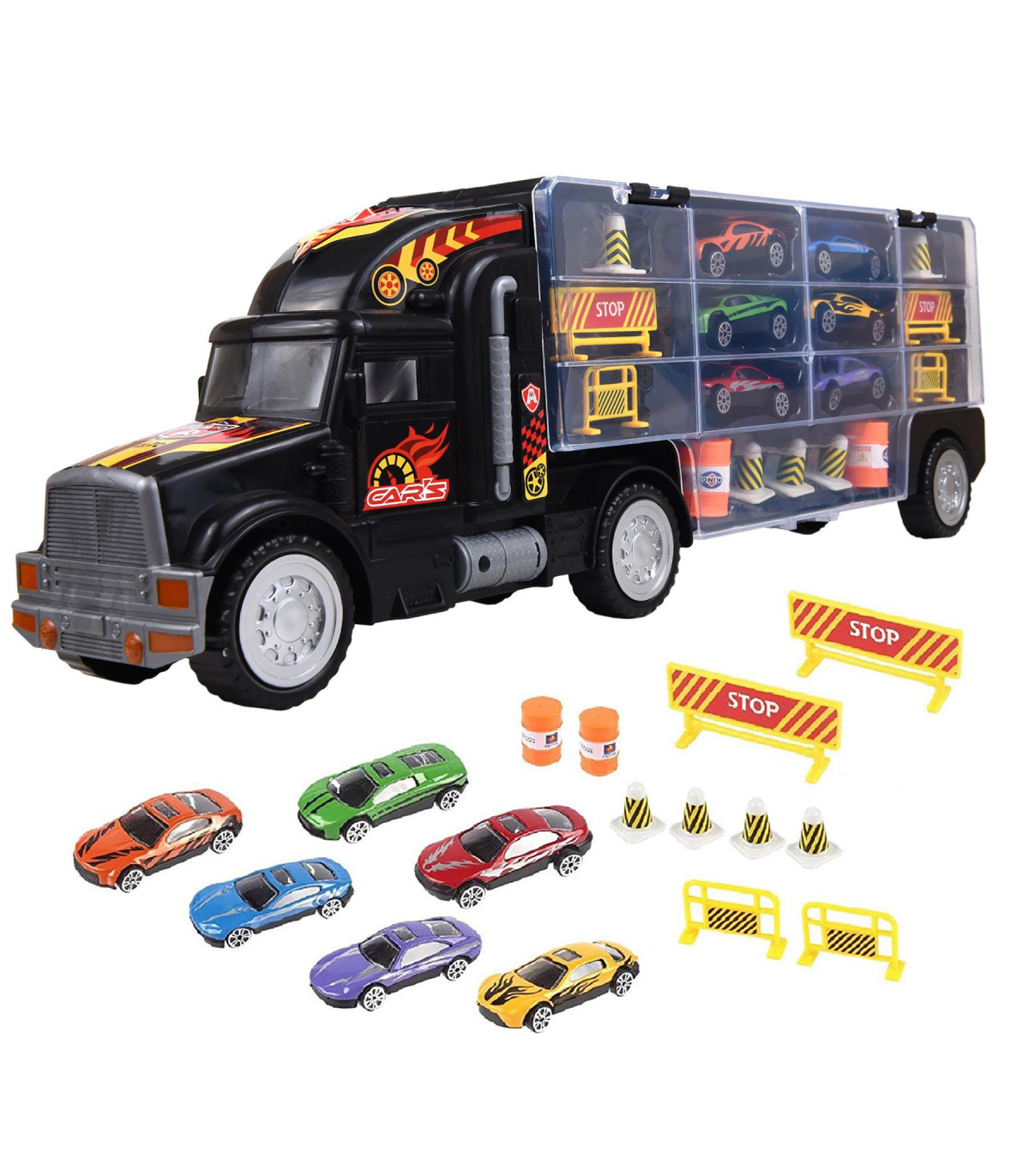 FITS HOT WHEELS, MATCHBOX CARS AND OTHER MINI CARS The transport carrier toy truck includes 6 die-cast metal cars and has space to carry up to 28 toy cars. Size of the truck for boys: 19" length x 6" height x 3.5" width.