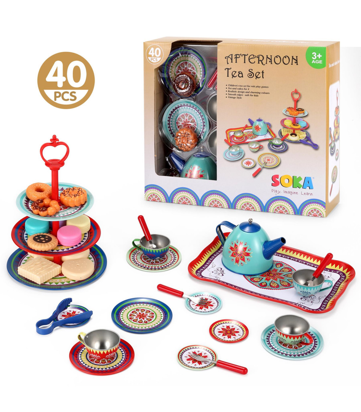 CLASSIC TEA SET FOR KIDS: SOKA Vintage style afternoon tea set is an ideal toy for role play games. Kid’s can throw an evening tea party with friends or enjoy a tea session with teddies in pretend play games. REALISTIC DESIGN: This charmingly colourful t