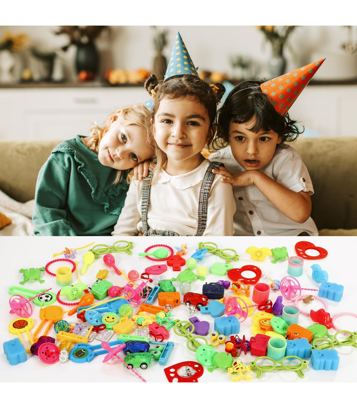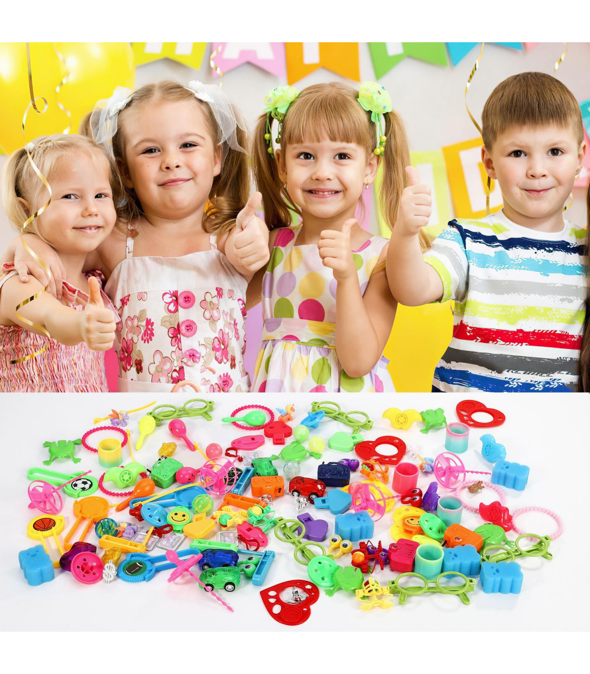 COMPREHENSIVE PARTY PACK: 5 pieces each of Pull Back cars, Dollar Rings, Emoji Whistles, Heart Whistles, Lip Whistles, Jumping Frogs, Maracas, Key Rings, Spectacles, Bouncy Balls, Spin Clickers, Slinky, Heart Shape Tools, Mini ball launchers, Wiggly Eyes, Spinners, Bracelets, Flying disks, Mini Cameras, Sponges, Table top Spinners, Put-together mini unicorns, assorted put-together animals, Mini bear sponges