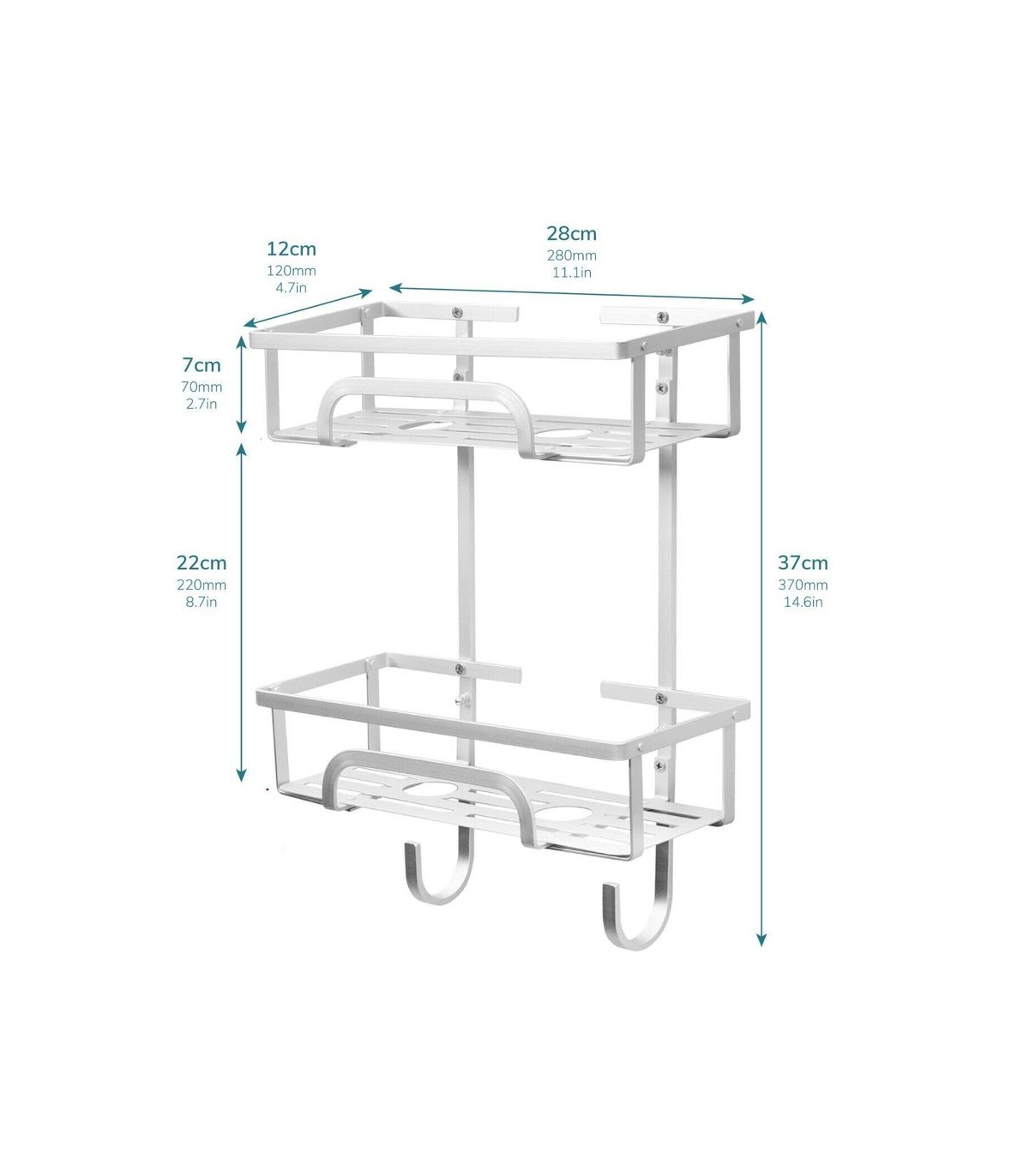 Our 2 Tier aluminium shower caddy has been designed for great storage and installation with ease. The stylish design features 2 shelves and 2 hooks at the bottom for hanging your loofah or shower puff. To install the shower caddy there are 4 adhesive pads which will adhere to tiles, walls, wood, metal, glass and more... Then the shower caddy is simply hooked into place. Dimensions: H 37cm x W 28cm x D 12cm