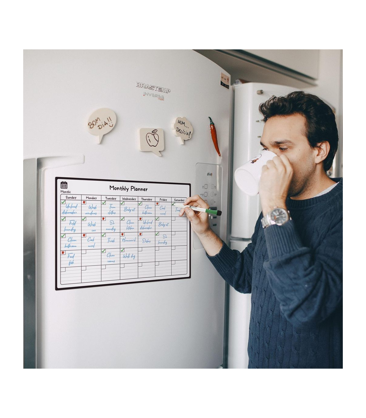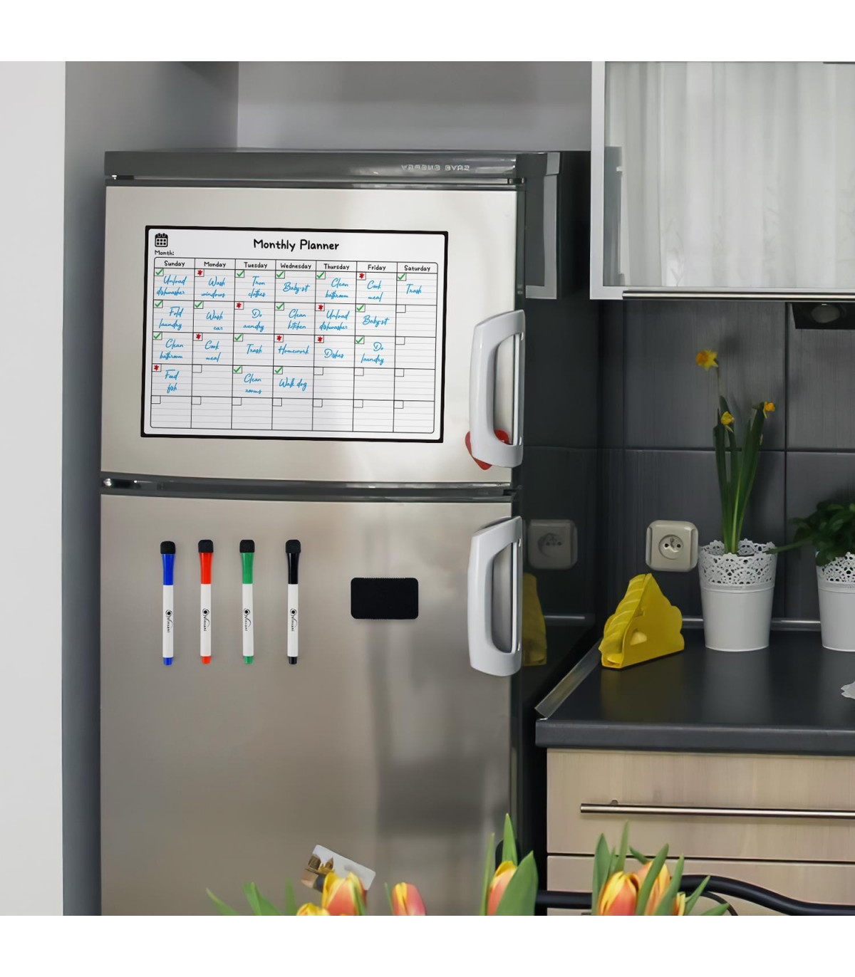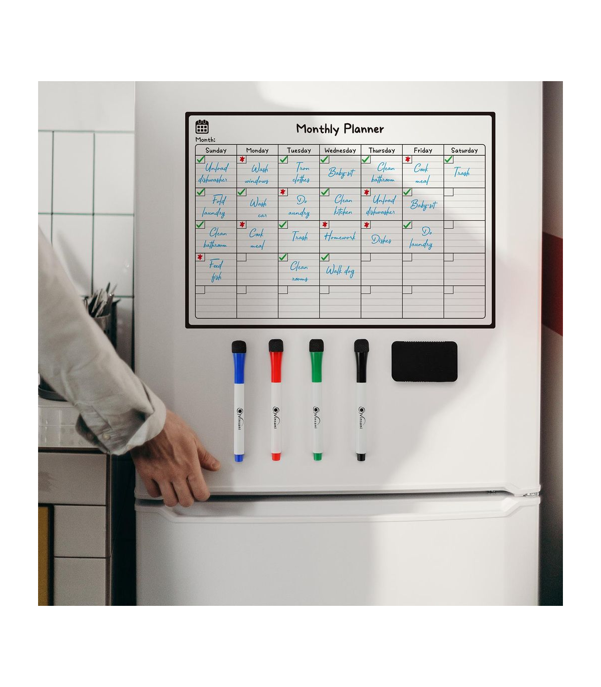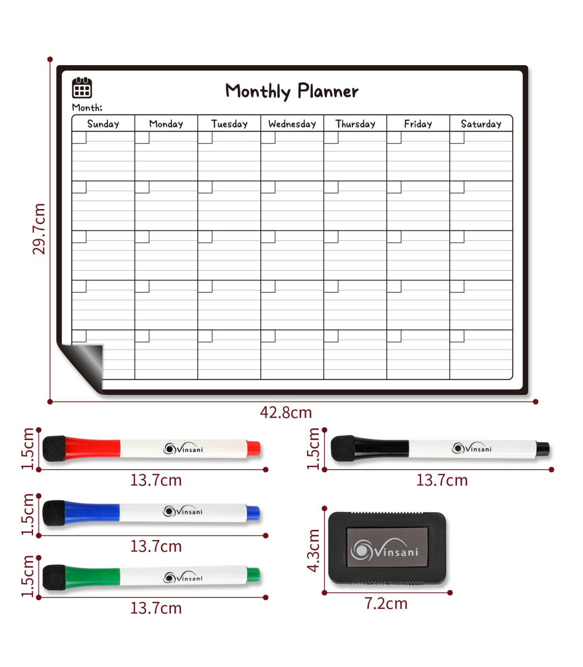 BE ORGANISED: Perfect for all ages, organise your tasks on a monthly basis, Kids after school clubs, tuition, appointments, household chores, monthly shopping. Its a great reminder to organise your month, and highlight important events. VERSATILE DESIGN: A multifunctional magnetic whiteboard designed to be a monthly planner and organiser. The whiteboard is suitable for use in a variety of environments from home to office. Can be displayed on any magnetically receptive surface, turning it into a place to store useful notes and reminders. SET INCLUDES: 1 x magnetic whiteboard, finished with our premium gloss, 4 x Magnetic dry pen with eraser and 1 x magnetic eraser block. HIGH QUALITY: Made from finest materials so you can be sure that the Vinsani magnetic whiteboard will have several years of use with proper care. DIMENSION: The whiteboard measures 42.8 x 29.7 cm