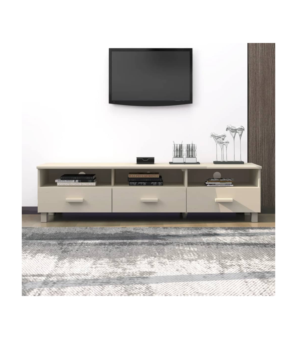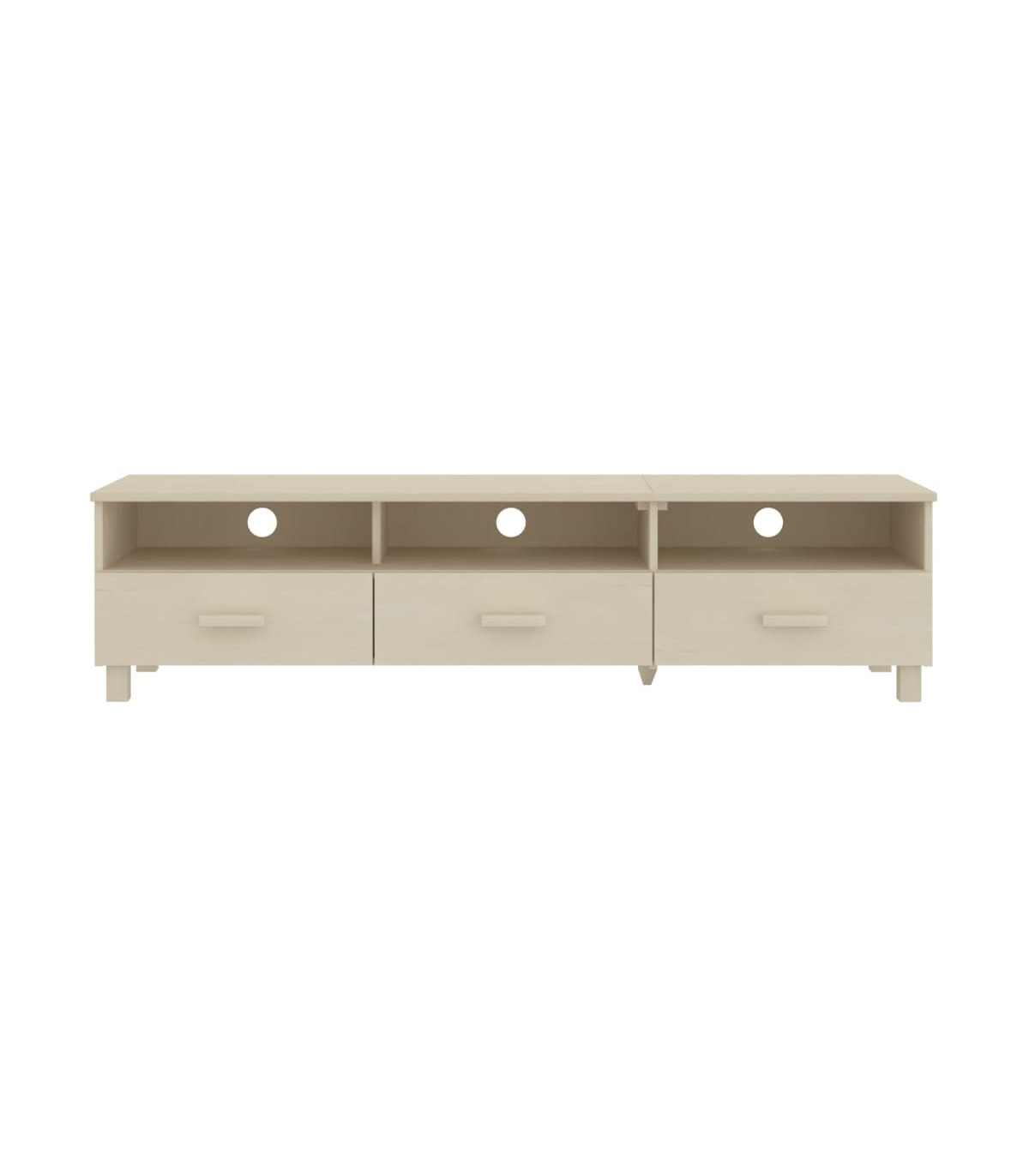 This wooden TV cabinet makes a decorative and practical addition to your decor. The TV stand is made of solid pinewood, making it stable and sturdy. The TV unit has 3 smooth sliding drawers and 3 compartments, providing ample storage space for keeping your multimedia appliances, books and other items well organised and within easy reach. The sturdy tabletop is perfect for displaying decorative objects, photo frames, and potted plants. Thanks to the slot at the back, you can hide the power cords behind the cabinet to keep them out of sight.