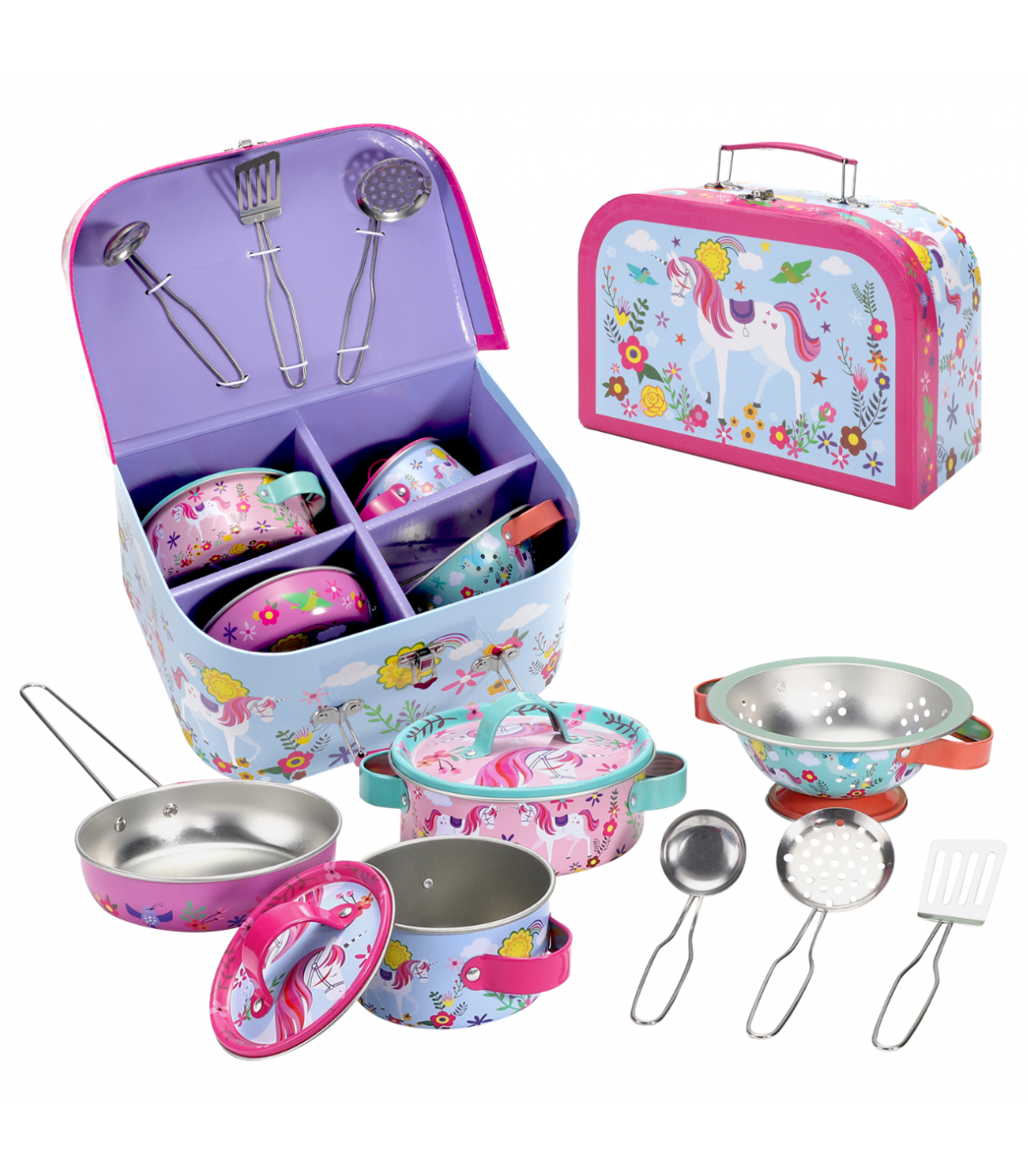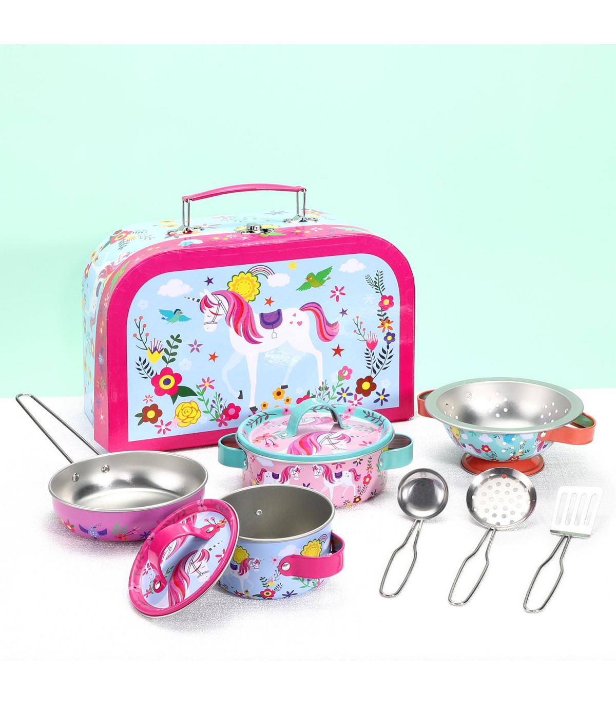 ADORABLE KITCHENWARE SET WITH CUTE AND COLOURFUL UNICORN ILLUSTRATIONS: It's a perfect fun toy-playset for children to throw a dinner party or picnic of their dreams! Each piece comes with a lovely illustration little kids will love! COMES PACKED IN A FUN
