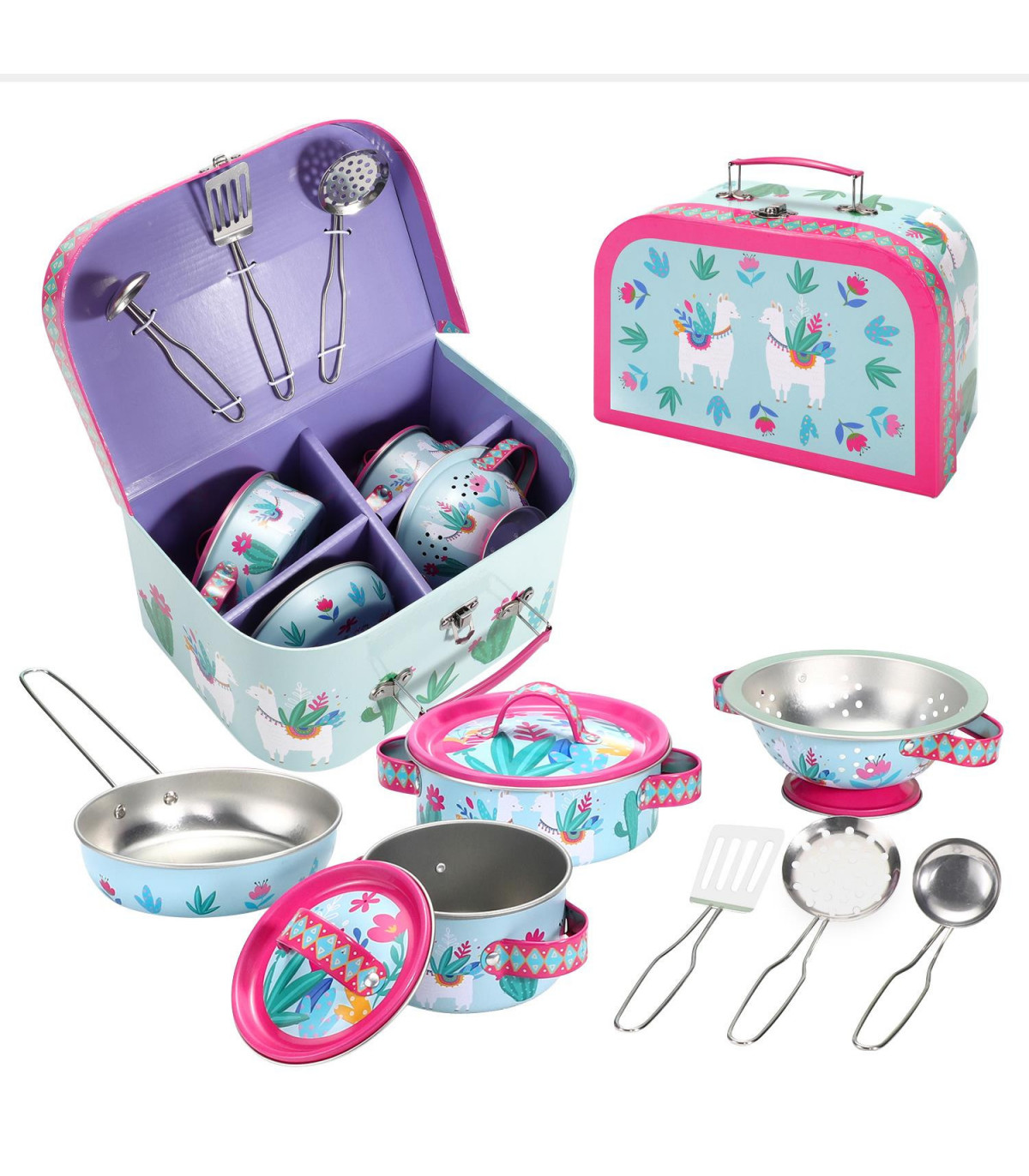 ADORABLE KITCHENWARE SET WITH CUTE AND COLOURFUL LLAMA ILLUSTRATIONS: It's a perfect fun toy-playset for children to throw a dinner party or picnic of their dreams! Each piece comes with a lovely illustration little kids will love! COMES PACKED IN A FUN MATCHING CARRY CASE. The tea set is neatly packed in a robust reinforced laminated carry case with matching illustrations. CASE DIMENSION: 19.5 x 24 x 12 cm FULL 10 PIECE KIDS KITCHENWARE SET: Enjoy a cooking for little guests as this play set comes complete with 2 different sized pans with lids, a frying pan, colander and 3 kitchen utensils. HOURS OF IMAGINATIVE PLAY TIME: SOKA kitchenware Set is a great learning toy encourage little ones to learn via role play and develop their social skills, dexterity and imagination! SAFE & EASY TO PLAY: Made with high quality materials, this tea set has smooth rounded edges which ensure kids can enjoy hours of role play safely.