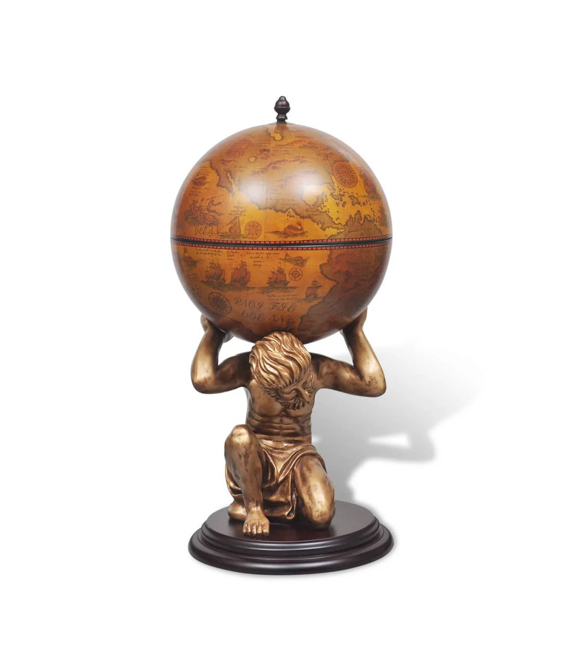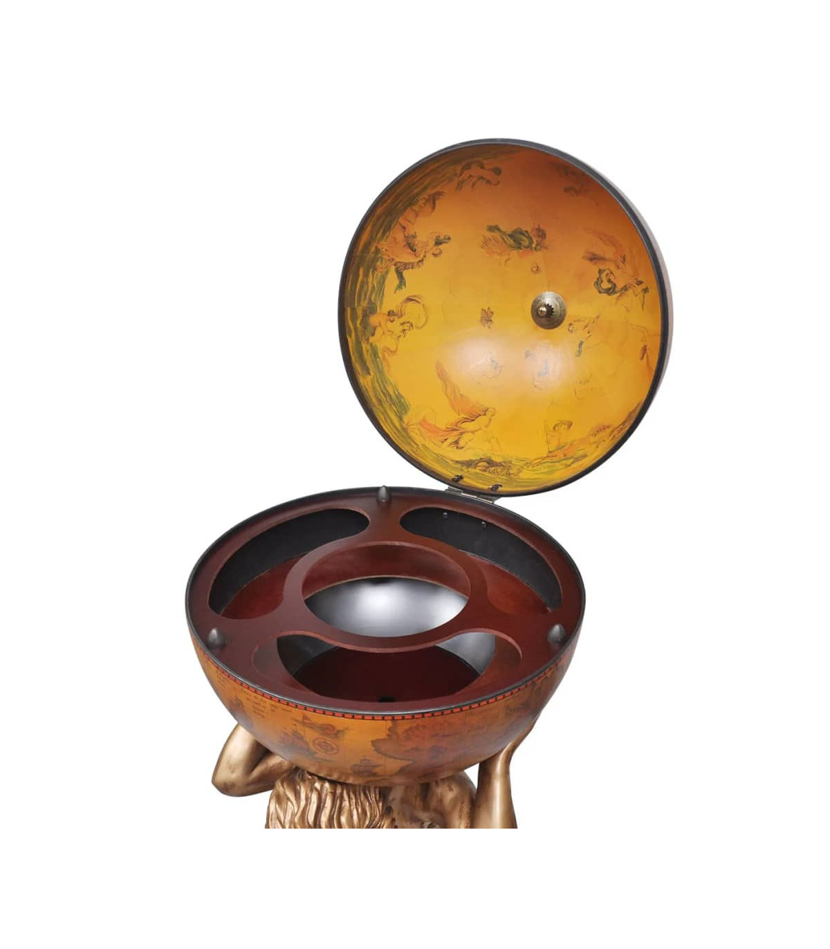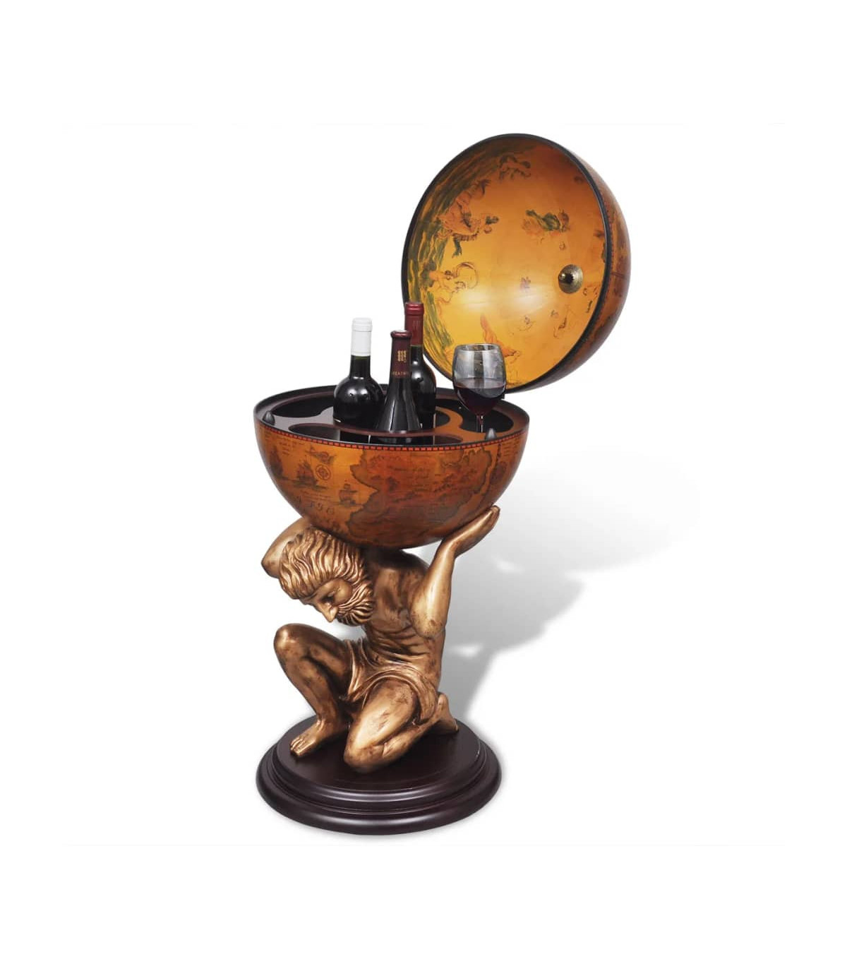 Wow your quests with your sense of style by serving them wine and spirits from this highly decorative globe bar! The globe bar will be ideal for storing and organizing several bottles and glassware. The globe is adorned with an old-fashioned map pattern, while the stable support, crafted from durable, high-quality MDF, is shaped like the mythological figure Atlas. This globe bar/ wine cabinet is a perfect combination of practicality and aesthetics. Please note that spirits are not included in delivery.