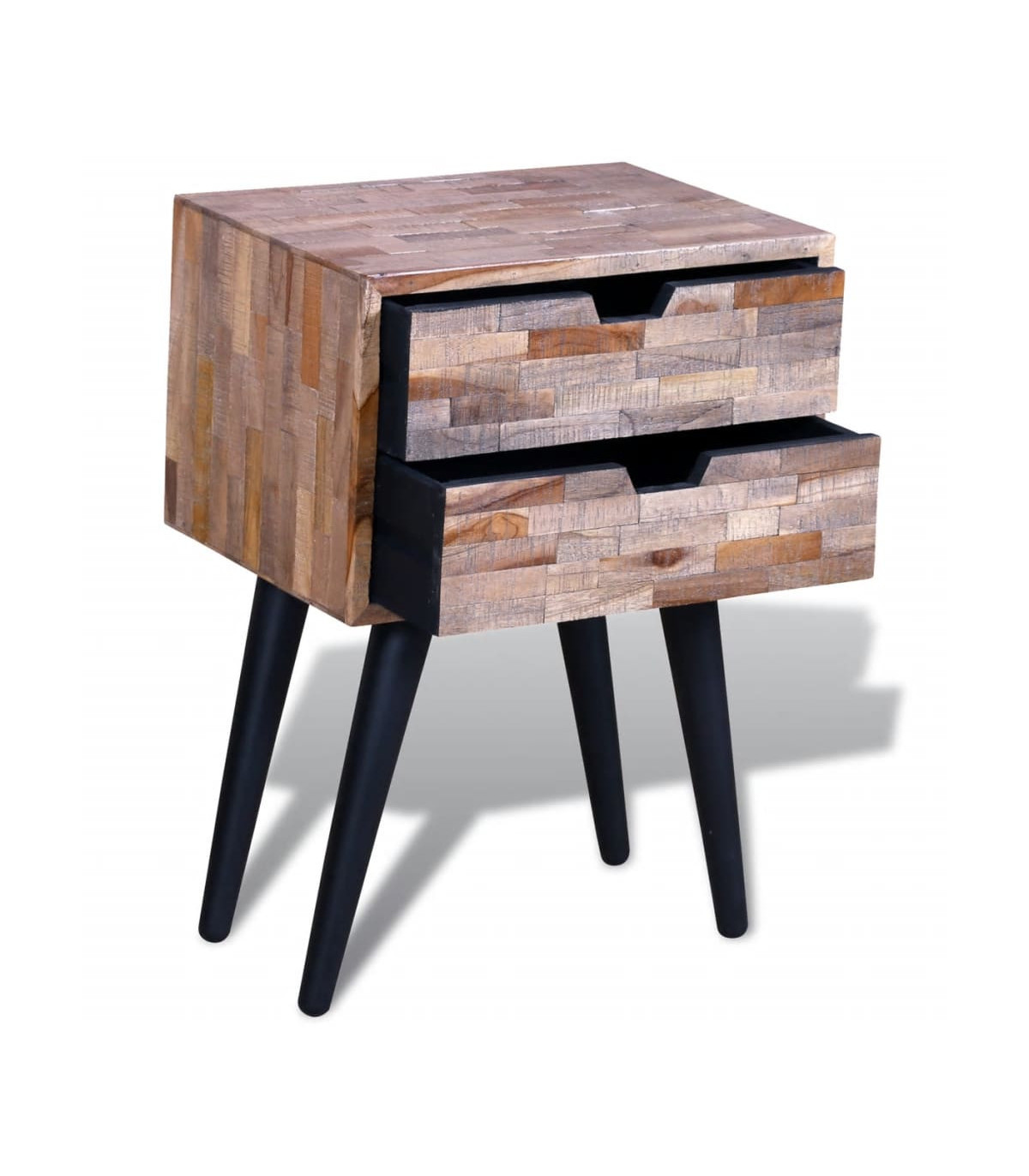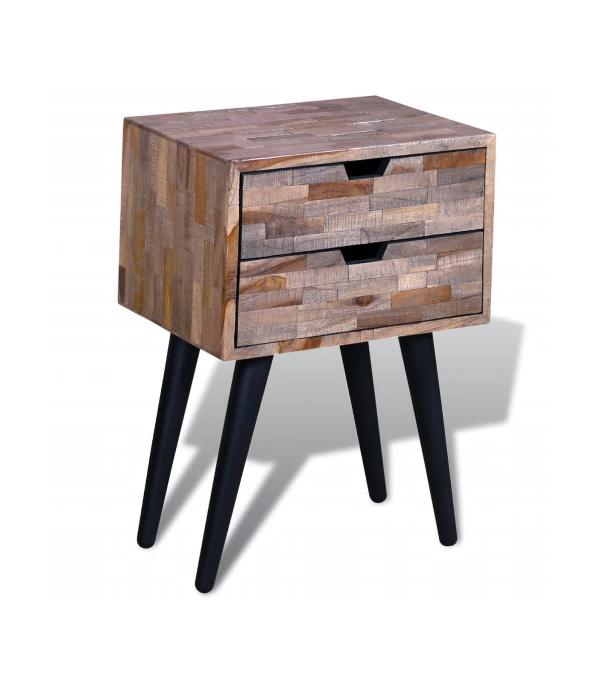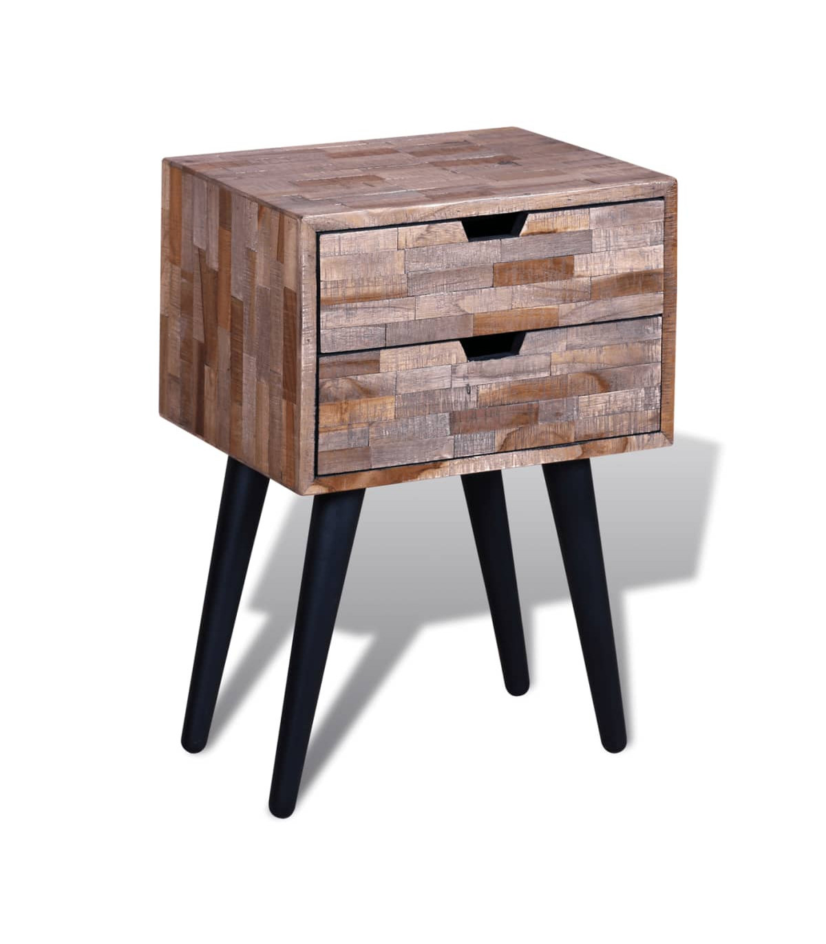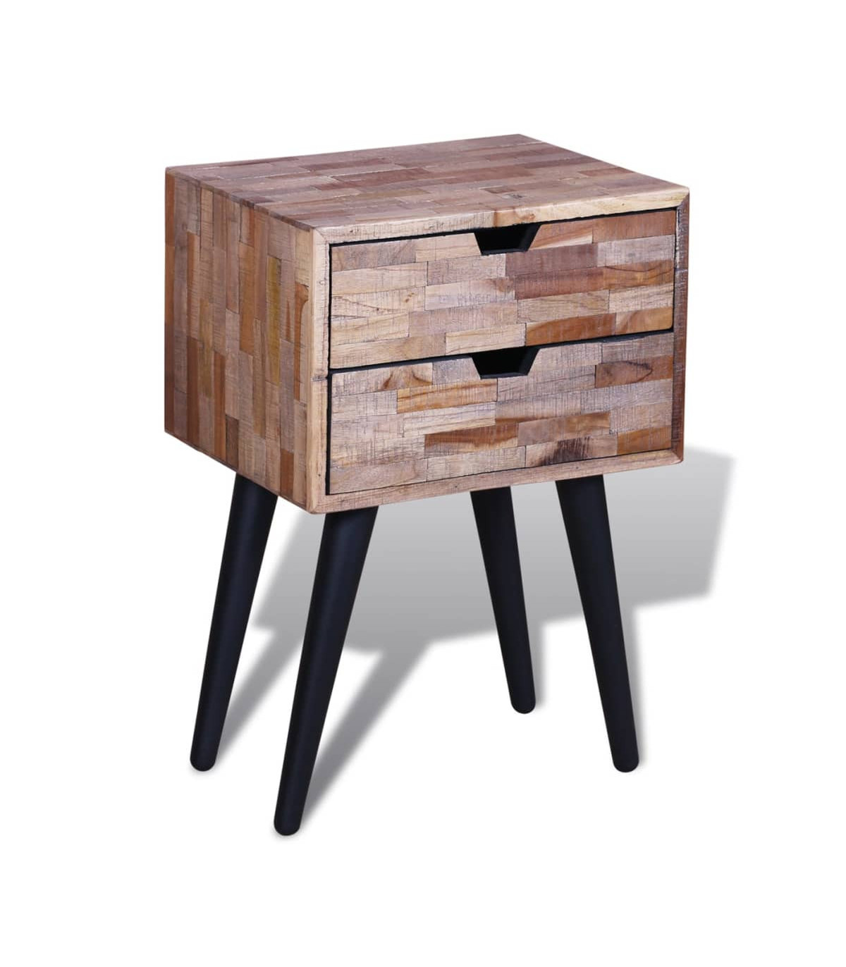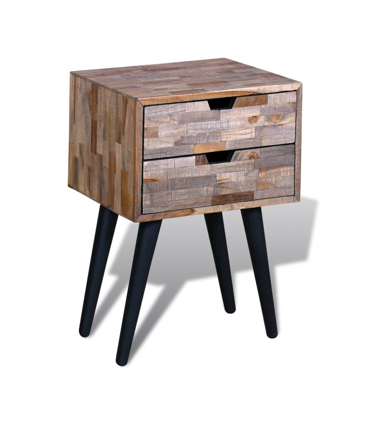 This vintage wooden bedside cabinet is not only stylish, but also very practical with its two spacious storage drawers. It can also be used as console cabinets, console tables, sideboards, side tables, etc. It will make great addition to your bedroom. This bedside cabinet is made of reclaimed wood, which means that every piece of furniture is unique and slightly different from the next. Reclaimed wood is solid, stable, durable and beautiful. It is partly handmade, and the craftmanship adds to the unique vintage style of the bedside cabinet. Great care is taken at every step of the production process, be it recombining, polishing and painting. Important note: Colours vary from piece to piece, making each of our bedside cabinets unique; the delivery is random.