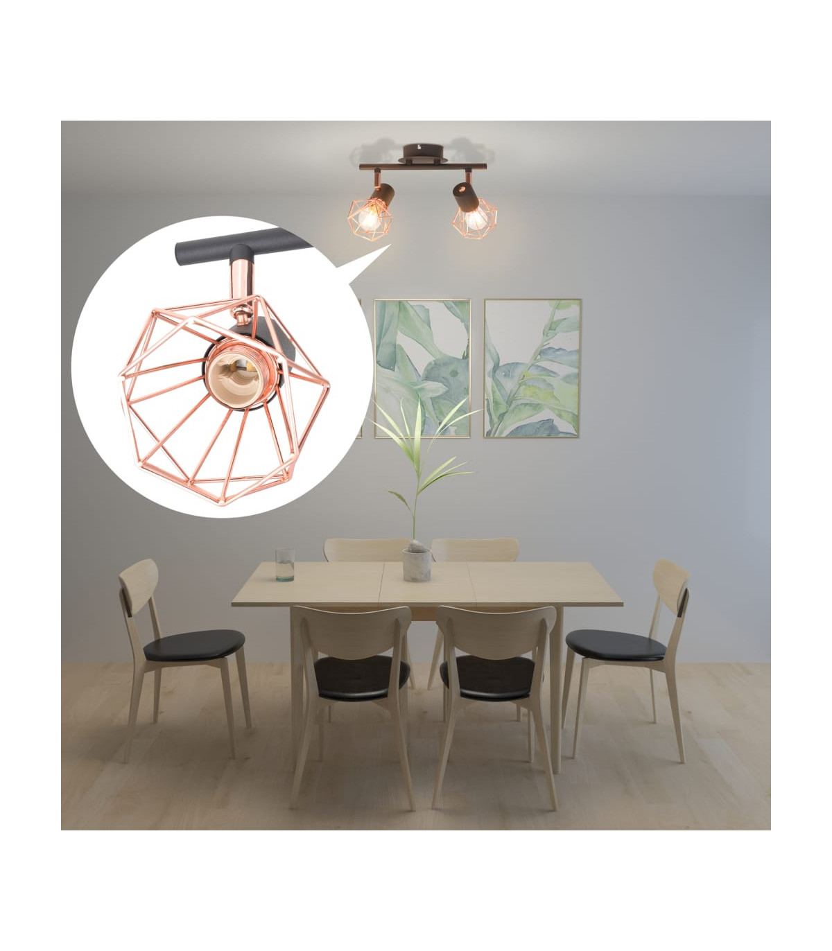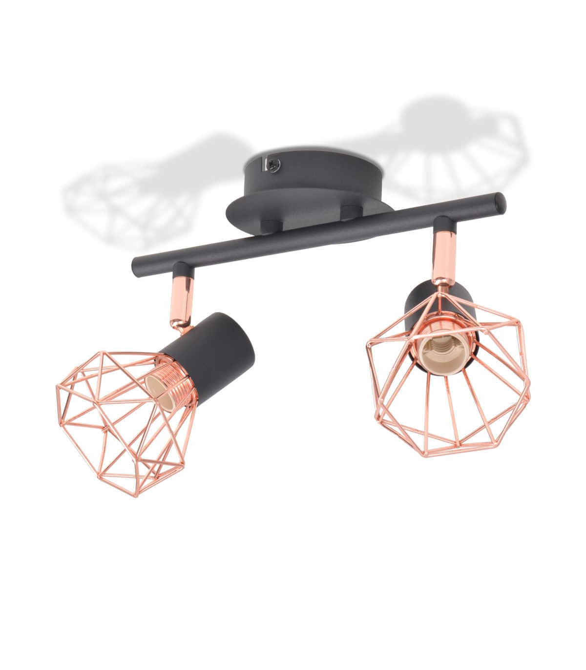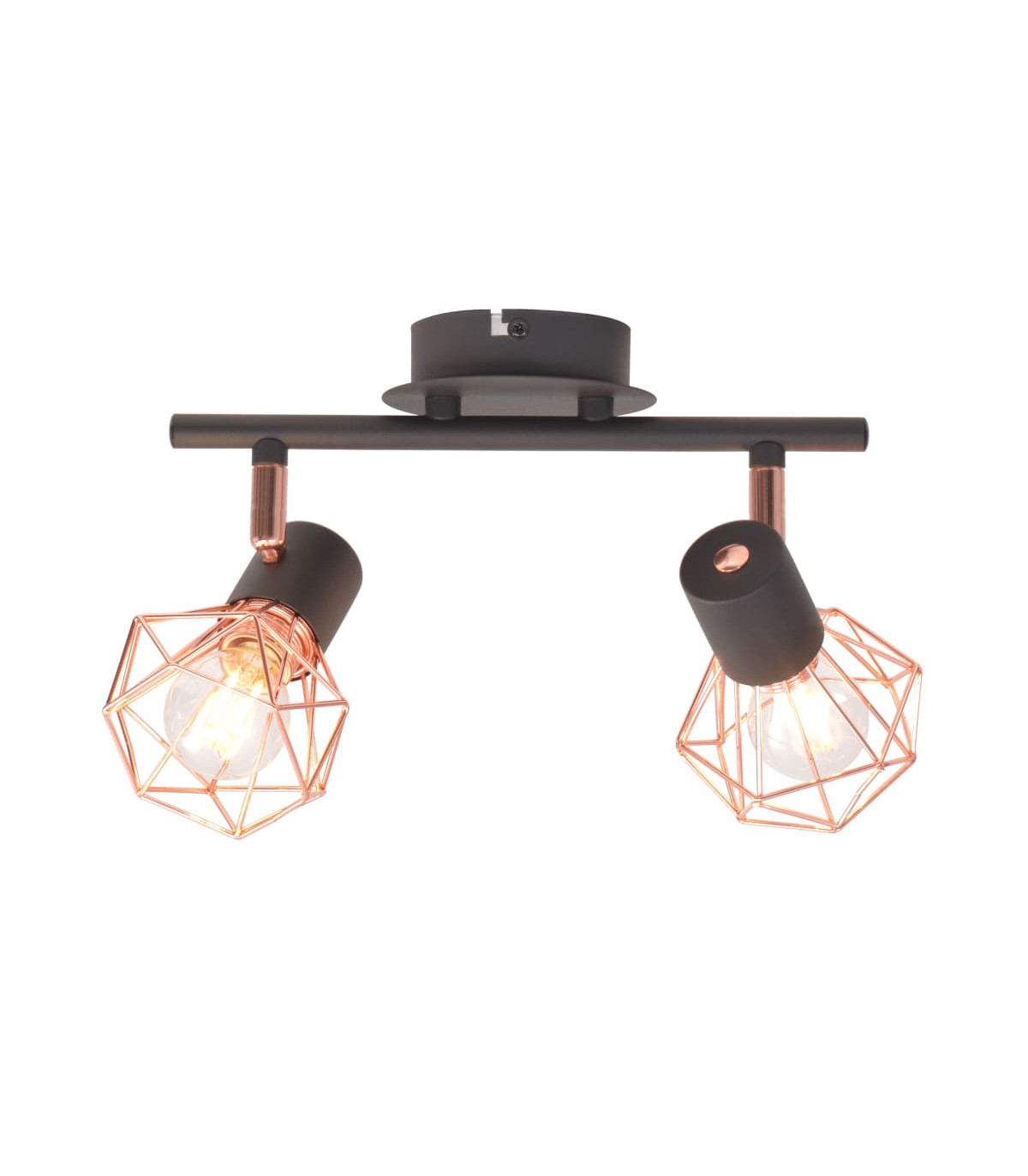 Give your decor a touch of industrial style with this fantastic ceiling lamp. The lamp features 2 unique, geometrical metal wire shades in a beautiful copper colour, and will make a decorative addition to any decor. Thanks to its high-quality metal base, this lamp can be easily mounted on the ceiling. The spotlights can be adjusted as desired. This luminaire includes 2 LED filament bulbs that emit a warm white light and have a beautiful retro look. The warm white light is conducive to a relaxing and pleasant ambience. Thanks to its low power consumption, this designer lamp is very energy efficient and thus eco-friendly. Delivery includes 1 ceiling lamp and 2 LED filament bulbs.
