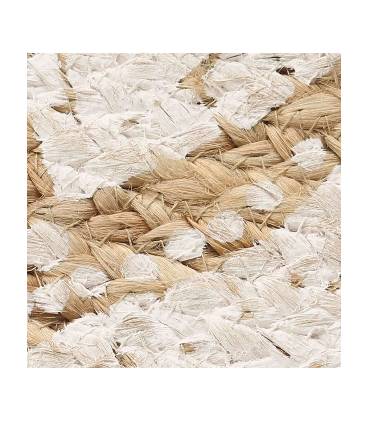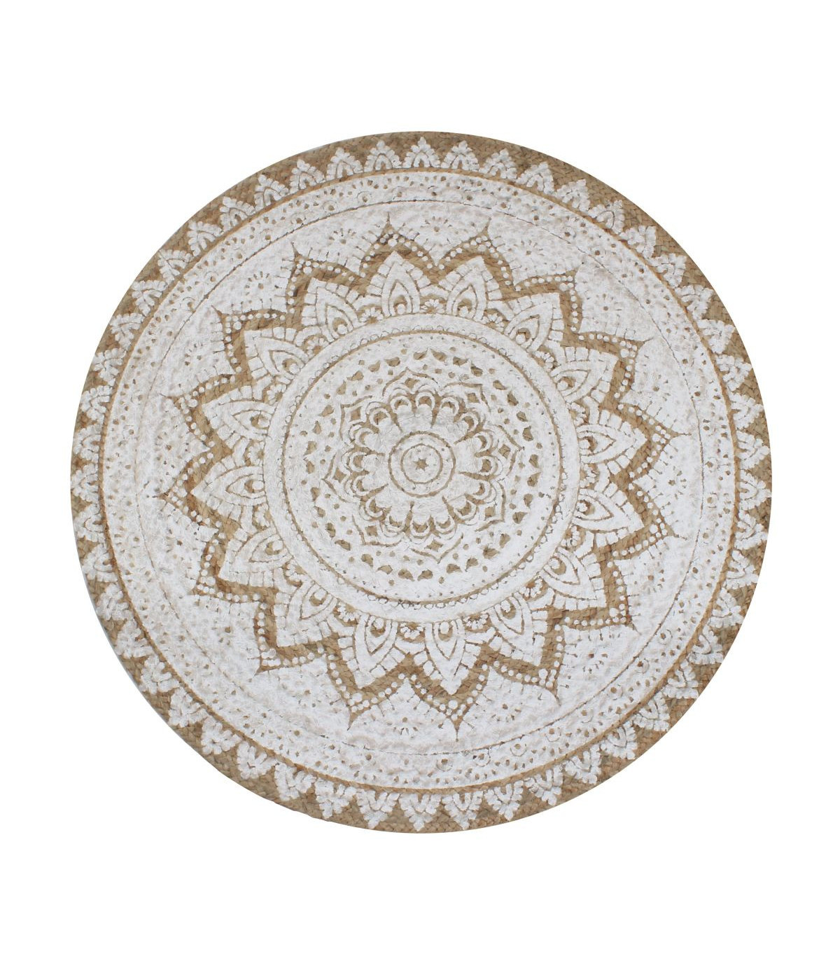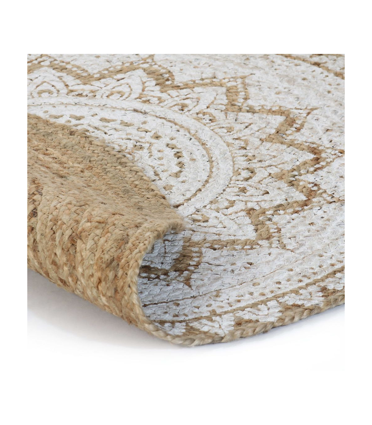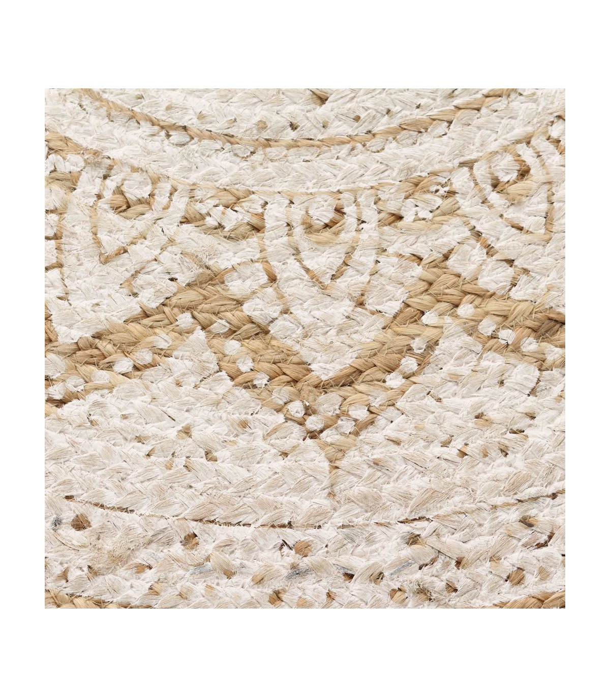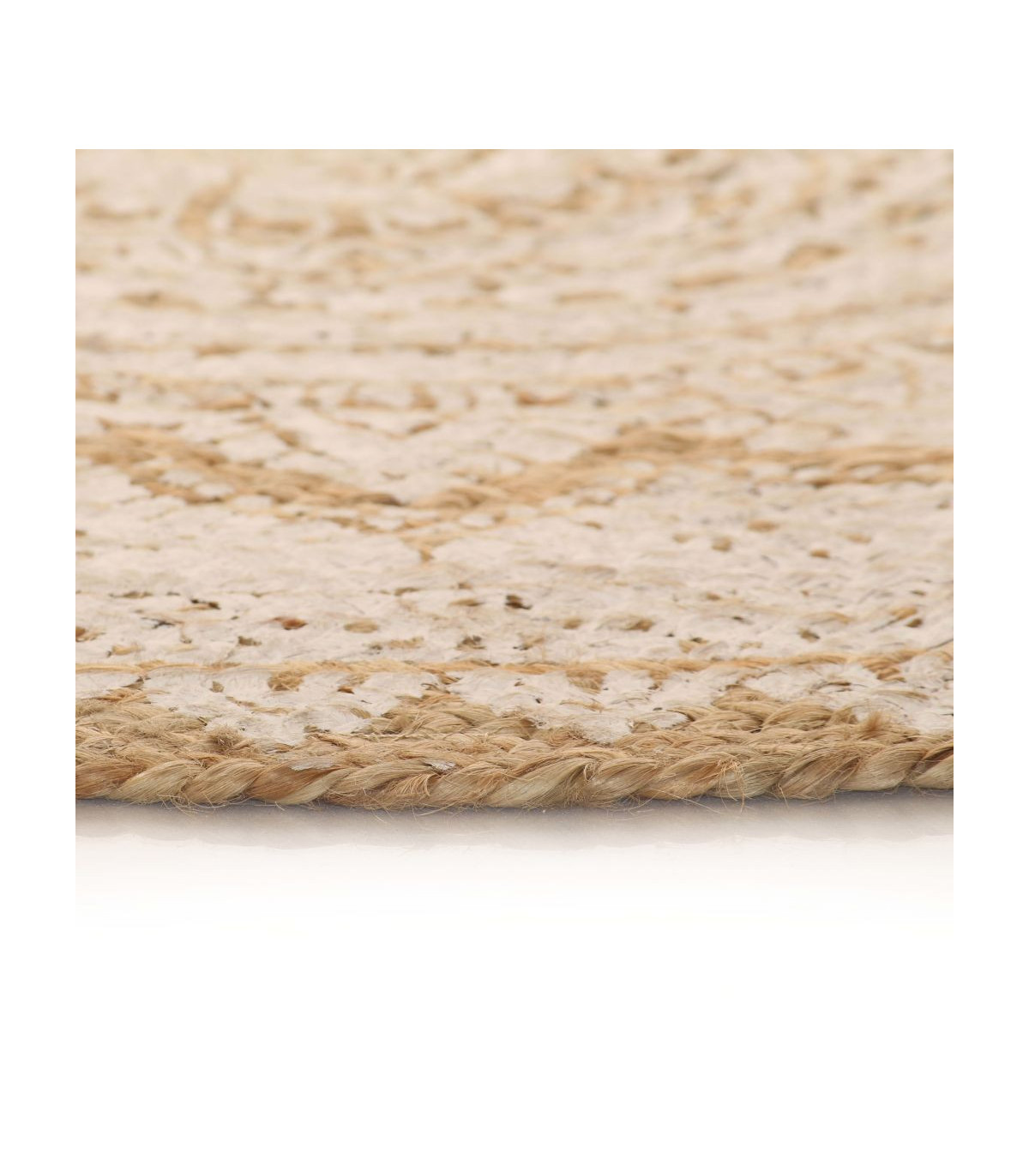 Give your interior a natural touch with this braided jute area rug! It is the perfect choice for decorating your room while protecting your floors. Durable material: The area rug is made of 100% jute. Jute is a very durable and naturally strong material and low maintenance.Handmade rug: The round carpet is handwoven by skilled artisans with exceptional craftsmanship and with its attractive texture and beautiful Mandala print, it will fit perfectly into your home decor.Versatile rug: The mat is versatile enough to be used alone or as a base for layering. The perfect rug to polish off your living room, bedroom or foyer. Note:Each rug is unique; variations in colour and design may occur due to the handmade nature of the product. The delivery is random, ensuring the exclusivity and individuality of your product.The rug is folded in a carton for easy transportation. Please allow the product some time to become perfectly straight and flat.