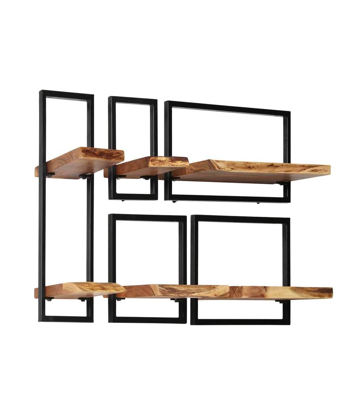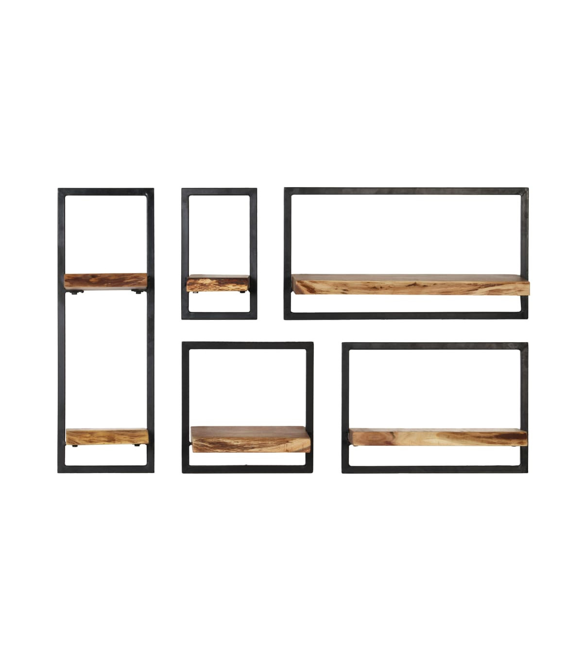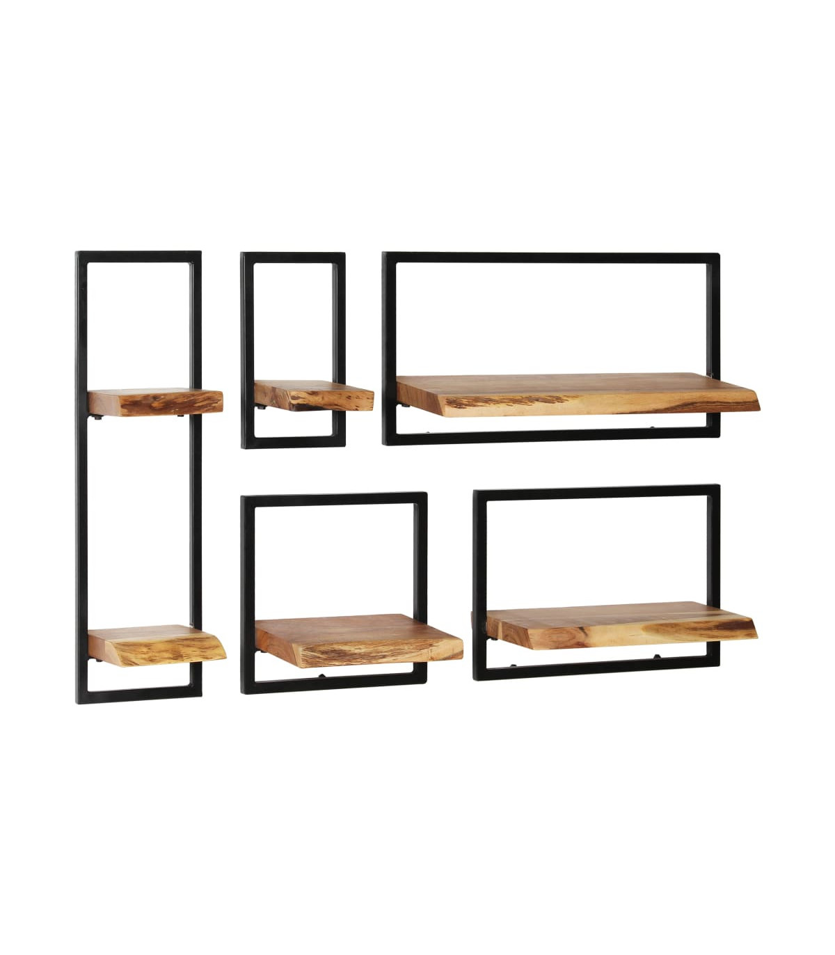 This wall shelf set consists of 5 shelf units in different sizes and will turn an empty wall into a special feature with its retro design. The solid wooden shelves are ideal for displaying various items such as books, awards, collectables, ornaments, etc. The shelf set combines solid acacia hardwood shelves with stable powder-coated steel frames. The acacia hardwood shelves are solid, stable and durable and the visible wood grains exude a rustic charm, while the steel frames add to the set's industrial look. The shelf units can be used separately or together to suit your interior decor. The wall shelf set is easy to assemble. Important note: Colours and grains may vary from piece to piece, making each of our products unique. The delivery is random.
