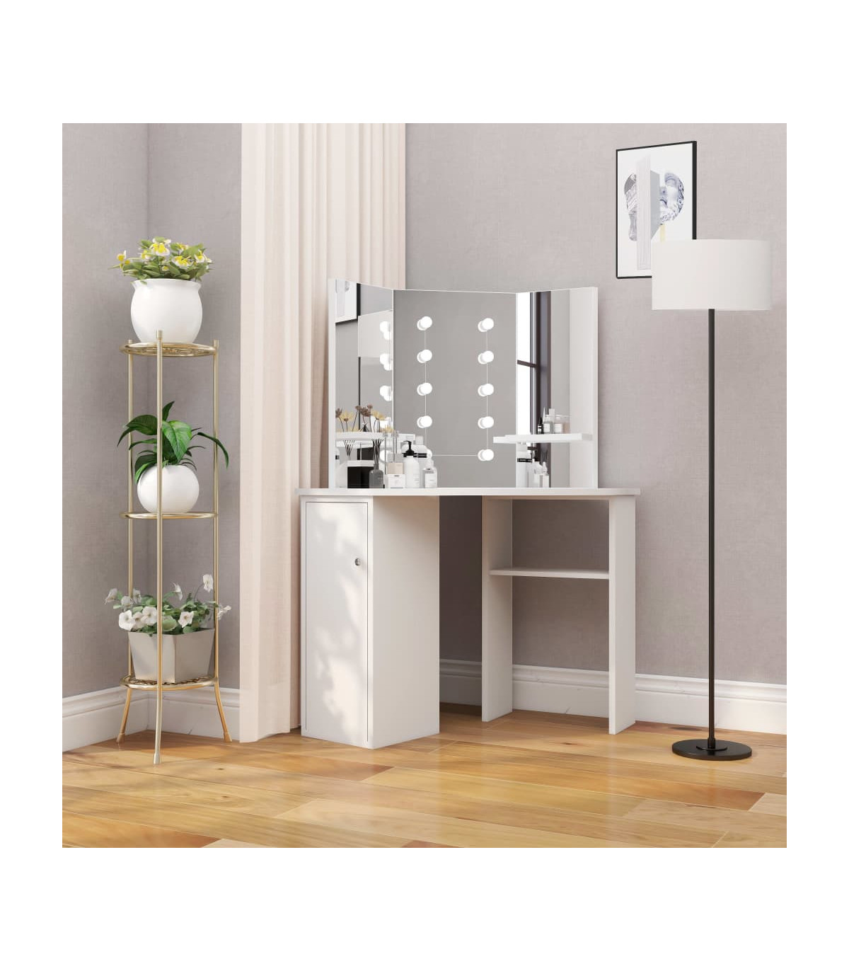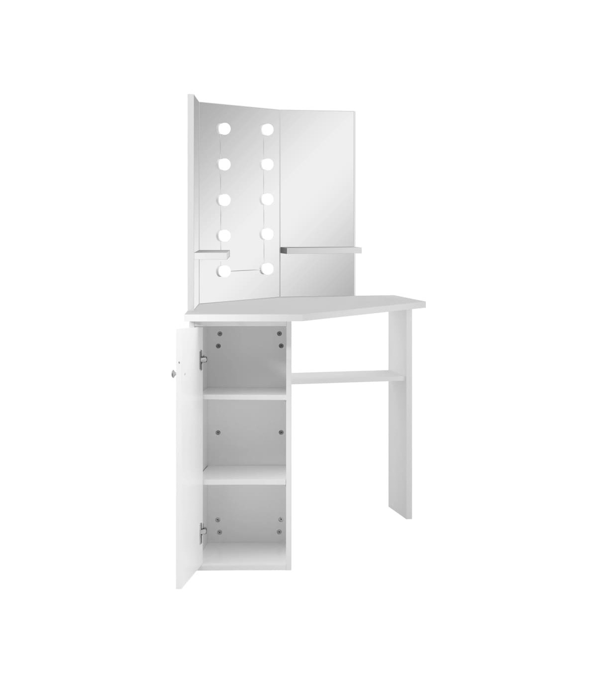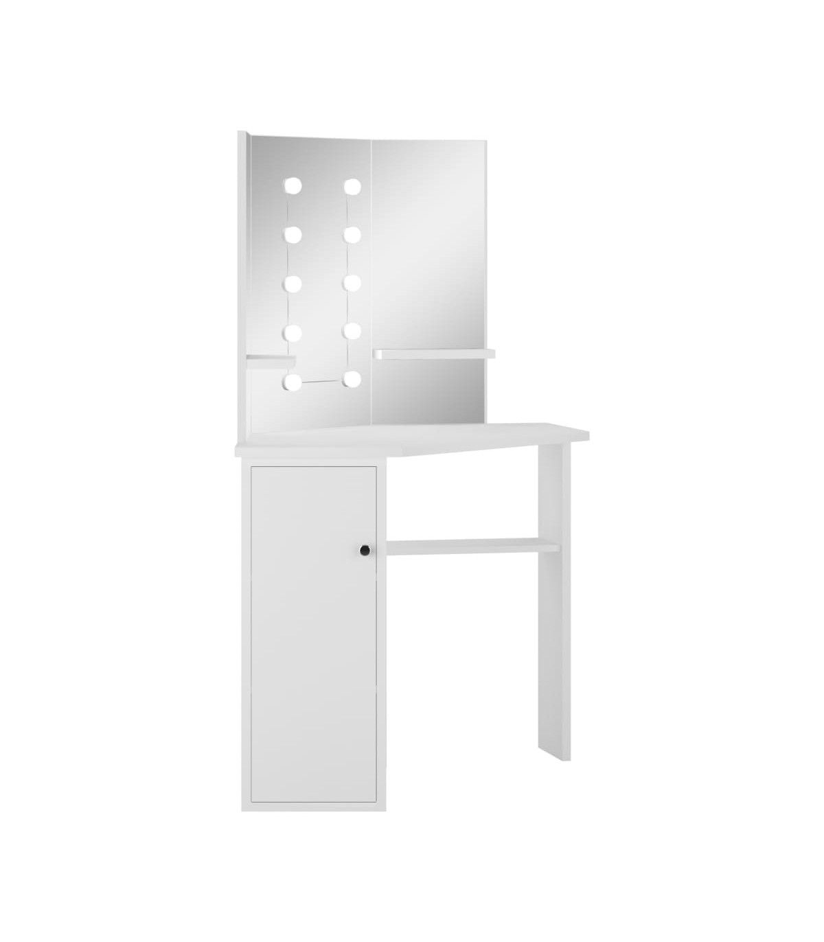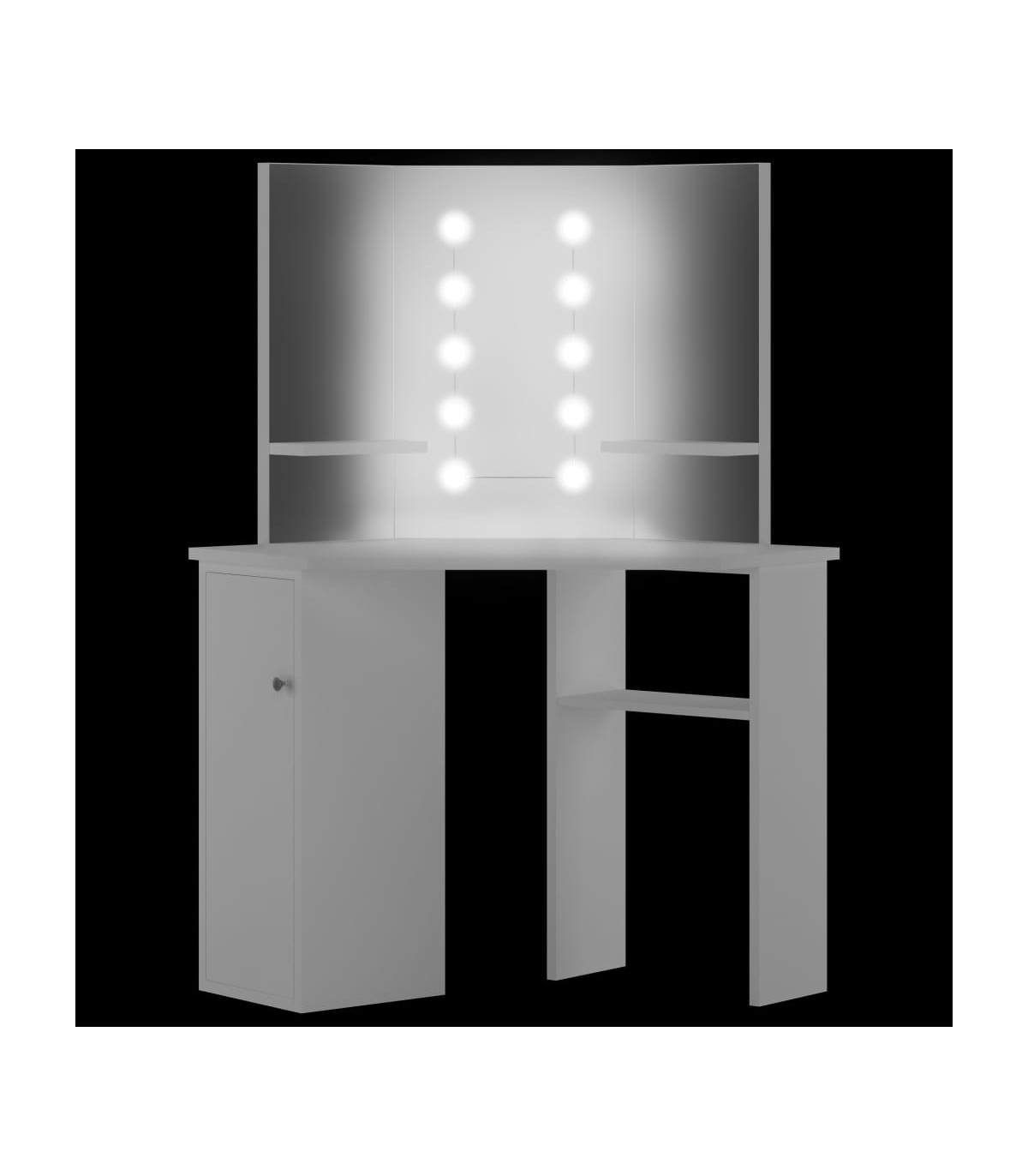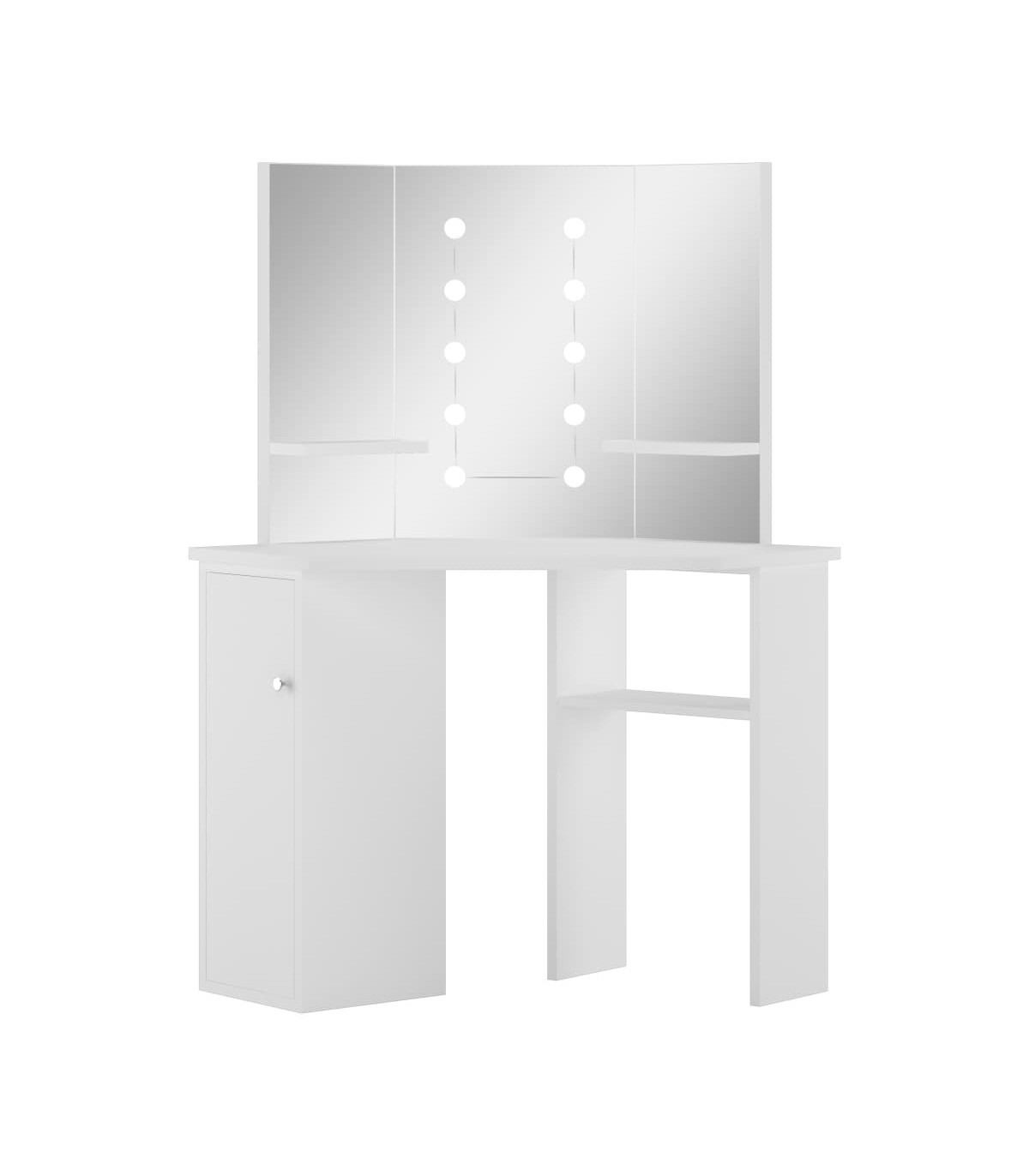 Work on your morning routine in style with this elegant vanity table! This dressing table, constructed from quality MDF, strikes a sleek and concise silhouette with a modern style. It is designed to fit snugly into a corner yet packs a lot of storage in a small amount of space! Large locker and open shelf under table offer a place for makeup items and keep everything in its place, facing sideways for easy access when seated at the table. Additionally, a beautiful 3-panel mirror provides a 3-sided view for makeup application and adds an elegant touch to the tabletop. Lower shelves are added to the two side panels for cups, makeup brushes, creams and lotions, perfumes and decorative items. The featured elegant LED bulbs illuminate your beauty as well. Note: The product has a USB connector, but the certified 5V USB power source is not included.