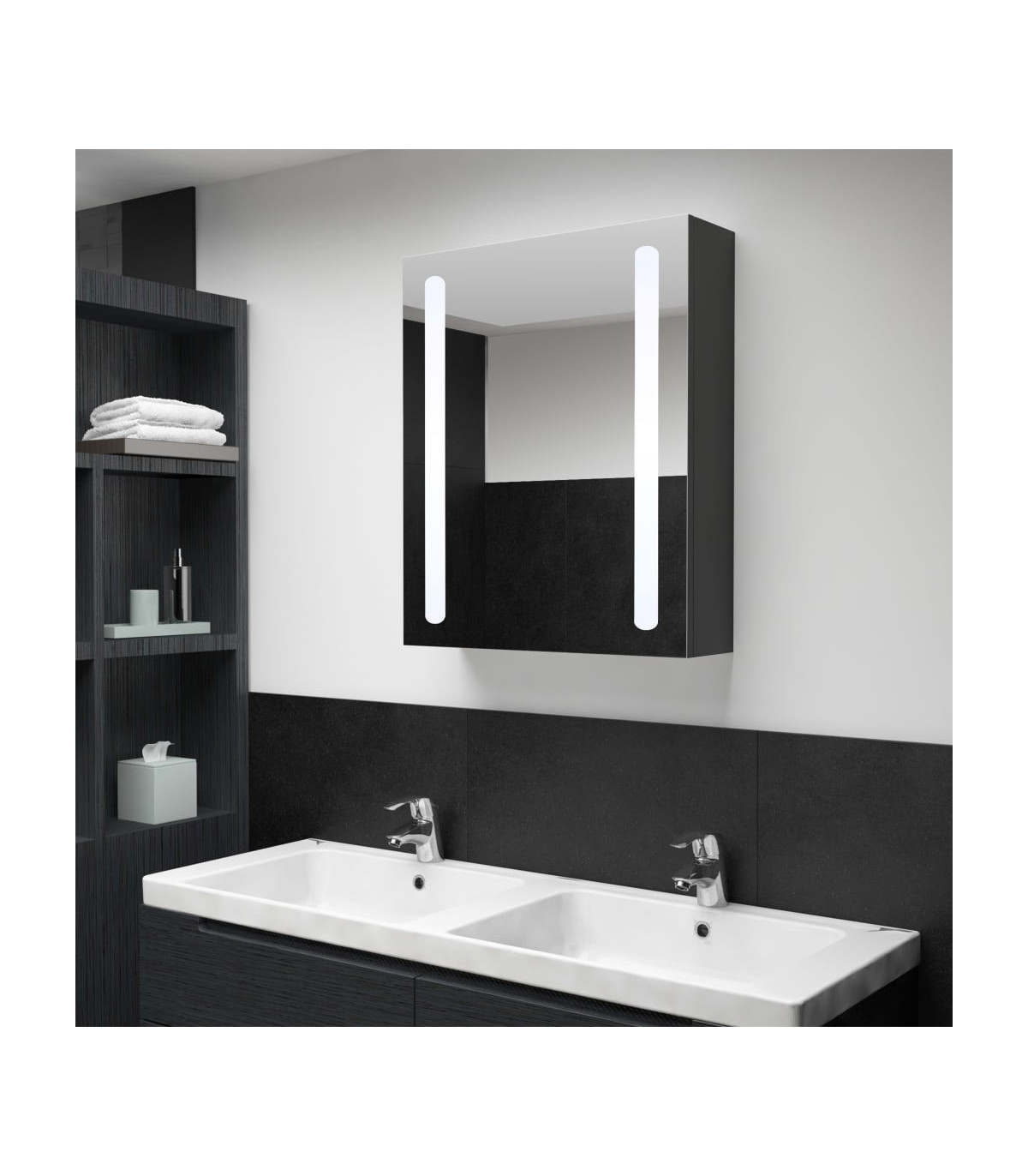 Introduce an aesthetically pleasing into your bathroom with this bathroom cabinet! The vanity mirror cabinet with LED adds a touch of contemporary style and soft illuminating light to any room! It is made of quality MDF board with melamine finish, ensuring the long term use. With dual energy-efficient LED light strips, you can see yourself in the truest light for makeup application, grooming and skincare, and it can illuminate your room, your face, and your smile. Inside includes 3 shelves, which provide ample cabinet storage for all of your toiletries and beauty accessories. You can easily switch on/off the light with the bottom button. Stylish and functional, this cabinet will surely make your room design originally exceptional! Note: The product has a USB connector, but the certified 5V USB power source is not included.