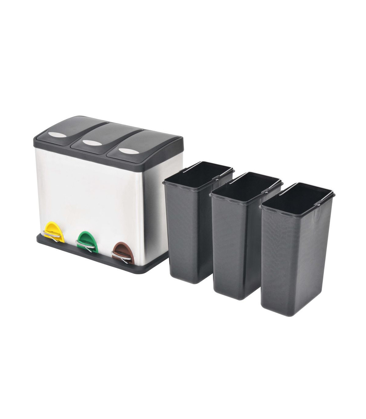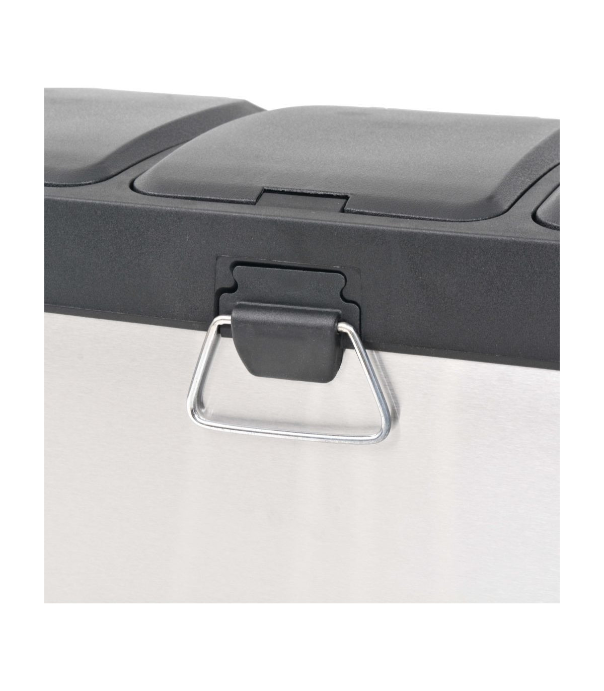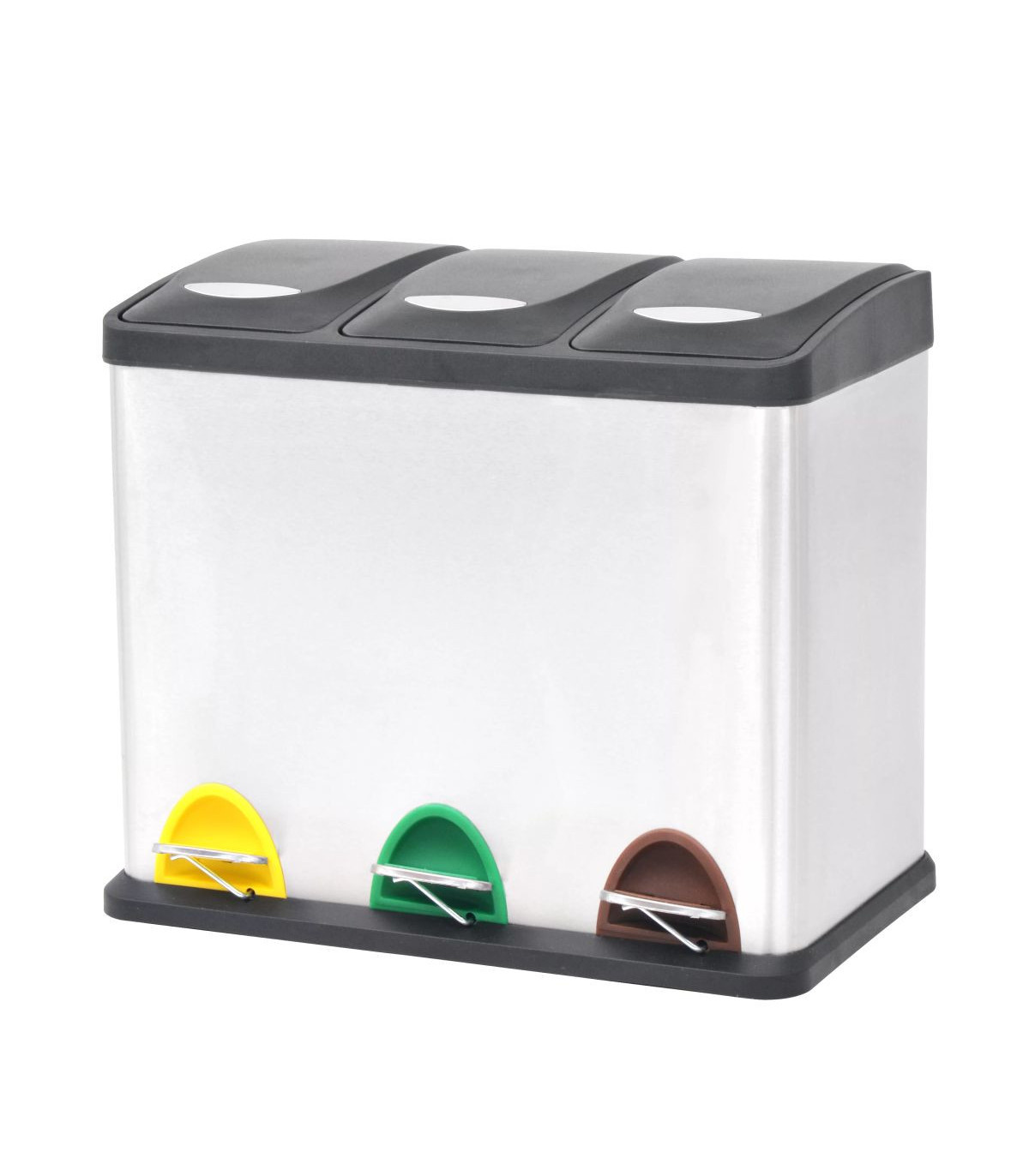 This chic, practical recycling pedal bin with soft-close lids is a must-have for your kitchen, living room, office, etc. The rubbish bin is equipped with 3 removable inner buckets for sorting the waste. You can effortlessly open or close the lids by pressing the pedals. The slots behind the pedals are colour-coded, which helps you to sort the trash more conveniently. The recycling bin has a stainless steel housing with a matte finish, which gives it a chic look. The inner buckets, lids and base are made of durable polypropylene (PP). The soft-close lids open/close quietly. When closed, the lids will prevent odours from spreading. Each inner bucket has a large handle and can be easily removed.
