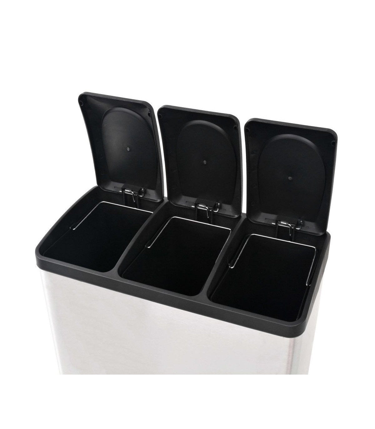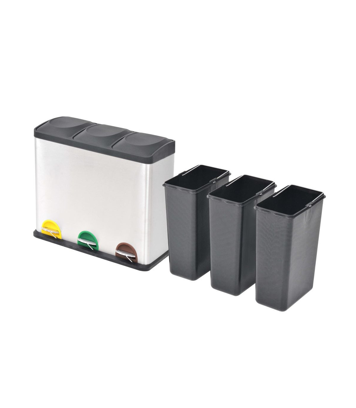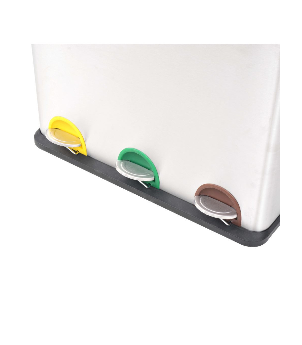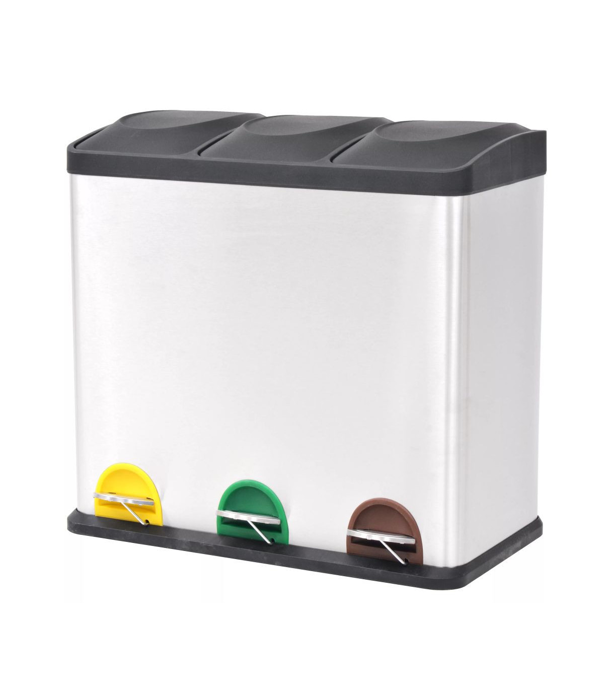 This chic, practical recycling pedal bin with soft-close lids is a must-have for your kitchen, living room, office, etc. The rubbish bin is equipped with 3 removable inner buckets for sorting the waste. You can effortlessly open or close the lids by pressing the pedals. The slots behind the pedals are colour-coded, which helps you to sort the trash more conveniently. The recycling bin has a stainless steel housing with a matte finish, which gives it a chic look. The inner buckets, lids and base are made of durable polypropylene (PP). The soft-close lids open/close quietly. When closed, the lids will prevent odours from spreading. Each inner bucket has a large handle and can be easily removed.