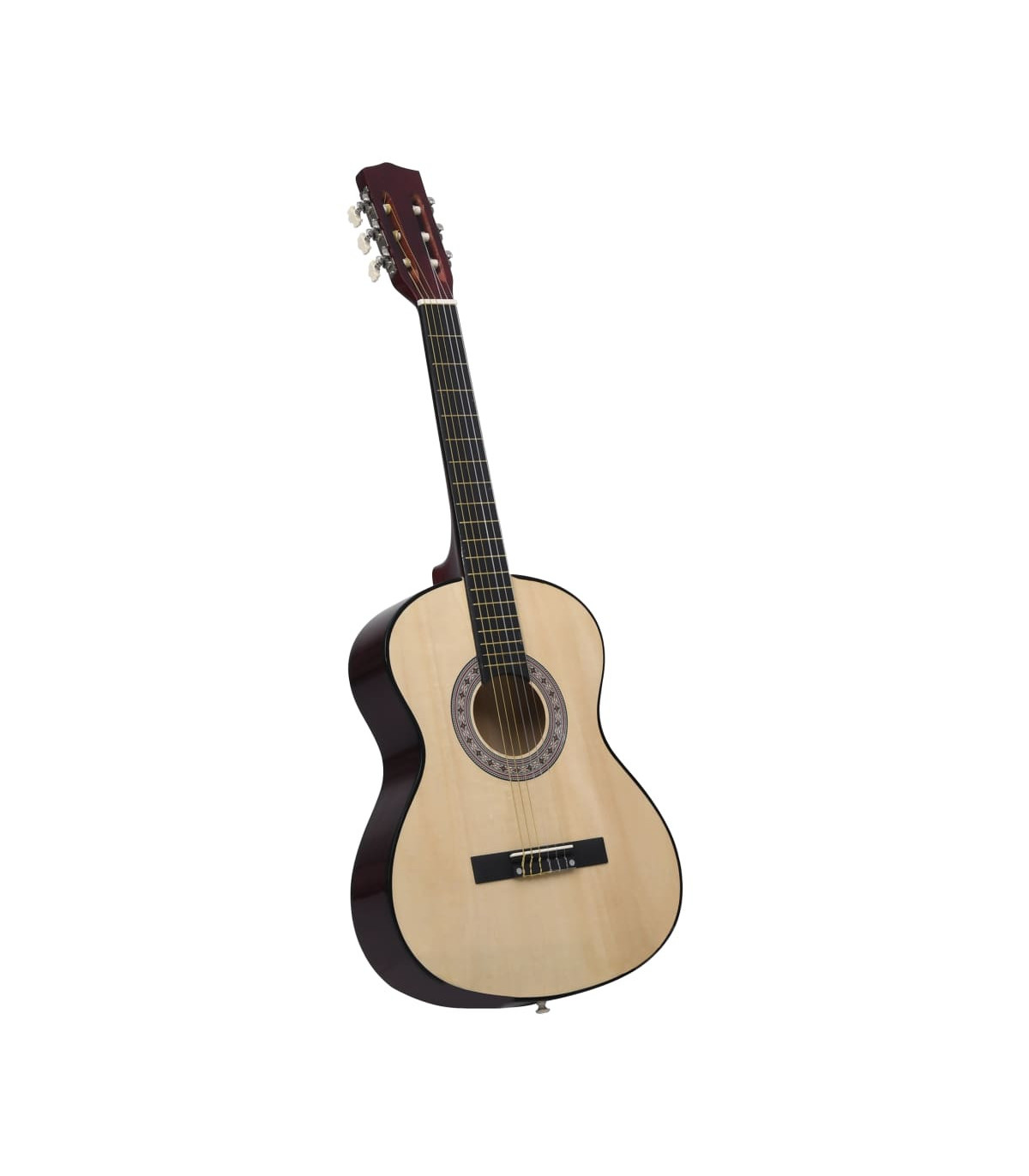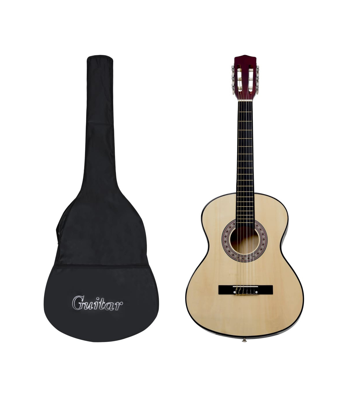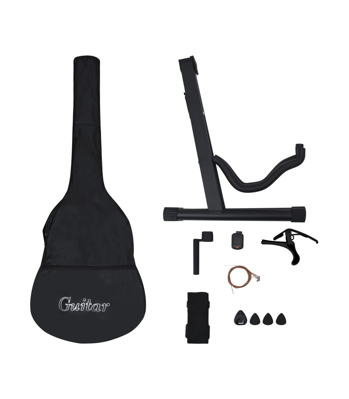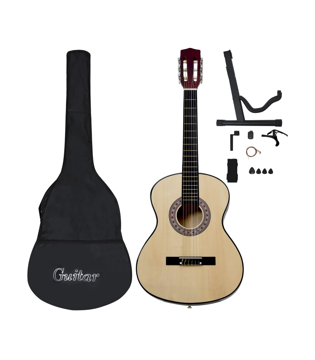 Our classical guitar is a great instrument for beginners, amateurs and any level musicians. In addition to a guitar, the pack comes with a guitar bag, strap, picks, pick holder, guitar string set, string crank, capo, chromatic tuner and guitar holder. This guitar is made of solid basswood with hard plastic buttons and fingerboard. The excellent sound quality and beautiful classic design make it very valuable. With a scale of 65 cm, this guitar has everything you need to become the next guitar player. The tuner can help tune the guitar strings better, while the capo can help to adjust the tone of the guitar. The 3 picks are used for plucking strings and can be put in the pick holder. It is usually a substitute for the fingers, but it can also be played with fingers together. The string crank, as a useful tool, makes the process of replacing strings easier. The included bag with a strap is perfect for traveling musicians and easy storage. Additionally, you can place your guitar in the guitar holder, which is very convenient. Our guitar set is easy to assemble.