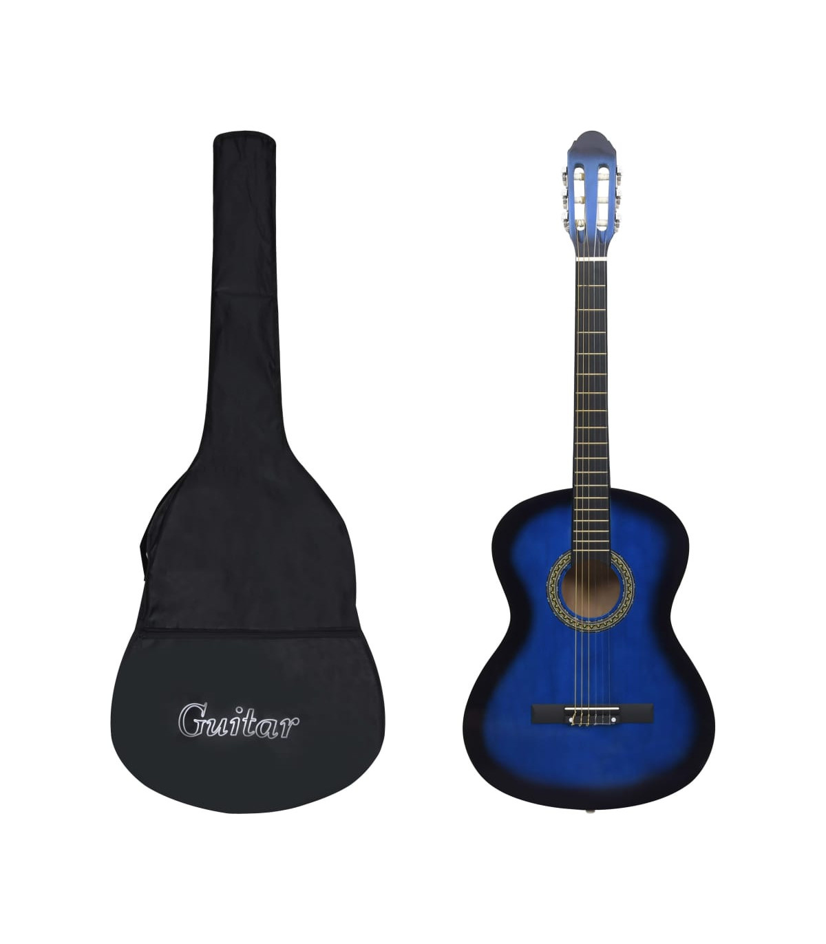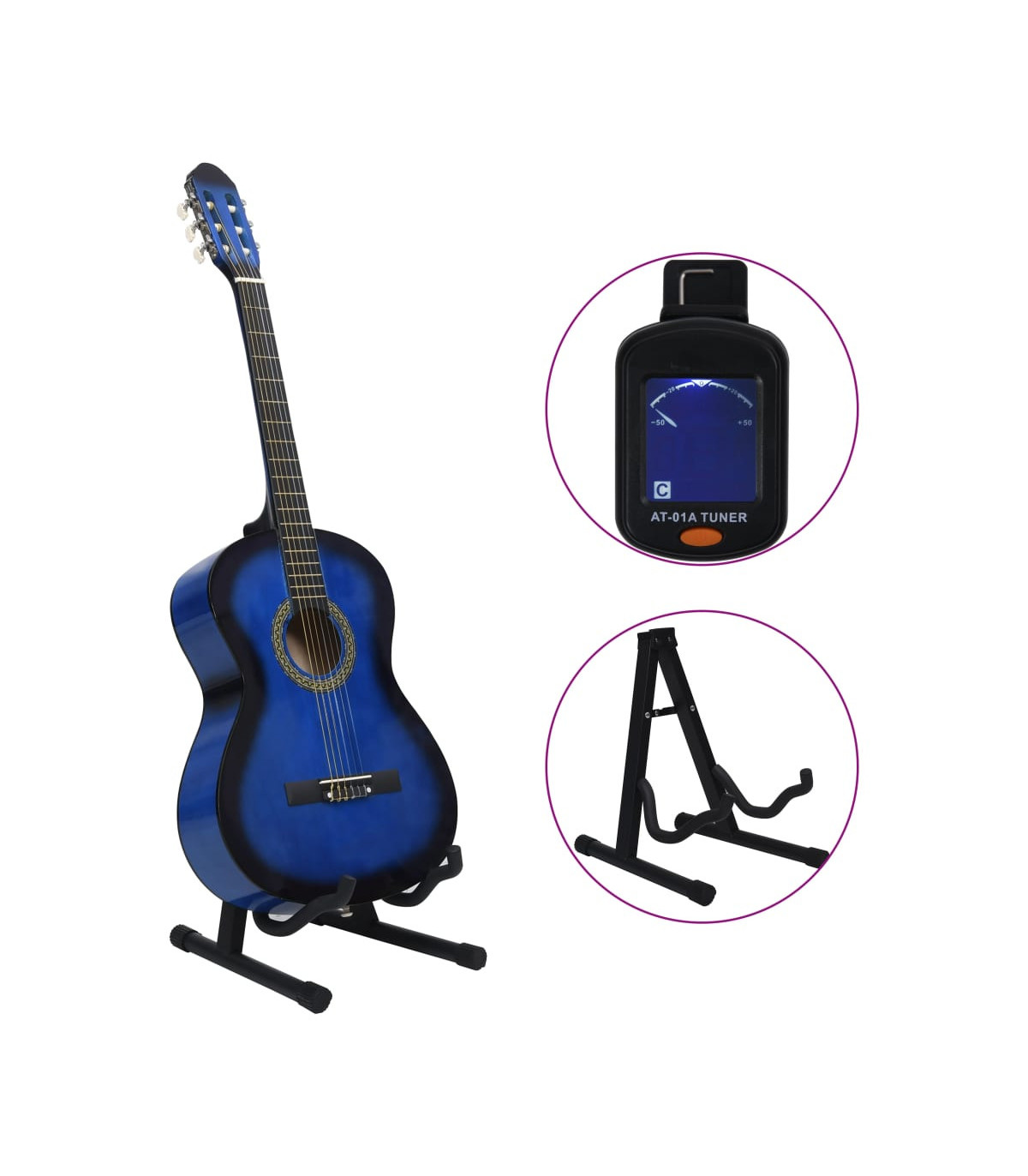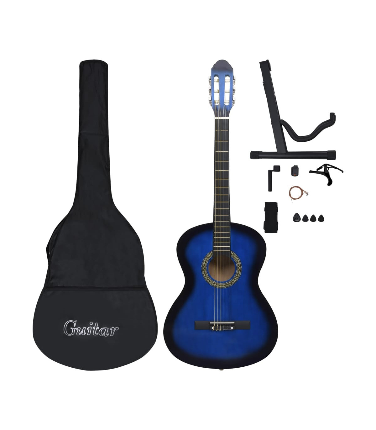 Our classical guitar is a great instrument for beginners, amateurs and any level musicians. In addition to a guitar, the pack comes with a guitar bag, strap, picks, pick holder, guitar string set, string crank, capo, chromatic tuner and guitar holder. This guitar is made of solid basswood with hard plastic buttons and fingerboard. The excellent sound quality and beautiful classic design make it very valuable. With a scale of 65 cm, this guitar has everything you need to become the next guitar player. The tuner can help tune the guitar strings better, while the capo can help to adjust the tone of the guitar. The 3 picks are used for plucking strings and can be put in the pick holder. It is usually a substitute for the fingers, but it can also be played with fingers together. The string crank, as a useful tool, makes the process of replacing strings easier. The included bag with a strap is perfect for traveling musicians and easy storage. Additionally, you can place your guitar in the guitar holder, which is very convenient. Our guitar set is easy to assemble.