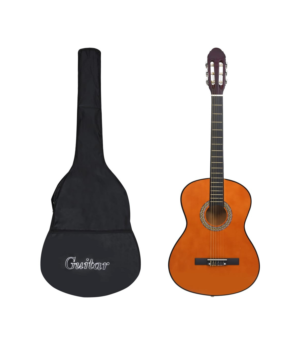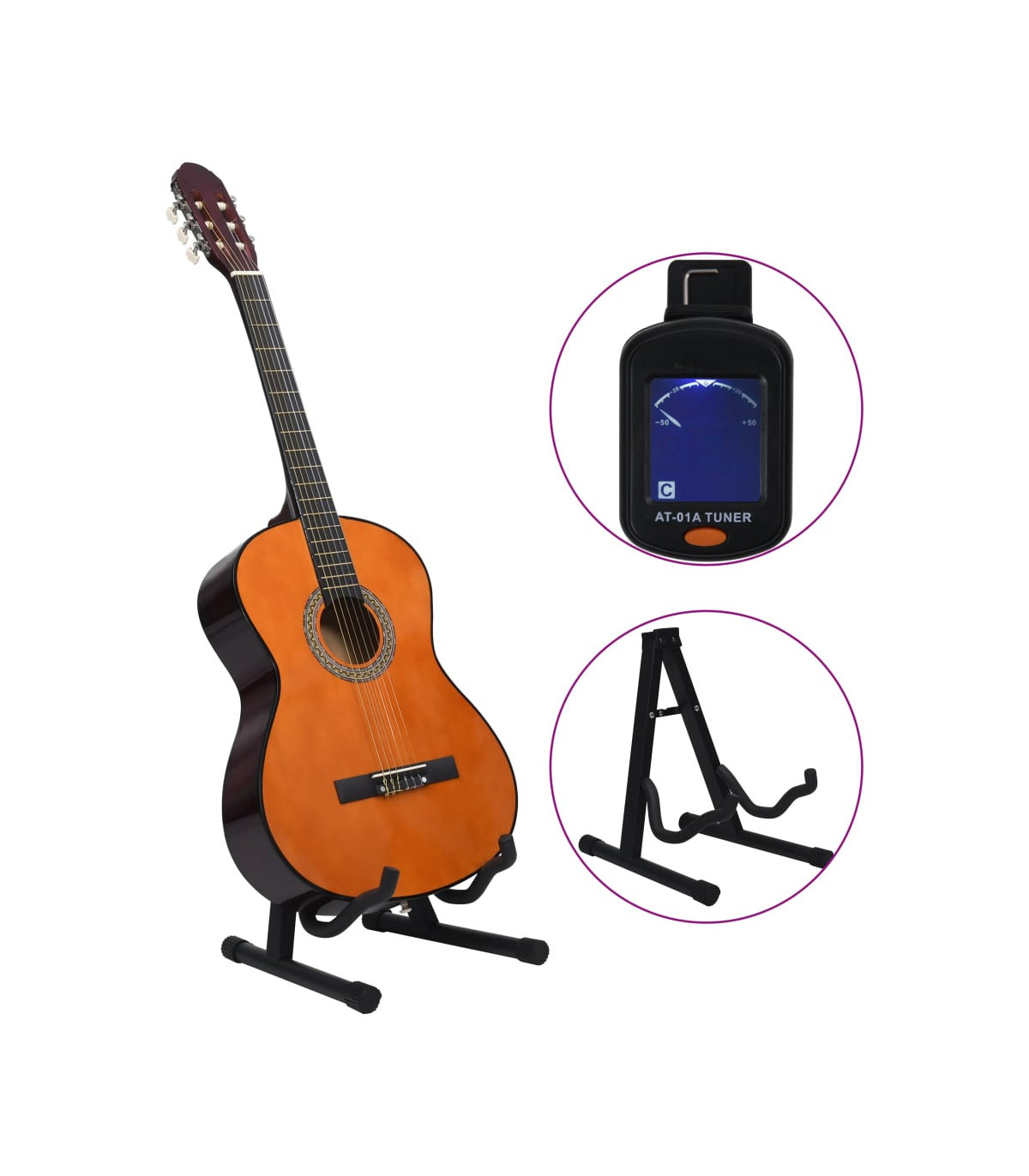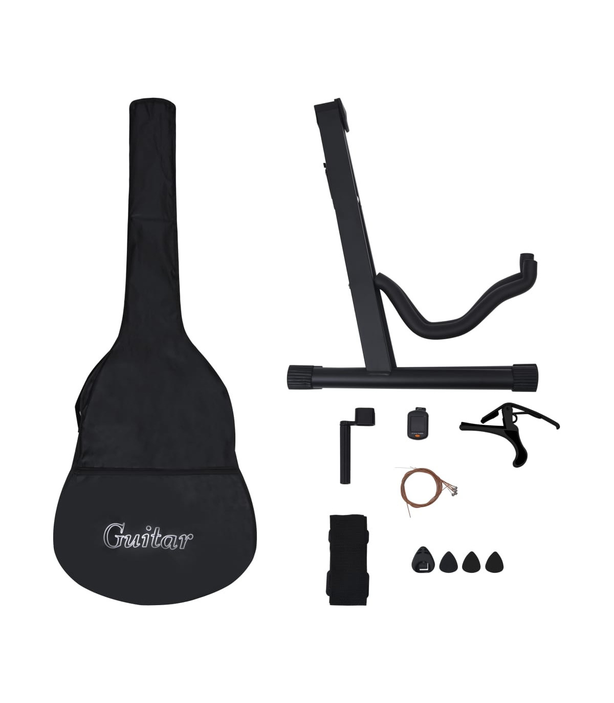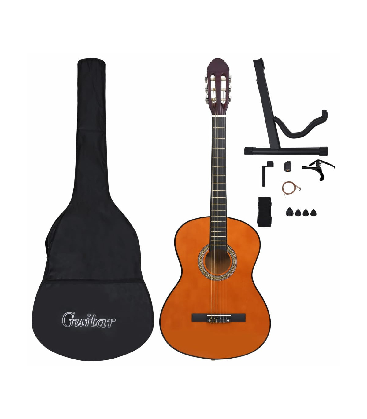 Our classical guitar is a great instrument for beginners, amateurs and any level musicians. In addition to a guitar, the pack comes with a guitar bag, strap, picks, pick holder, guitar string set, string crank, capo, chromatic tuner and guitar holder. This guitar is made of solid basswood with hard plastic buttons and fingerboard. The excellent sound quality and beautiful classic design make it very valuable. With a scale of 65 cm, this guitar has everything you need to become the next guitar player. The tuner can help tune the guitar strings better, while the capo can help to adjust the tone of the guitar. The 3 picks are used for plucking strings and can be put in the pick holder. It is usually a substitute for the fingers, but it can also be played with fingers together. The string crank, as a useful tool, makes the process of replacing strings easier. The included bag with a strap is perfect for traveling musicians and easy storage. Additionally, you can place your guitar in the guitar holder, which is very convenient. Our guitar set is easy to assemble.