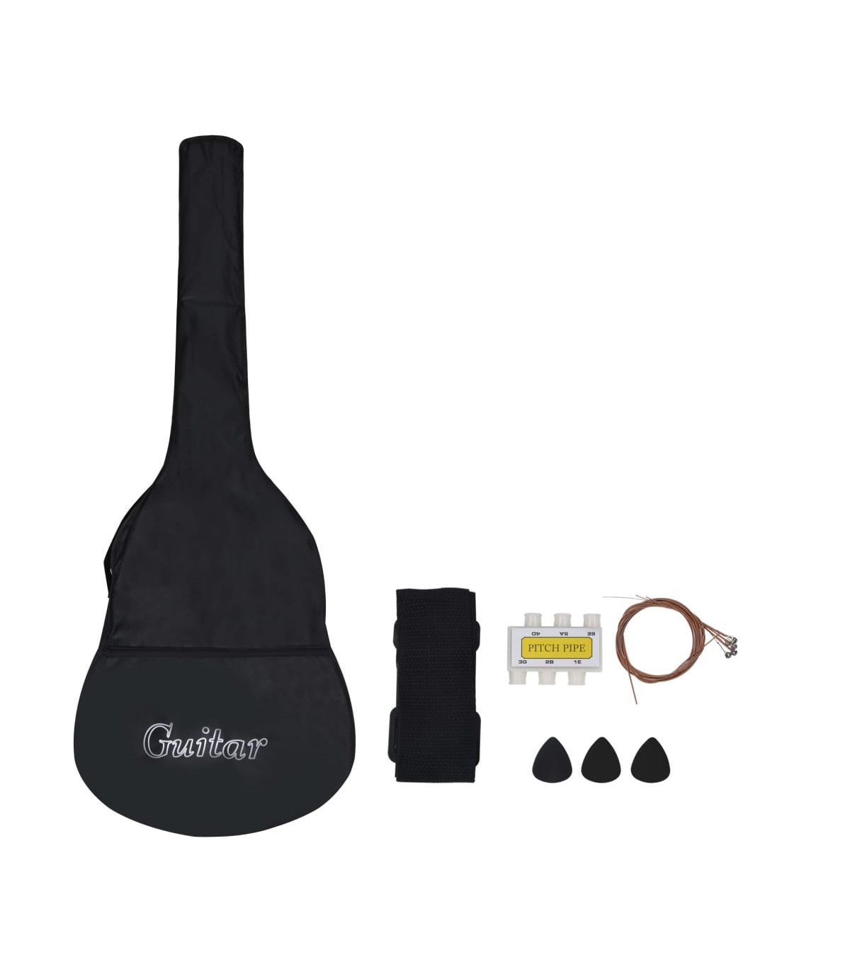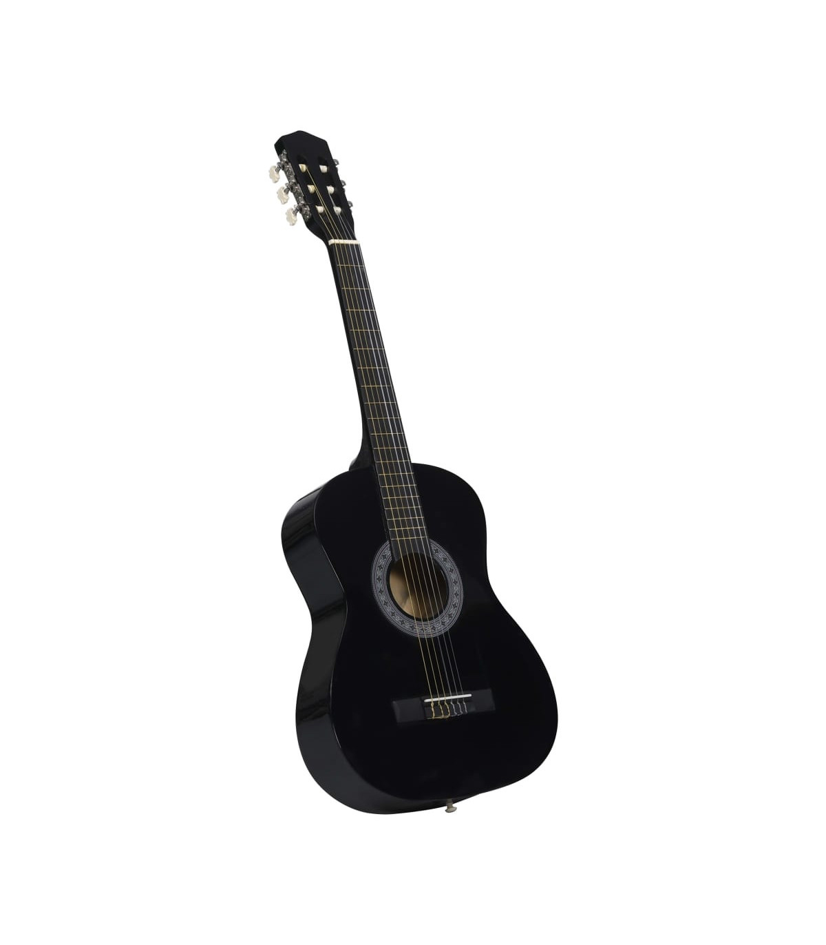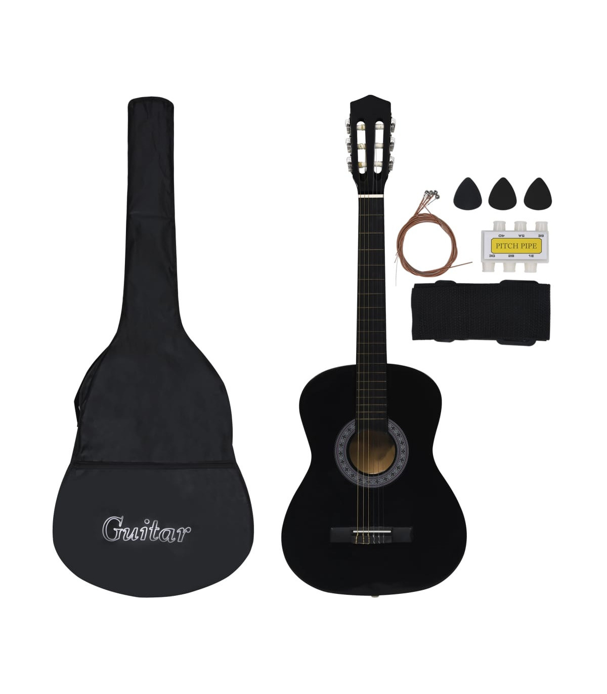 Our classical guitar is a great instrument for beginners, amateurs and any level musicians. In addition to a guitar, the pack comes with a guitar bag, strap, picks, pick holder, guitar string set, string crank, capo, chromatic tuner and guitar holder. This guitar is made of solid basswood with hard plastic buttons and fingerboard. The excellent sound quality and beautiful classic design make it very valuable. With a scale of 65 cm, this guitar has everything you need to become the next guitar player. The tuner can help tune the guitar strings better, while the capo can help to adjust the tone of the guitar. The 3 picks are used for plucking strings and can be put in the pick holder. It is usually a substitute for the fingers, but it can also be played with fingers together. The string crank, as a useful tool, makes the process of replacing strings easier. The included bag with a strap is perfect for traveling musicians and easy storage. Additionally, you can place your guitar in the guitar holder, which is very convenient. Our guitar set is easy to assemble.