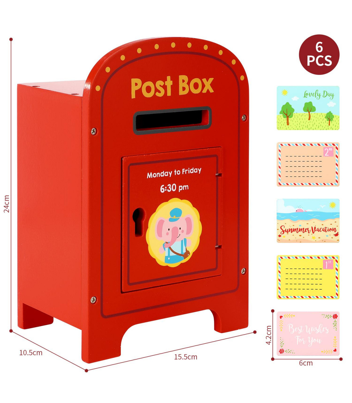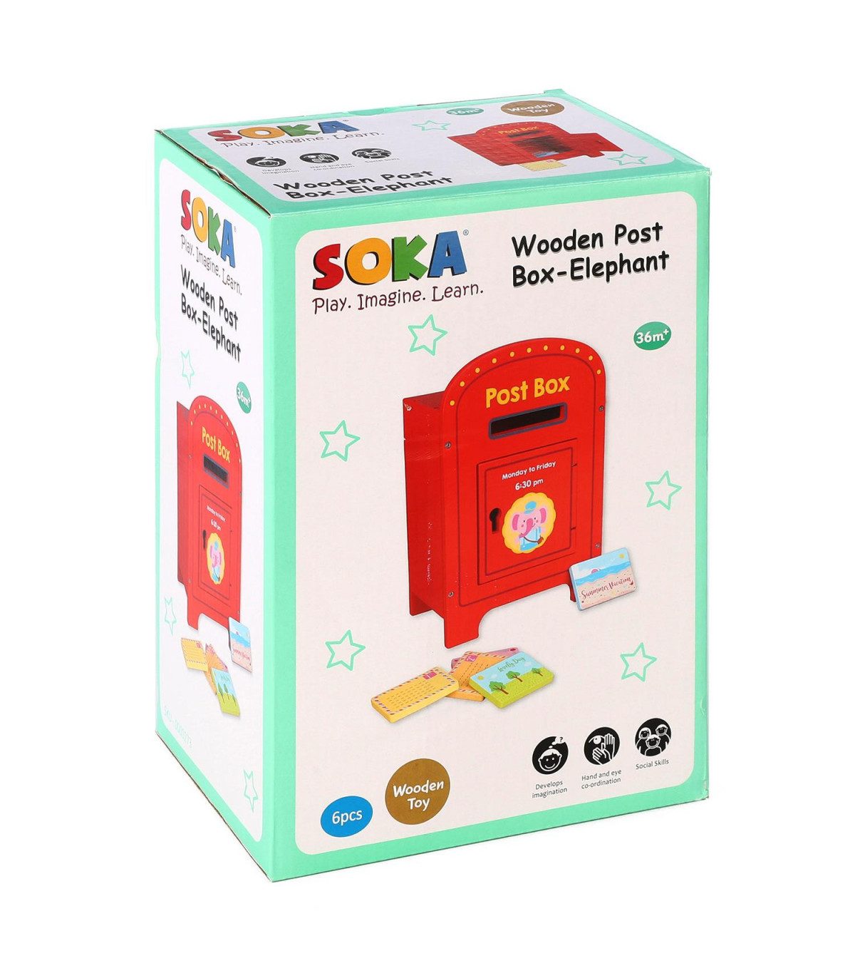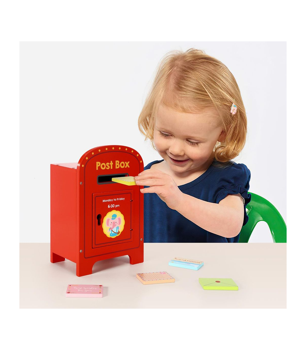 PRETEND/ROLE PLAY: Play at posting colourful letters at the cute elephant post box. There are five wooden letters that need to be delivered to the post office on time: pick a colour and post it into the post box so the postman can come and pick them up la