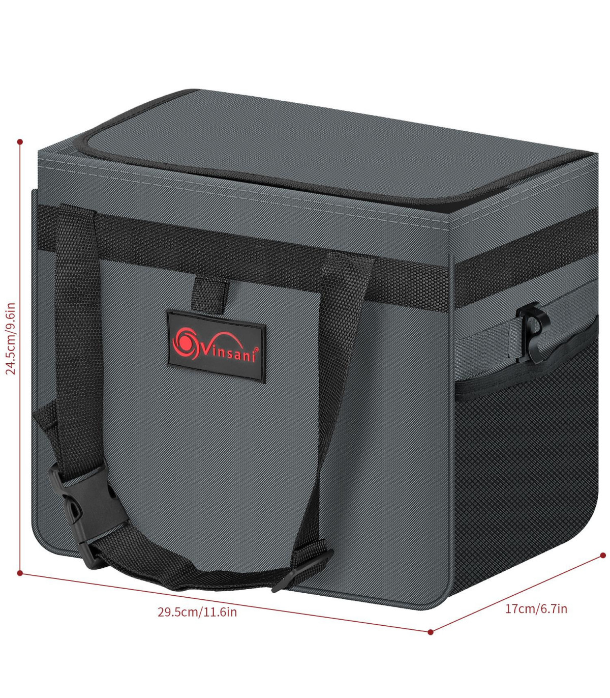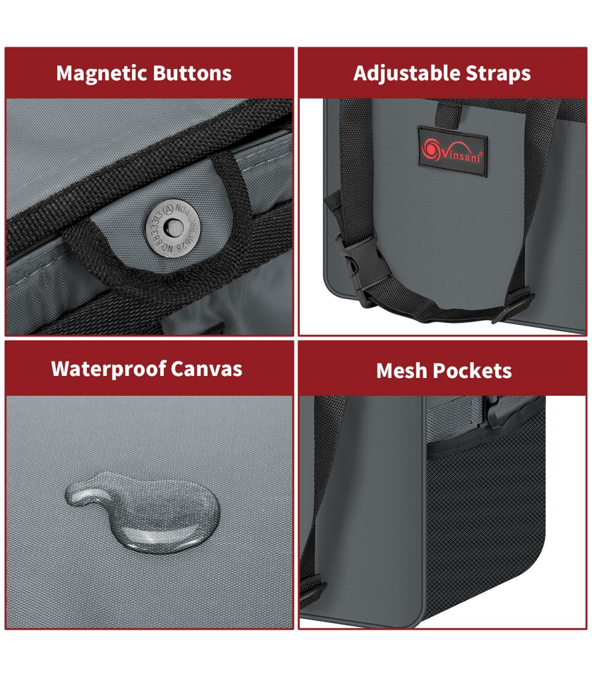 CLUTTER-FREE CAR: Do you have a lot of clutter in your car and are tired of it? This car rubbish bin will help keep your car tidy and organised. WELL-DESIGNED: This car bin boasts several great design features: waterproof canvas, solid & sturdy sidewalls, strong and adjustable straps, magnetic buttons, mesh pockets and a bag fixing hook. It can be easily folded into a compact size for convenient storage when not in use. MULTIFUNCTIONAL: Our Vinsani Car Bin doubles as a storage bin for kids' toys, beverages, tools, car manuals, route maps, and other trip essentials, as well as important papers. It could also be used as a cooler bag for travel. The insulated waterproof and leakproof lining retain ice to keep drinks and food cold for hours. SPACE SAVER: This car bin takes up minimal room in the car because it has an adjustable strap and may be hung on the front or rear of a chair or placed on the front or back passenger seat floor. A practical and convenient solution in keeping organized whether traveling or on vacation. PRODUCT DIMENSIONS: LARGE: L17 x W29.5 x H24.5 cm (6.7 x 11.6 x 9.6 inches) MEDIUM: L15 x W24 x H22 cm (6 x 9.4 x 8.6 inches)