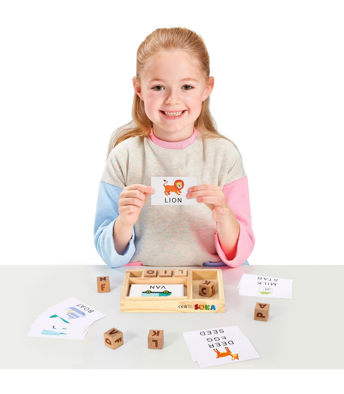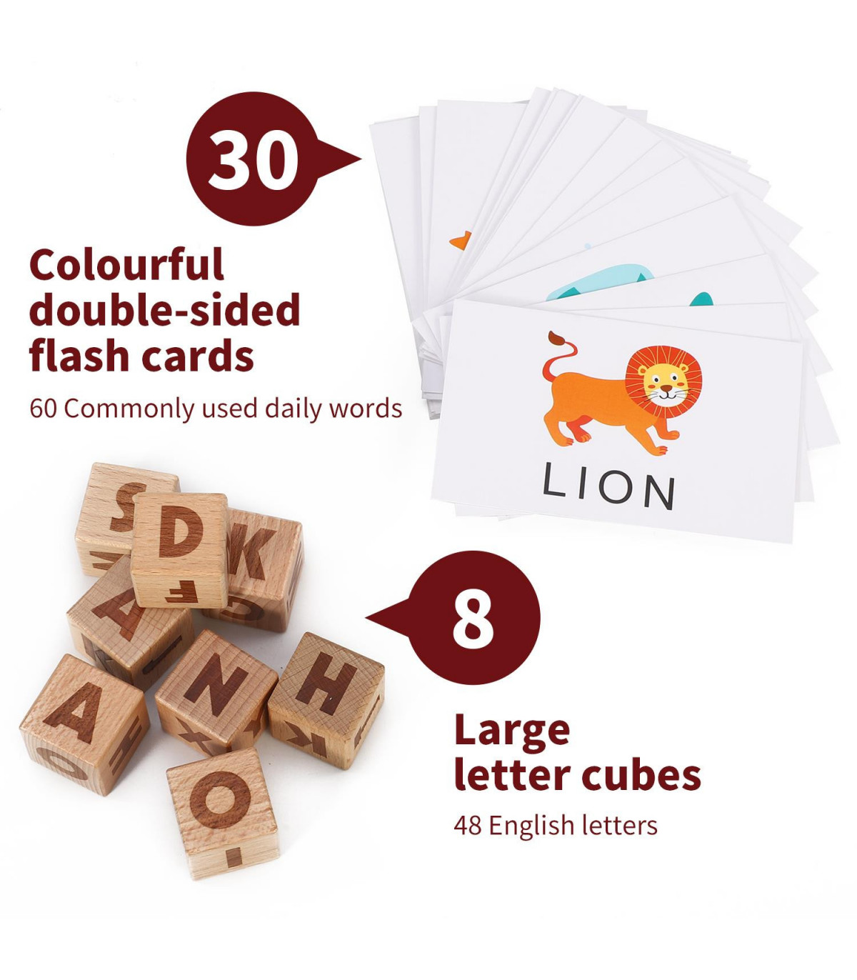 PACKAGE INCLUDING: 1 wooden tray, 8 large alphabet cubes, and 30 colourful double-sided picture cards (60 commonly used words).