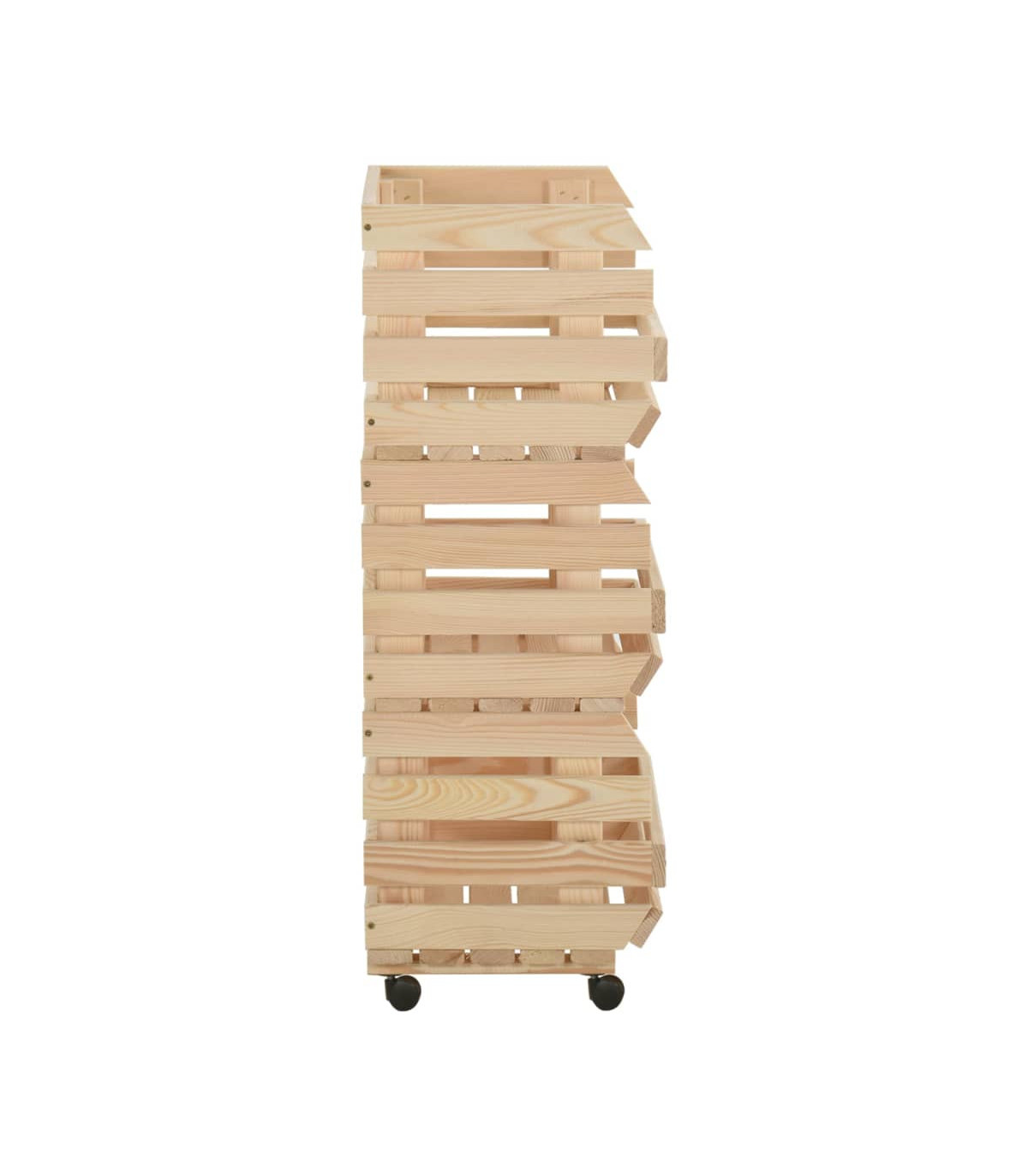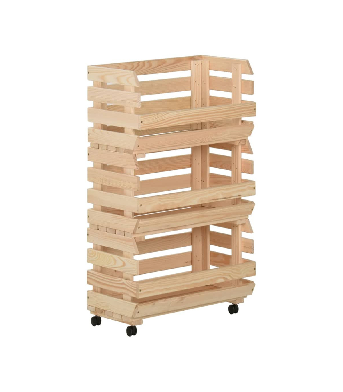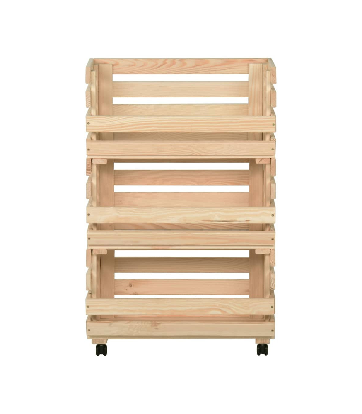 This kitchen trolley adds a distinctive and rustic atmosphere and offers added storage space to your home. This fruit box is made of solid pinewood, making it stable and durable. The storage trolley features 3 compartments to place food, bottles and other essentials within reach. Thanks to its detachable design, you can use each shelf individually as needed. Additionally, the kitchen cart is equipped with flexible wheels for an easy shift.