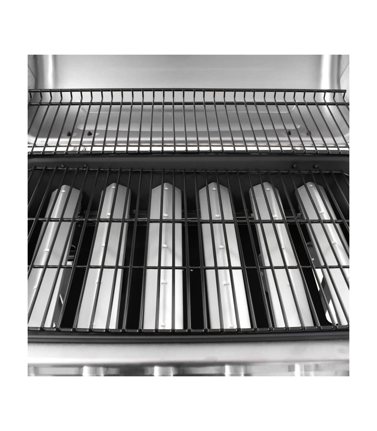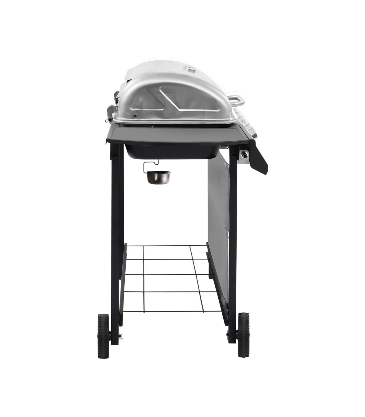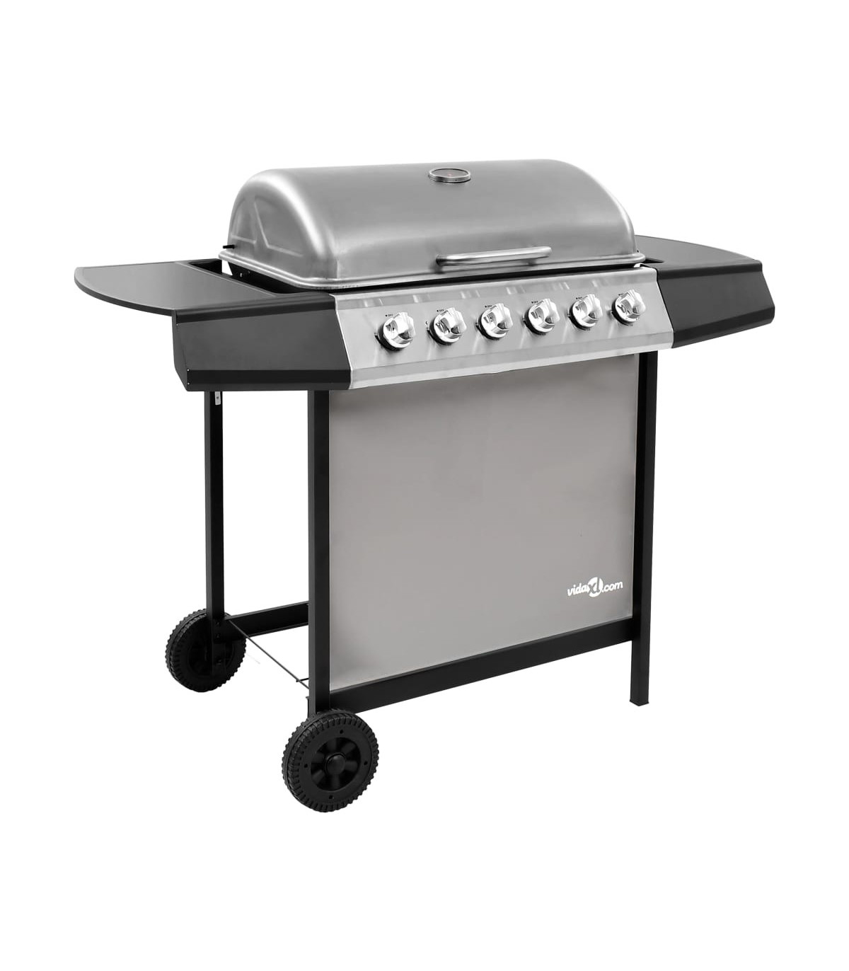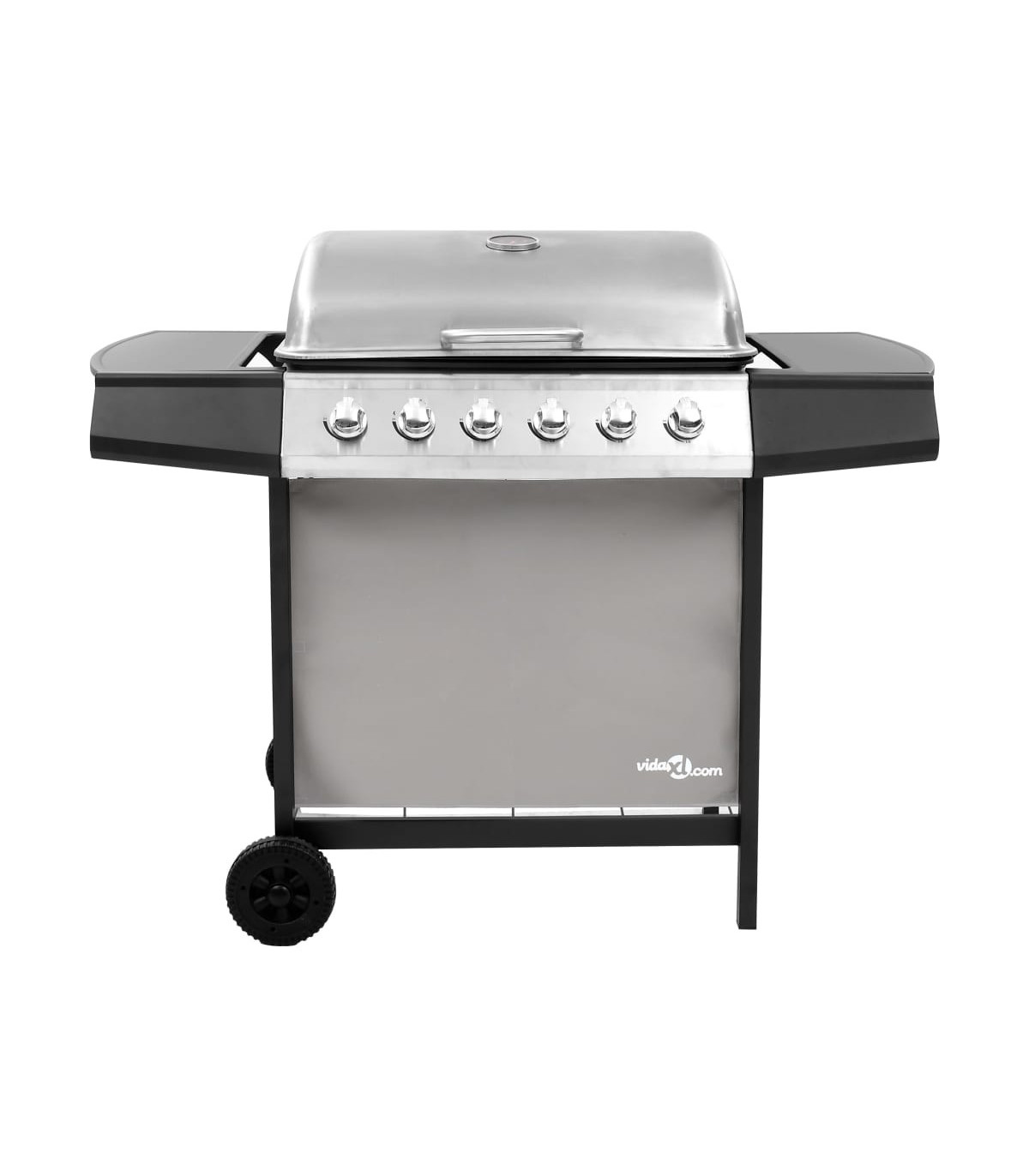 This gas BBQ grill, with 6 burners, is ideal for creating an outdoor feast for your family and friends. It will make your outdoor cooking experience sizzle, effectively turning your backyard into a second kitchen! The gas grill features a stylish and functional design. It has a large cooking surface and a heavy-duty hood with a built-in thermometer which accurately displays the cooking temperature. Side tables offer additional workspace for making sauces or your favourite side dishes. A removable grease drip container is also included, which is easy to clean. Made of heavy-duty materials, the grill is very durable. The shelf underneath provides large space to store cookware and utensils. Thanks to the 2 sturdy castors, the grill is easy to move around. Delivery also includes a BBQ cover to protect the grill from rain and dust. To connect the barbecue to the gas cylinder, a gas hose and a proper pressure regulator are required, which are not included in delivery.